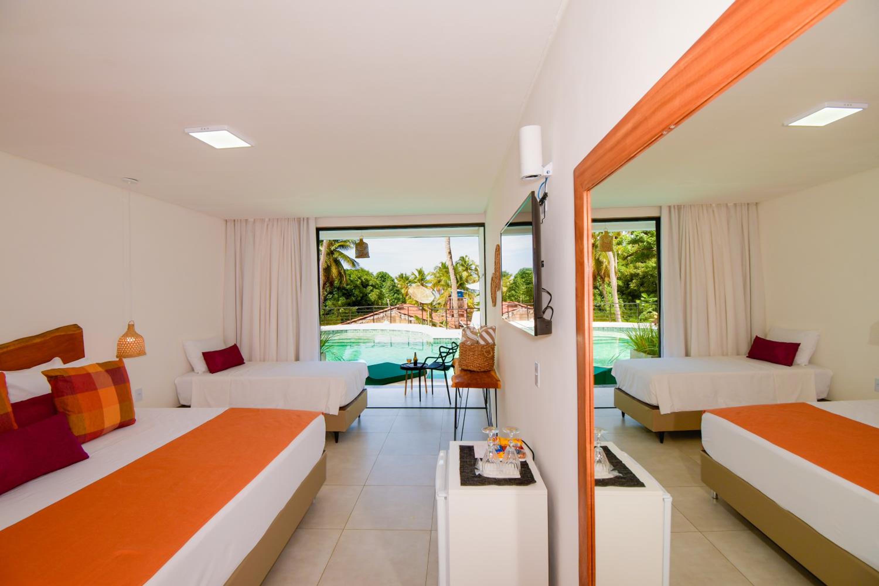 Experience comfort and convenience in our air-conditioned rooms, each equipped with a flat-screen TV, private bathroom, and balcony offering stunning pool views.