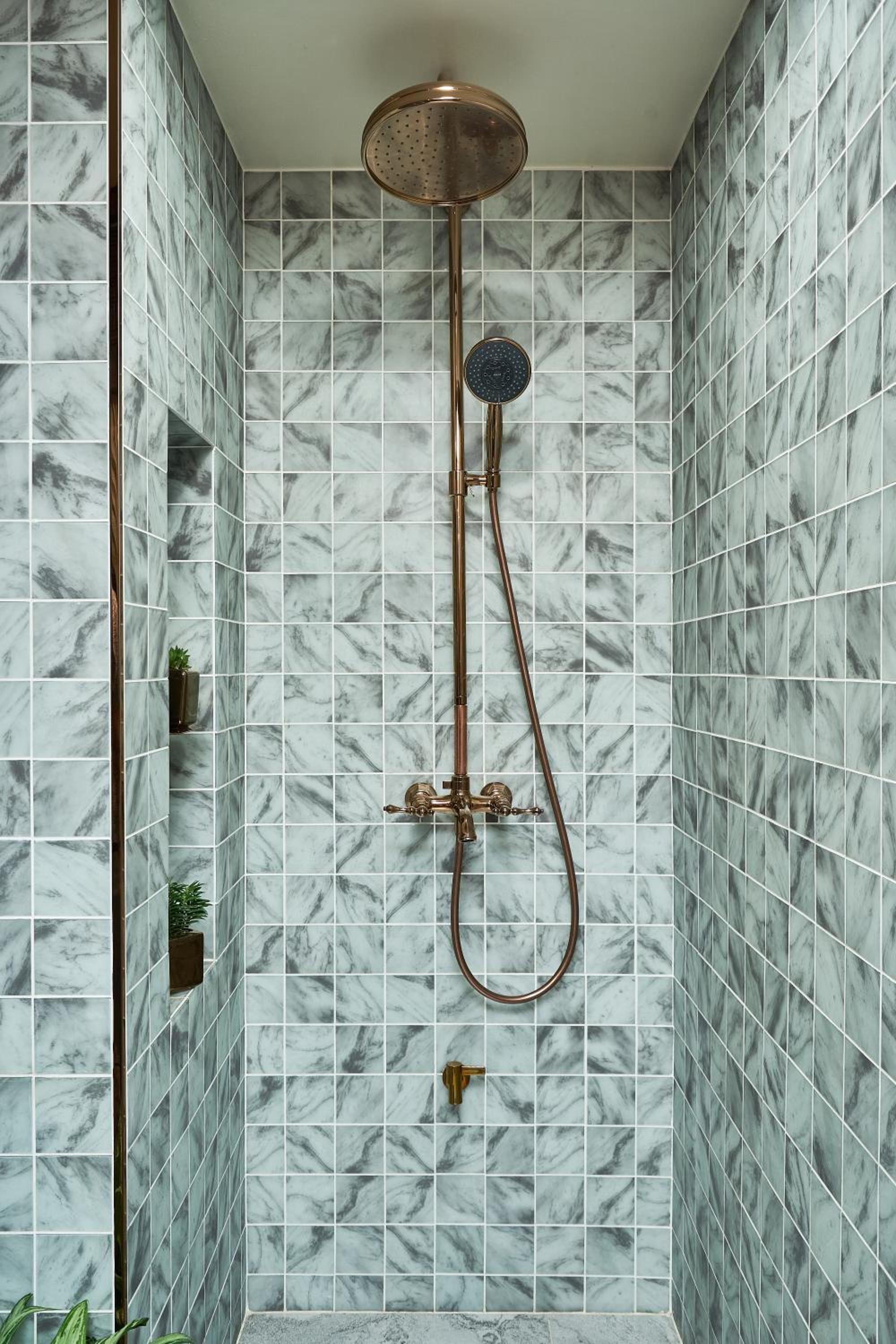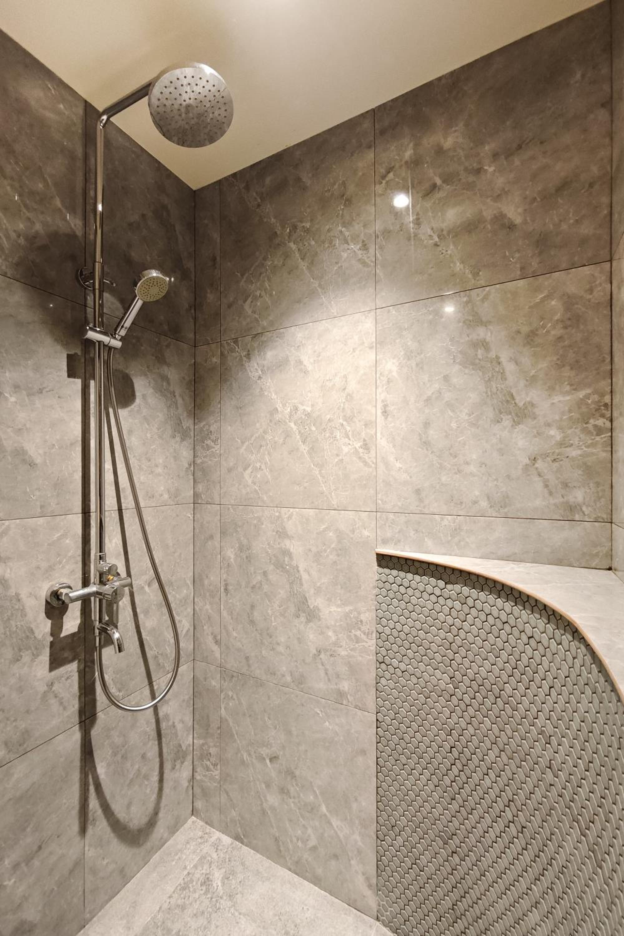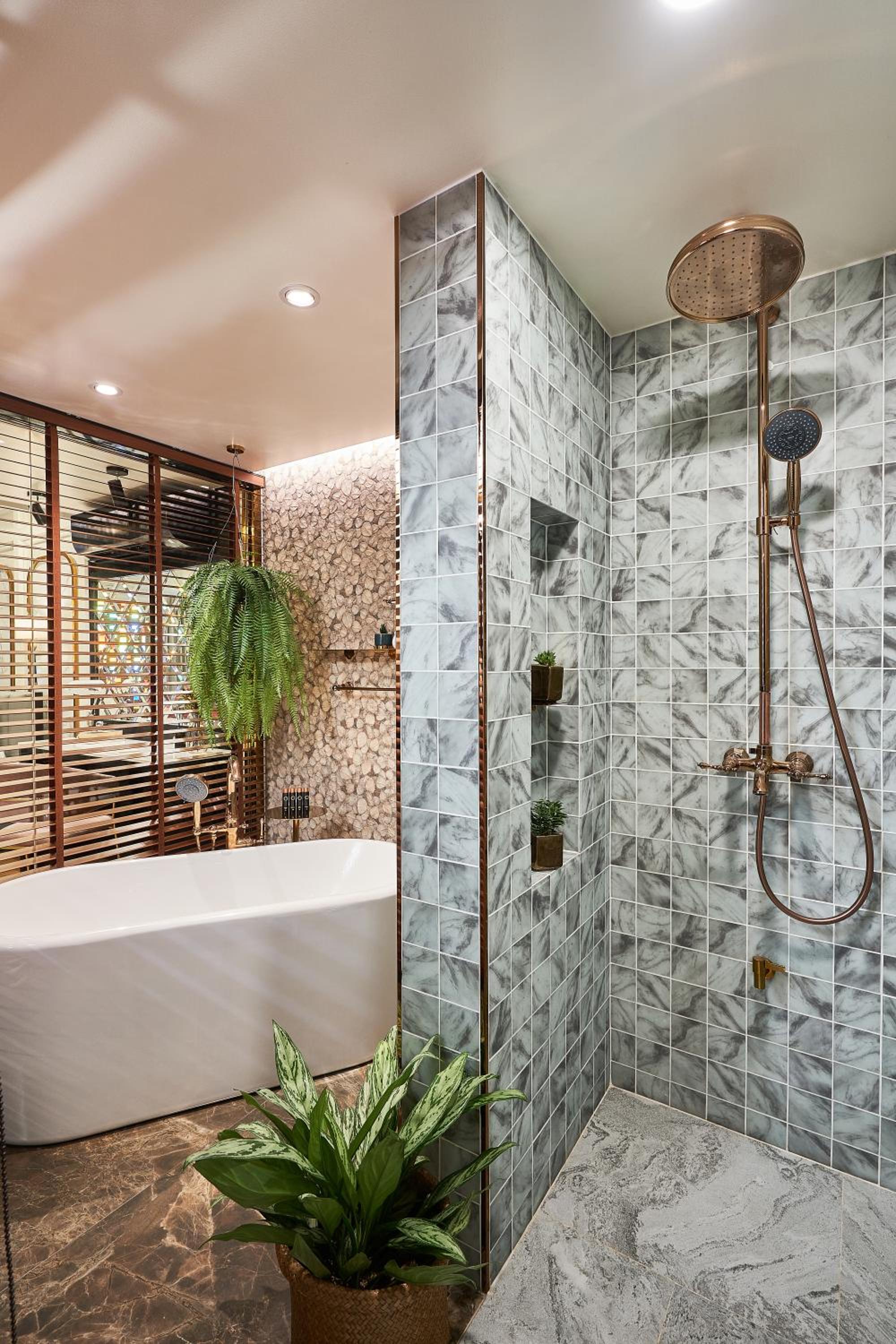 The bathrooms were modern and clean with great water pressure. The primary bathroom was upstairs, and the main bathroom had a great layout with the tub set slightly apart. It was really relaxing, especially with the soaking tub and the cascading plant, which gave it a spa-like feel.