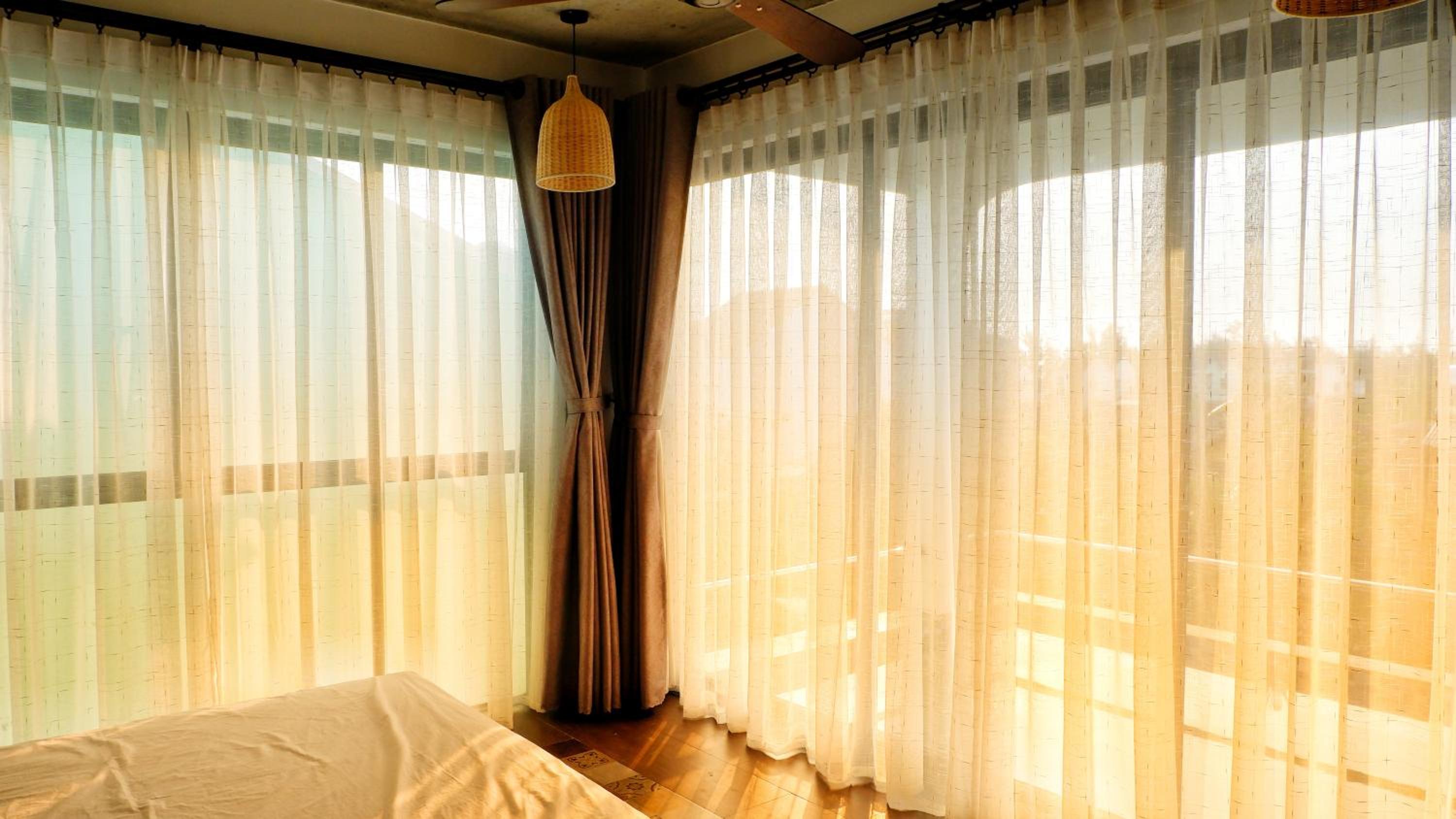 La puerta de entrada es de cristal opaco y las cortinas dejan pasar la luz asiq en cuanto amanece hay luz en la habitación.