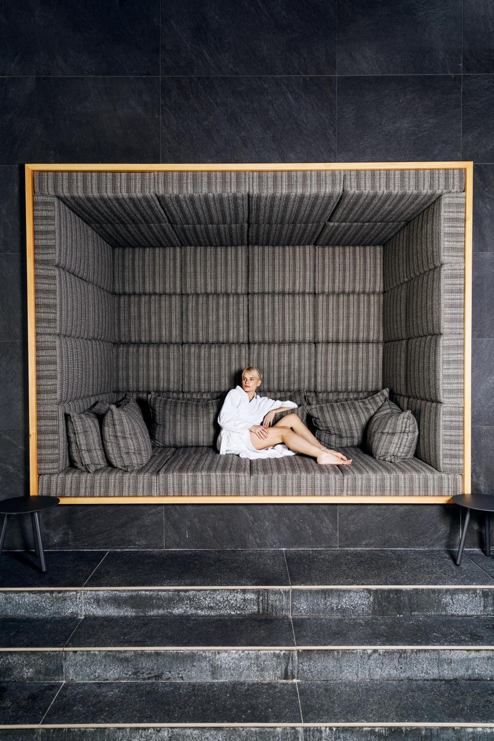 Indulge in relaxation at the 1,800 m² Grand Oaza spa centre, offering a variety of spa facilities including a sauna, Turkish bath, outdoor swimming pool, and hot tub with stunning mountain views.