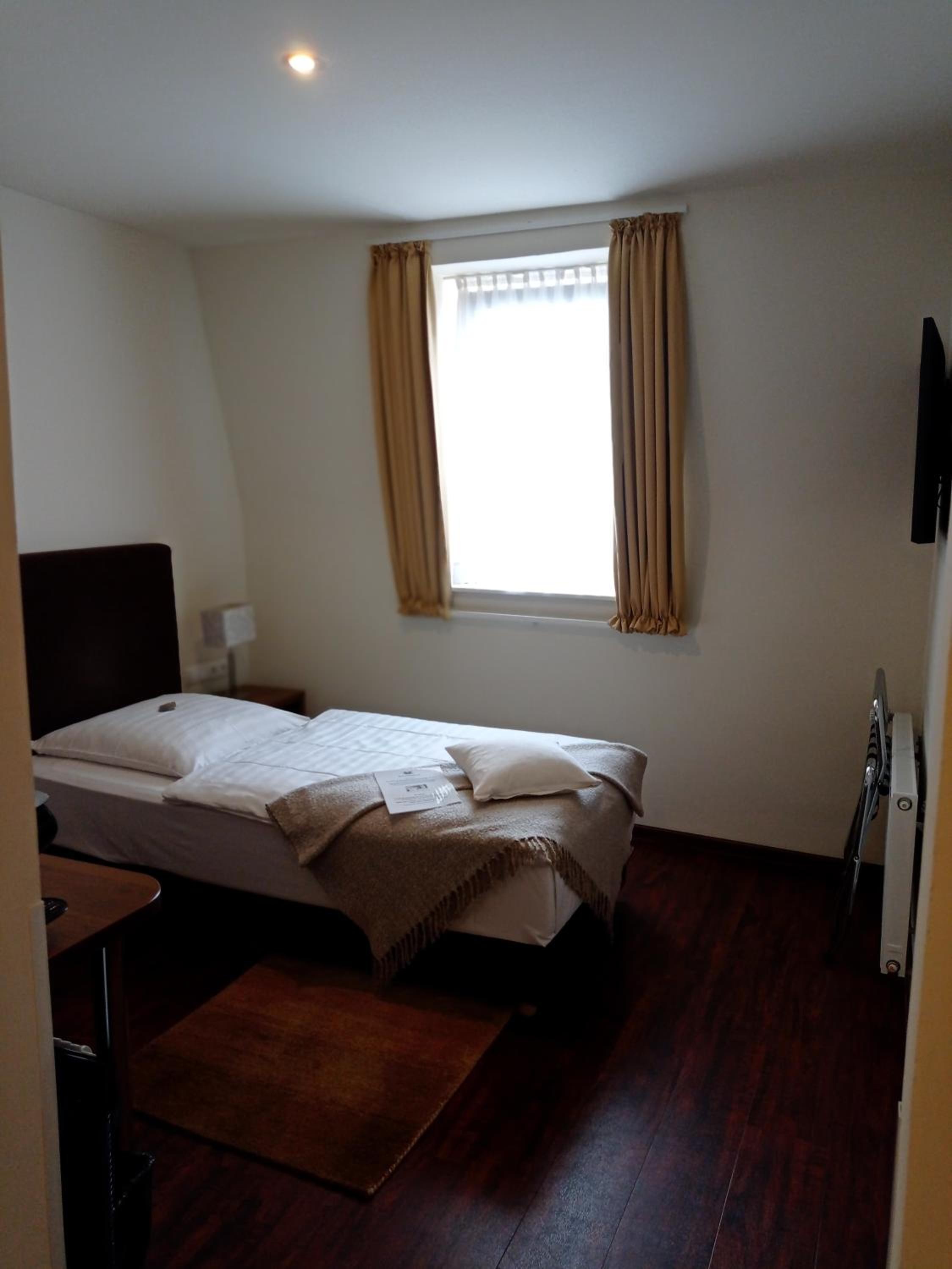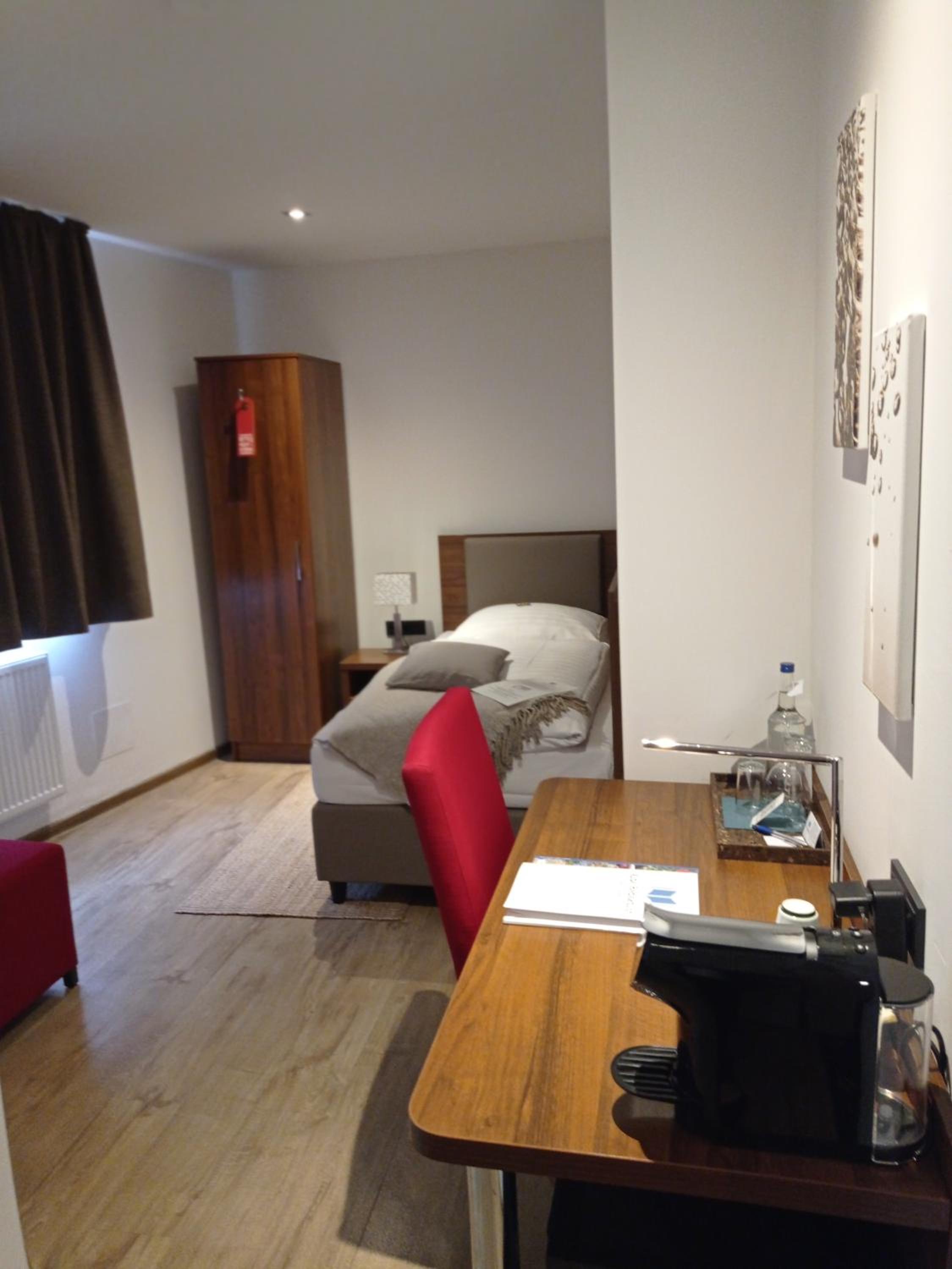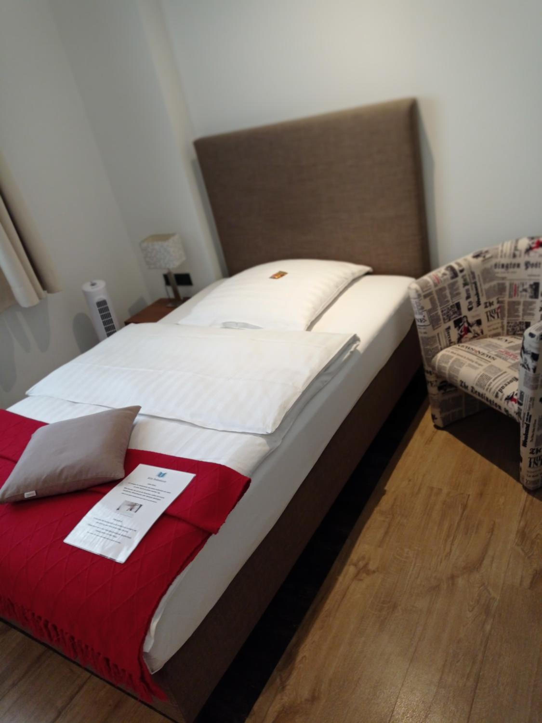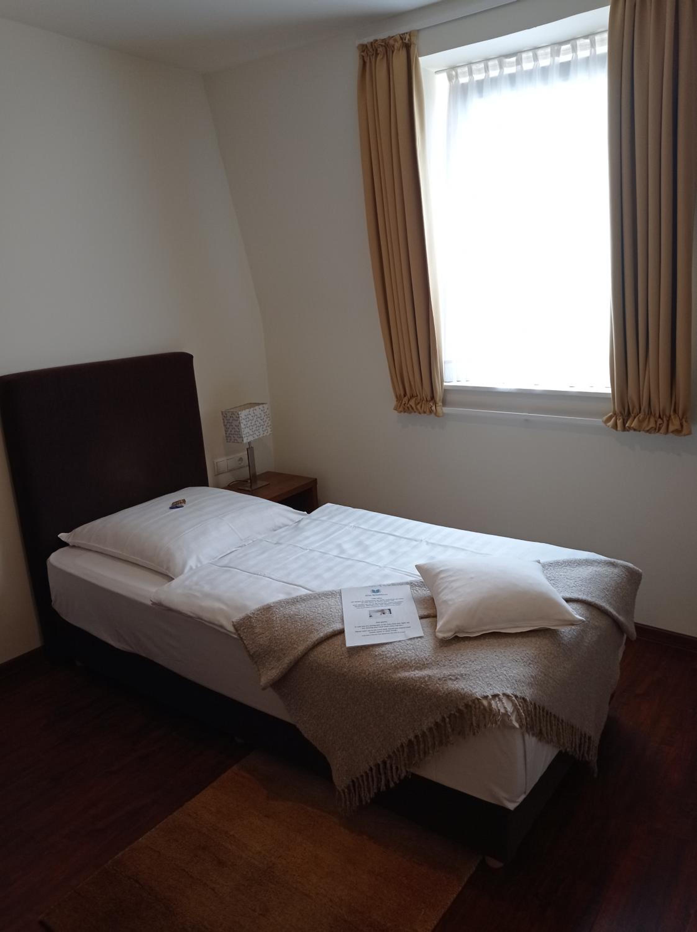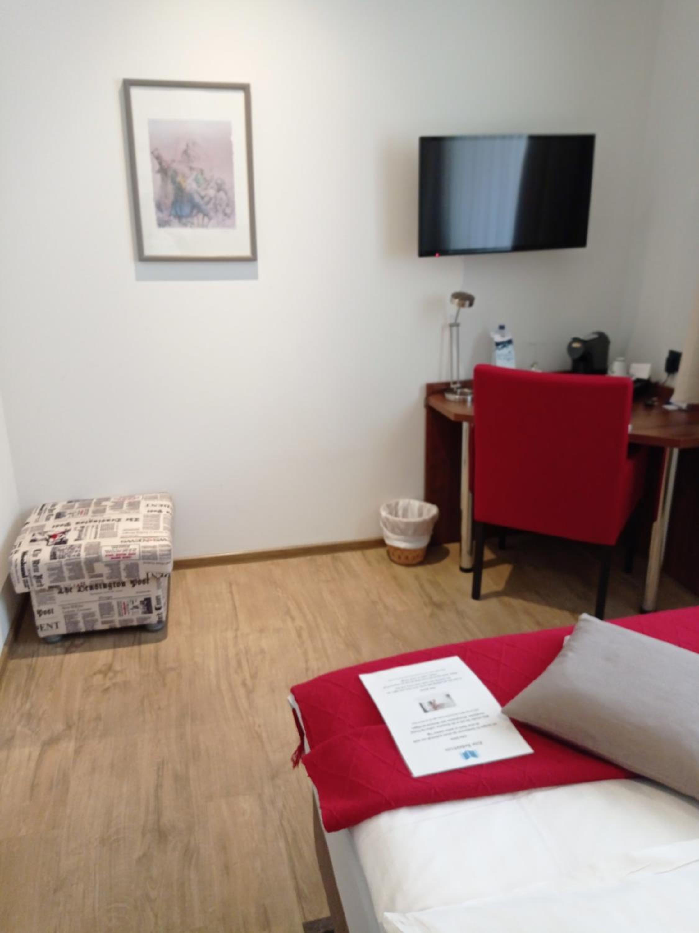 Freundliche Begrüßung, schönes und ruhiges Zimmer mit Tageslichtbad. Im Zimmer besteht die Möglichkeit, Kaffee oder Tee zuzubereiten