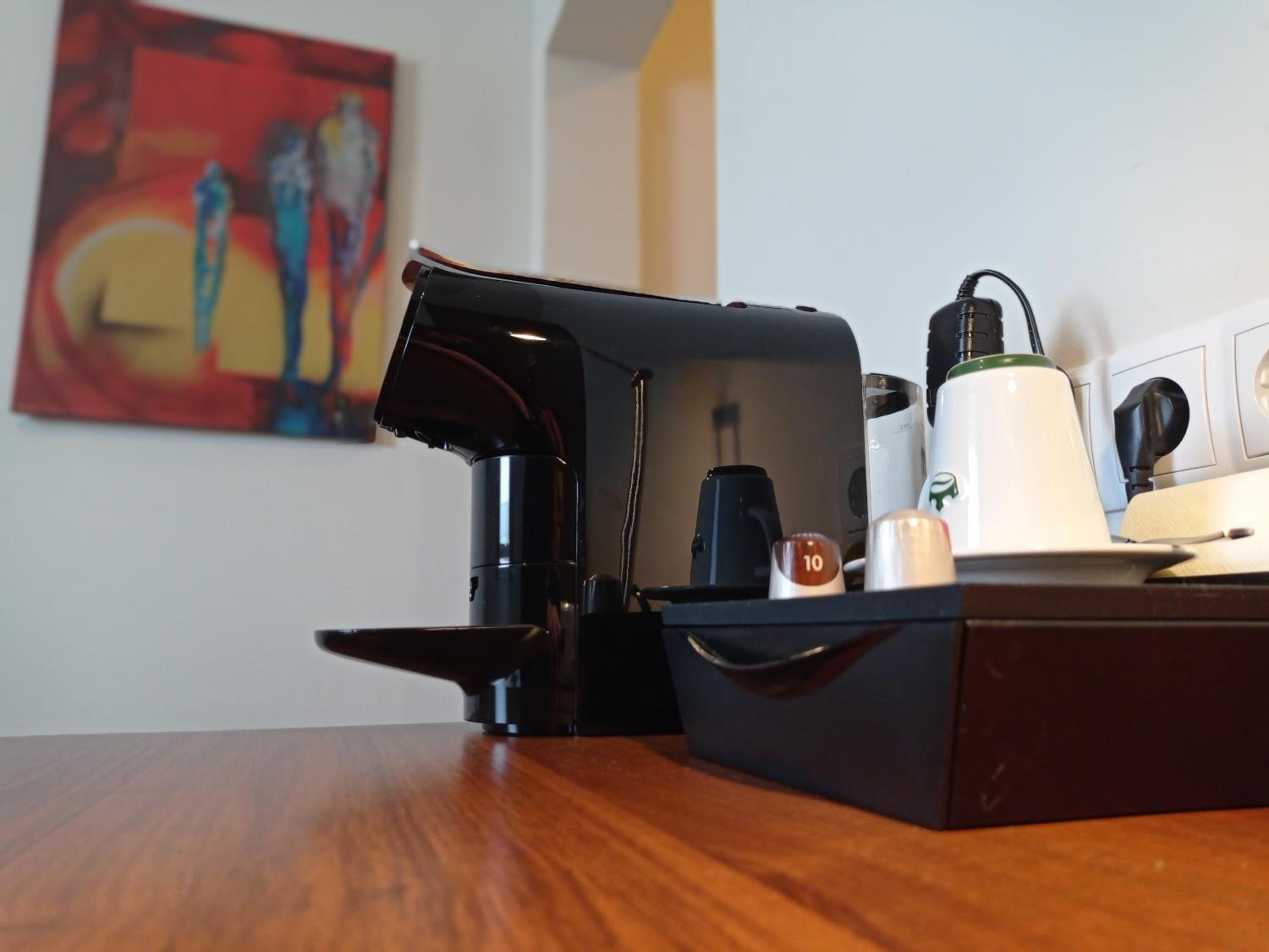 Ruhig, aber zentral gelegen. Kaffeemaschine im Zimmer.