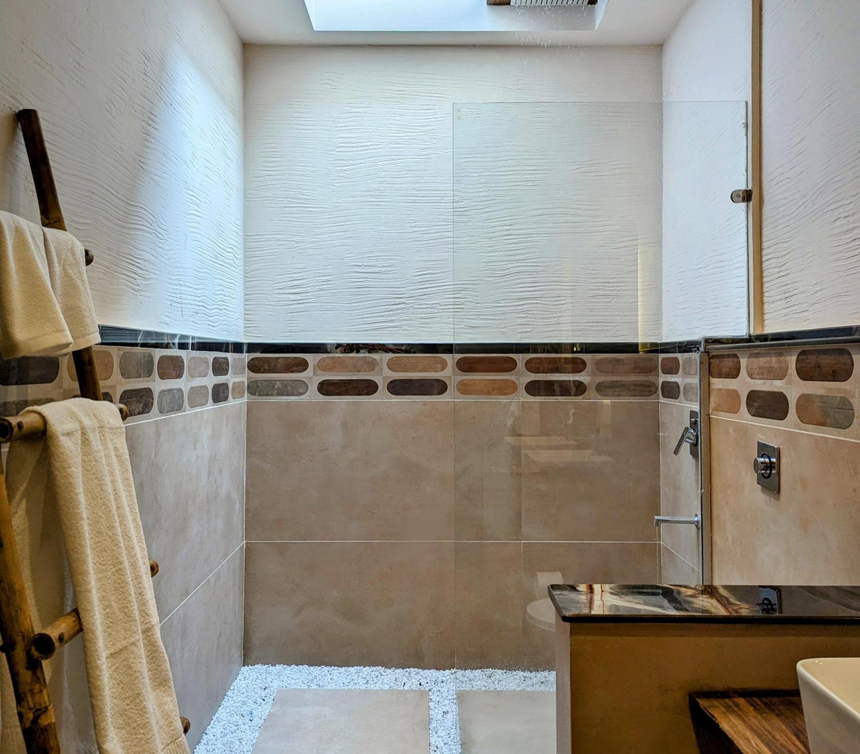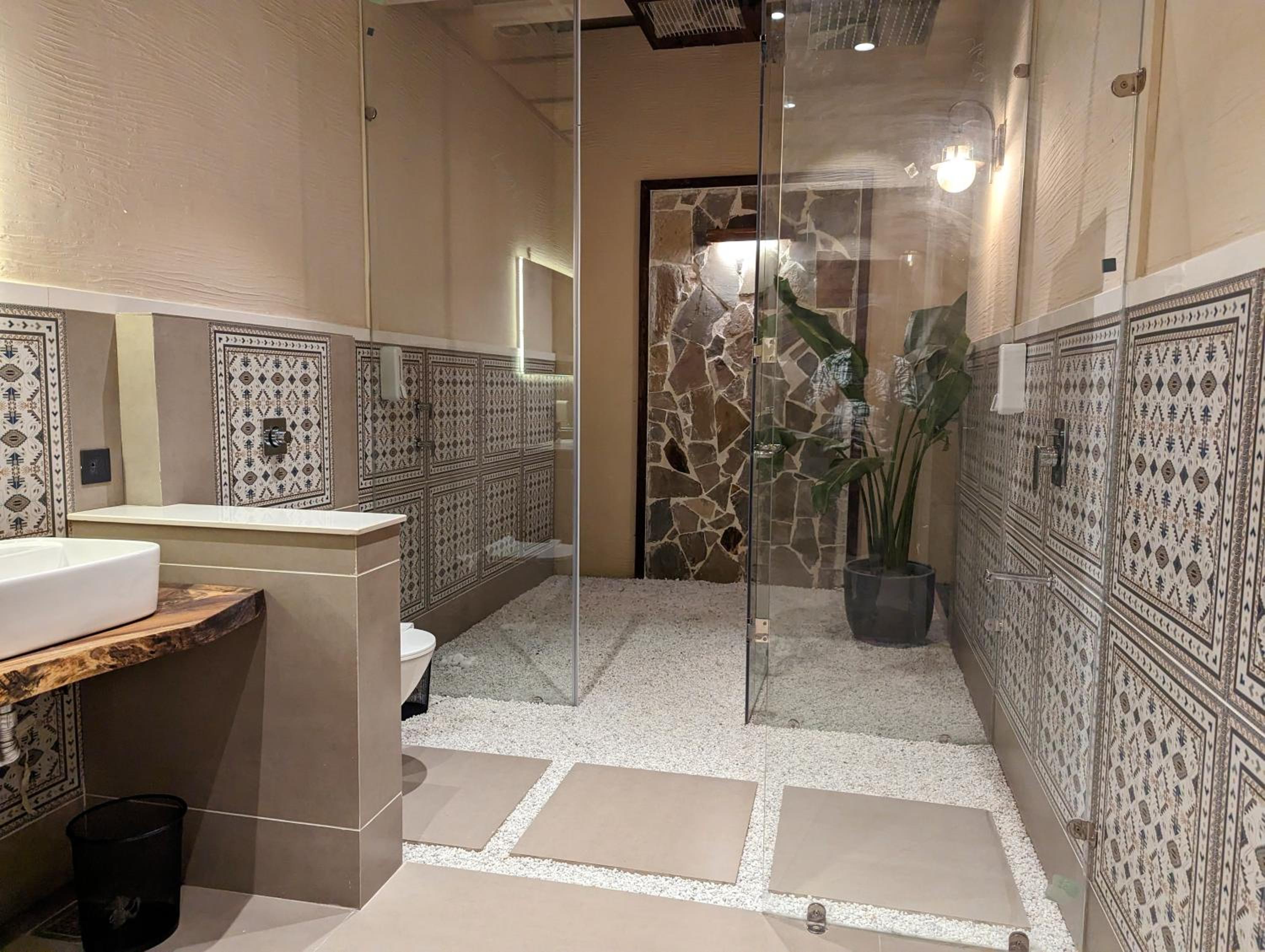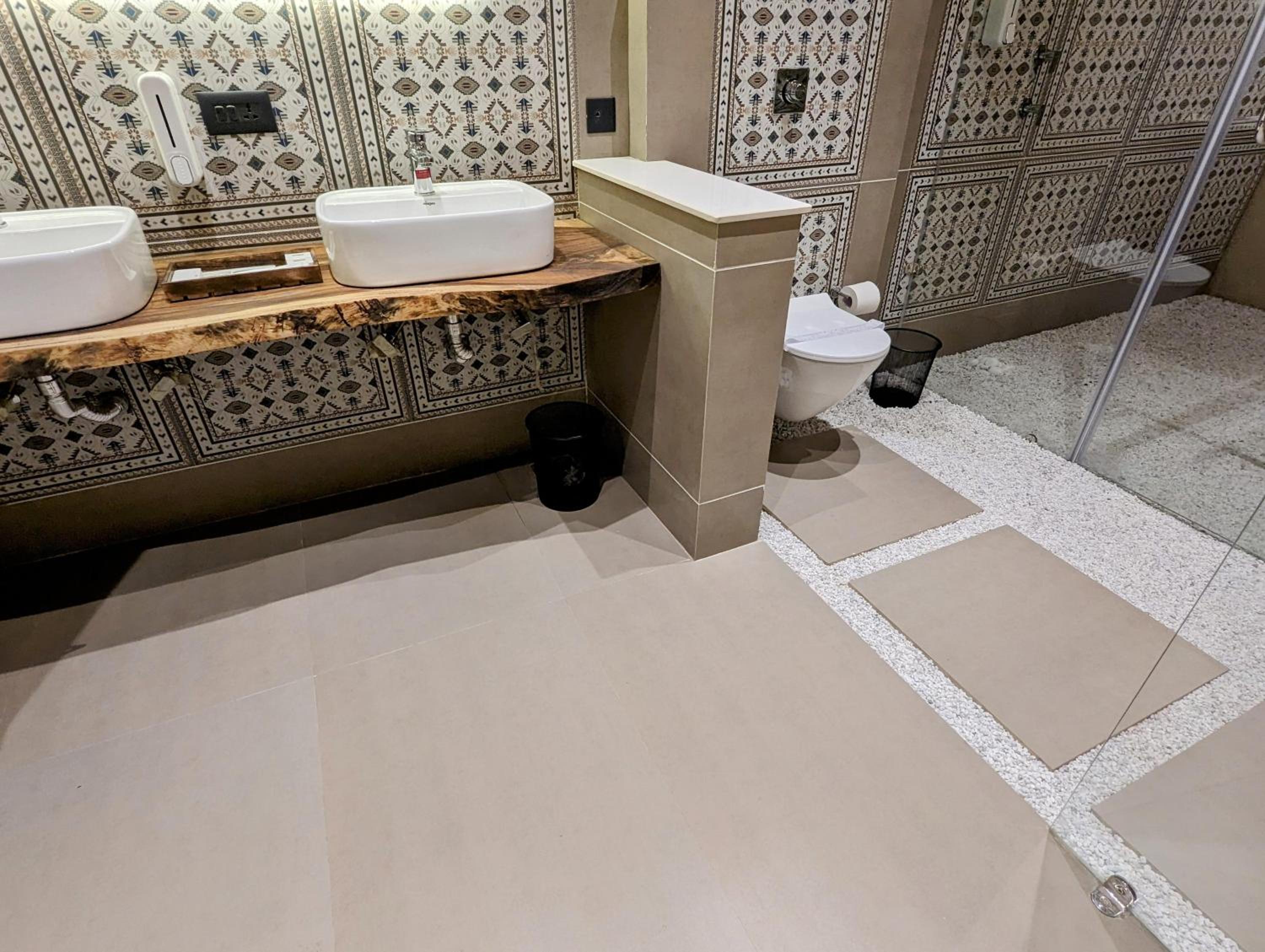 Wifi doesn’t work in the room. Pebbles in the shower are pretty but they retain hair and dirt. Flush is so strong that the water splashes on the seat every time (force needs to be adjusted).