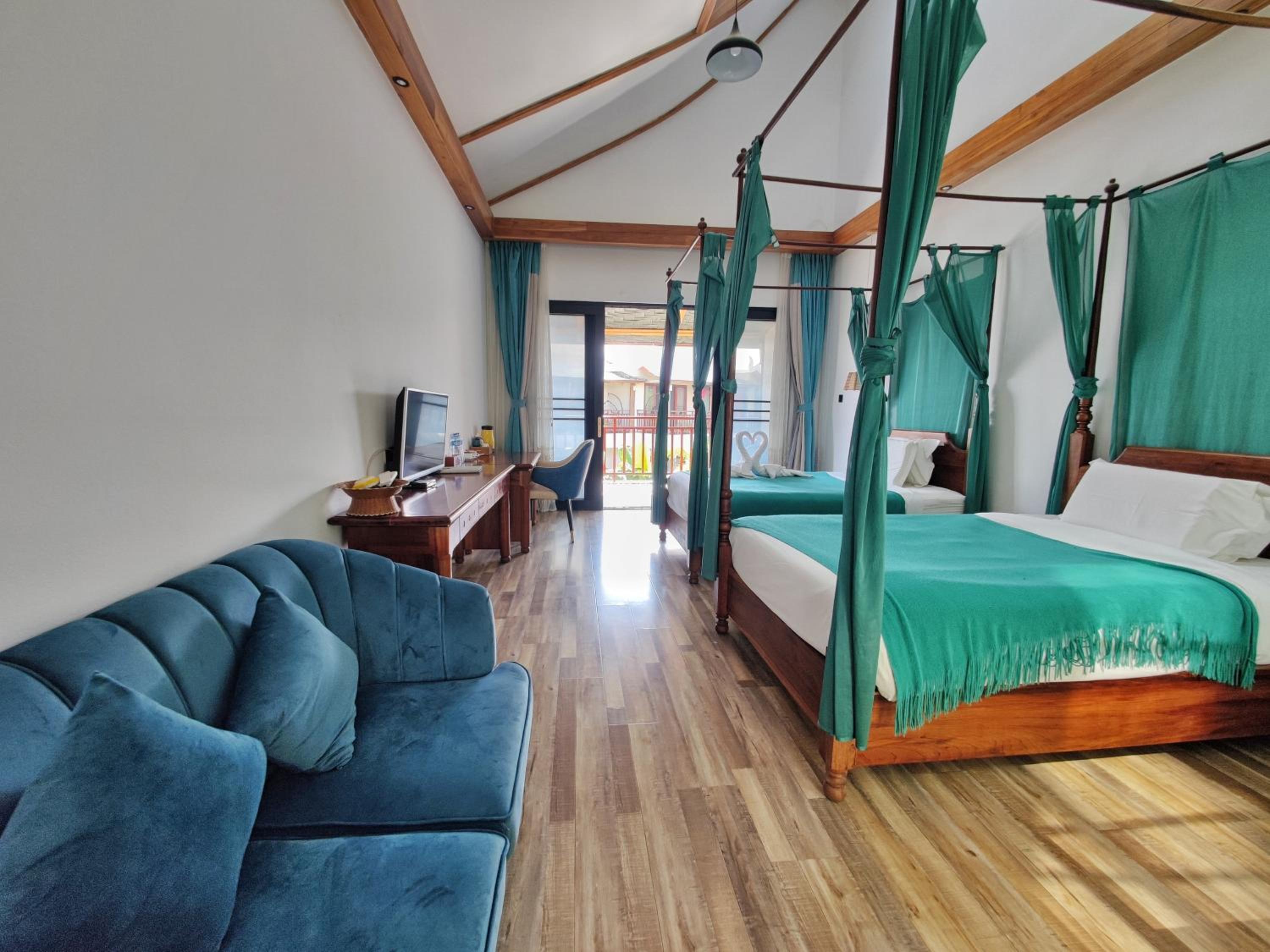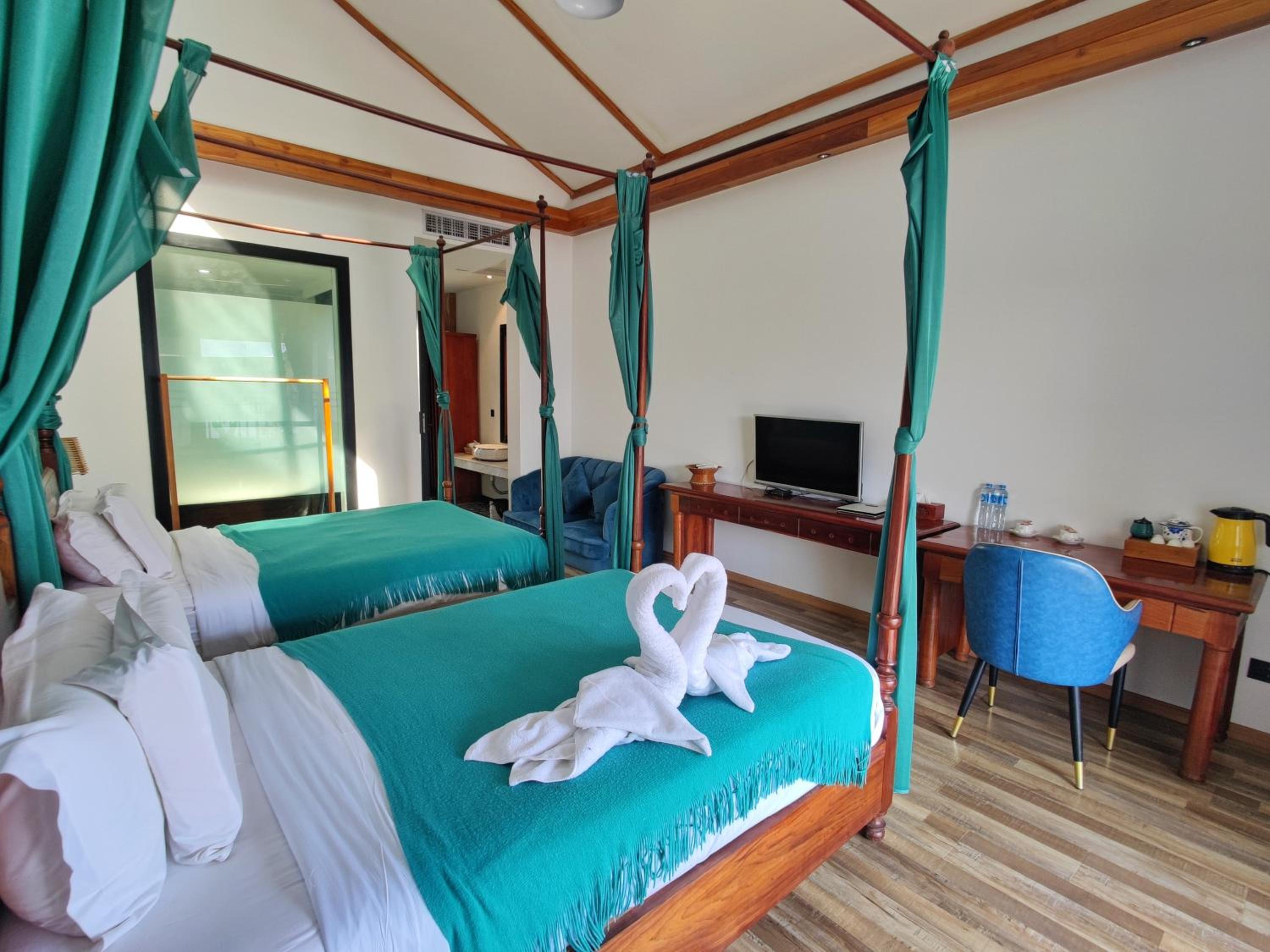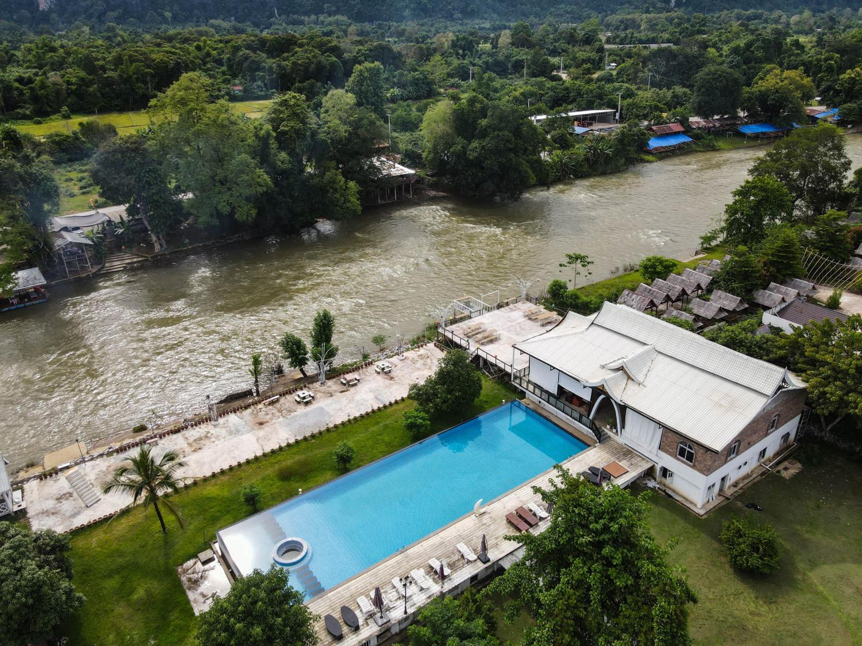 前一晚住在万荣市中心,那叫一个崩溃。凌晨5,6点就被轰隆的摩托车声吵醒根本没法睡,哪怕是市中心老外开的比较知名的木门也会咯吱咯吱的响。隔音不好,果断换到这家河边酒店,瞬间清净了!虽然老挝小城整体比较原生态破旧,但这家酒店环境清幽,坐在河边看风景体验感超棒。强烈建议怕吵的朋友选这里,别住市中心,走路大概15分钟左右沿着河边慢慢溜达过去,既能感受当地风情,又不会觉得太远,其实挺舒服的,酒店还提供免费接送服务,这点超级贴心!想省力的时候一个电话车就到,灵活又方便。而且是度假酒店来度假的性价比超高占地好,26亩,1万多平米,一眼望不到头。还有超大泳池
