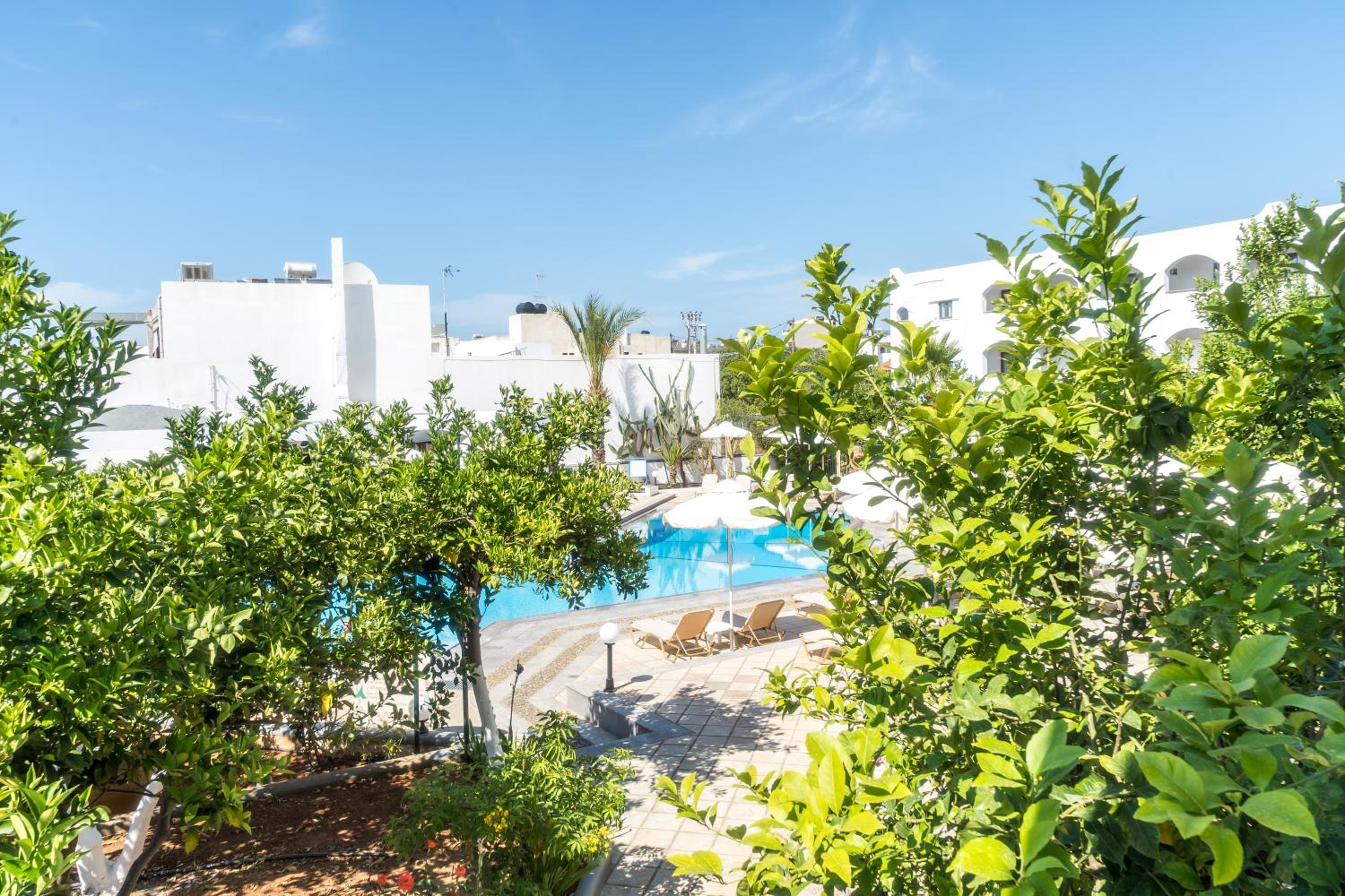 Relax by the Pool: Hotel Malia Holidays boasts a spacious, free-form pool surrounded by a lush garden, perfect for unwinding under the sun.