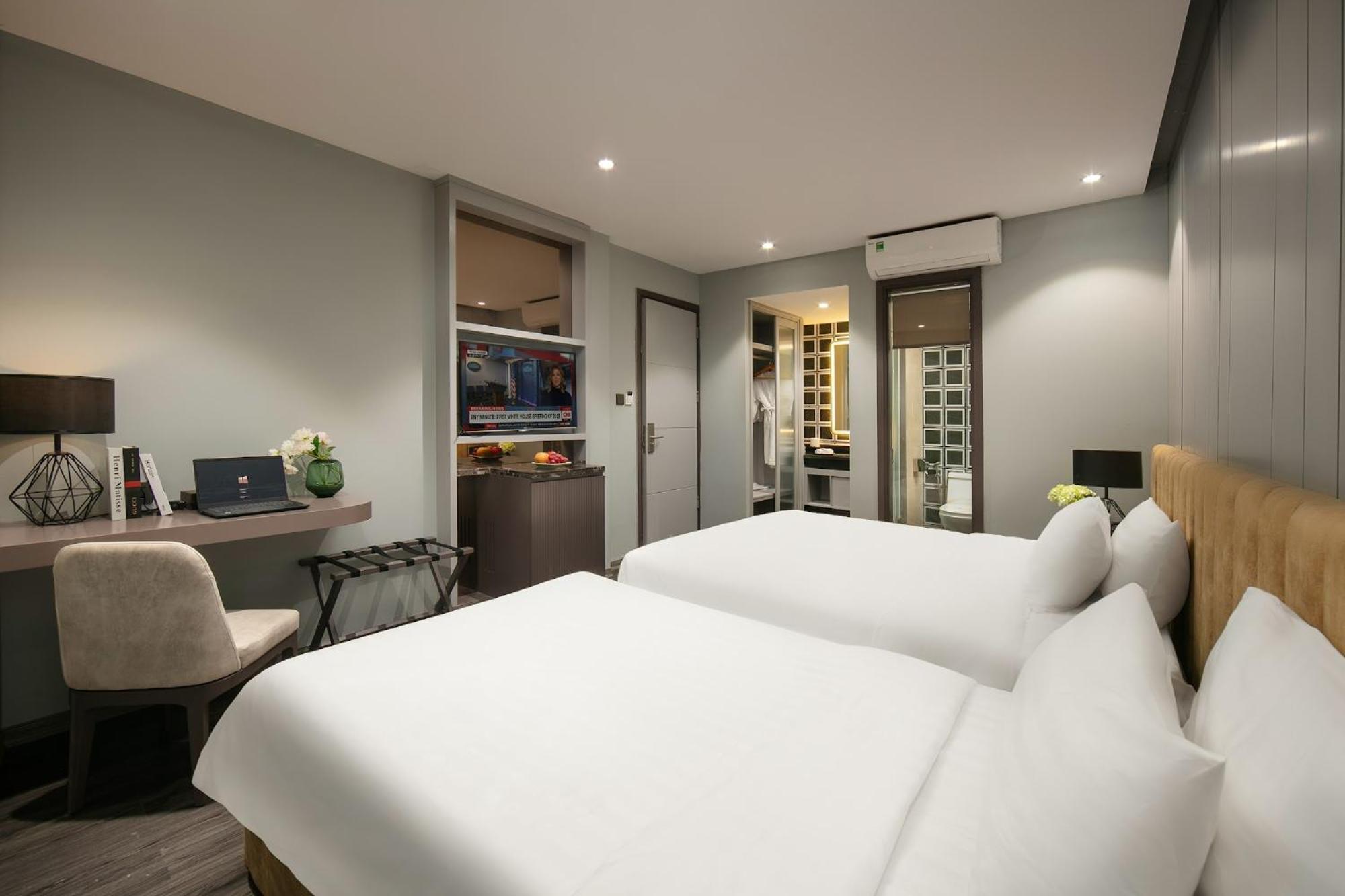 The hotel's modern air-conditioned rooms with a light blue and white theme provide a comfortable retreat. Enjoy amenities such as free Wi-Fi, flat-screen TV, and a minibar for a relaxing stay.