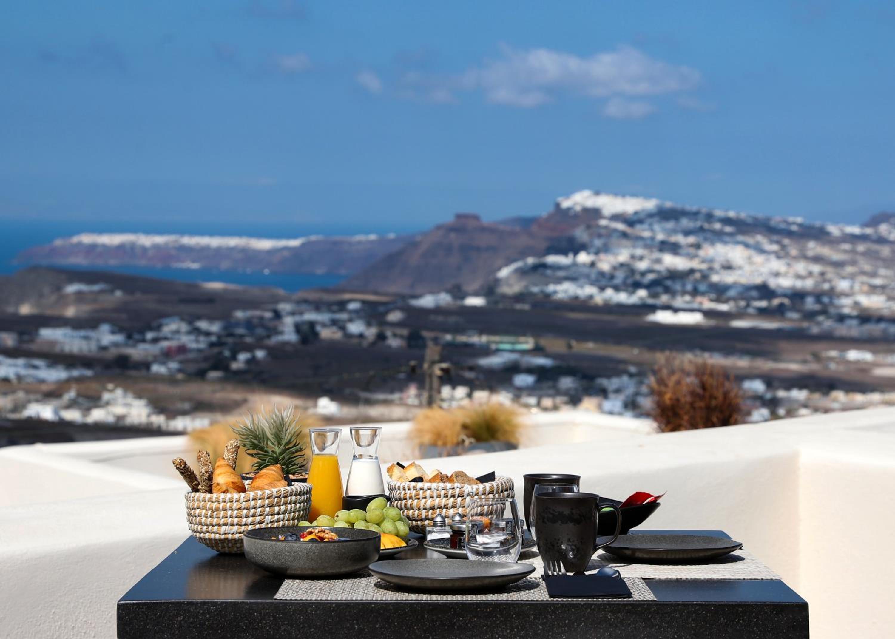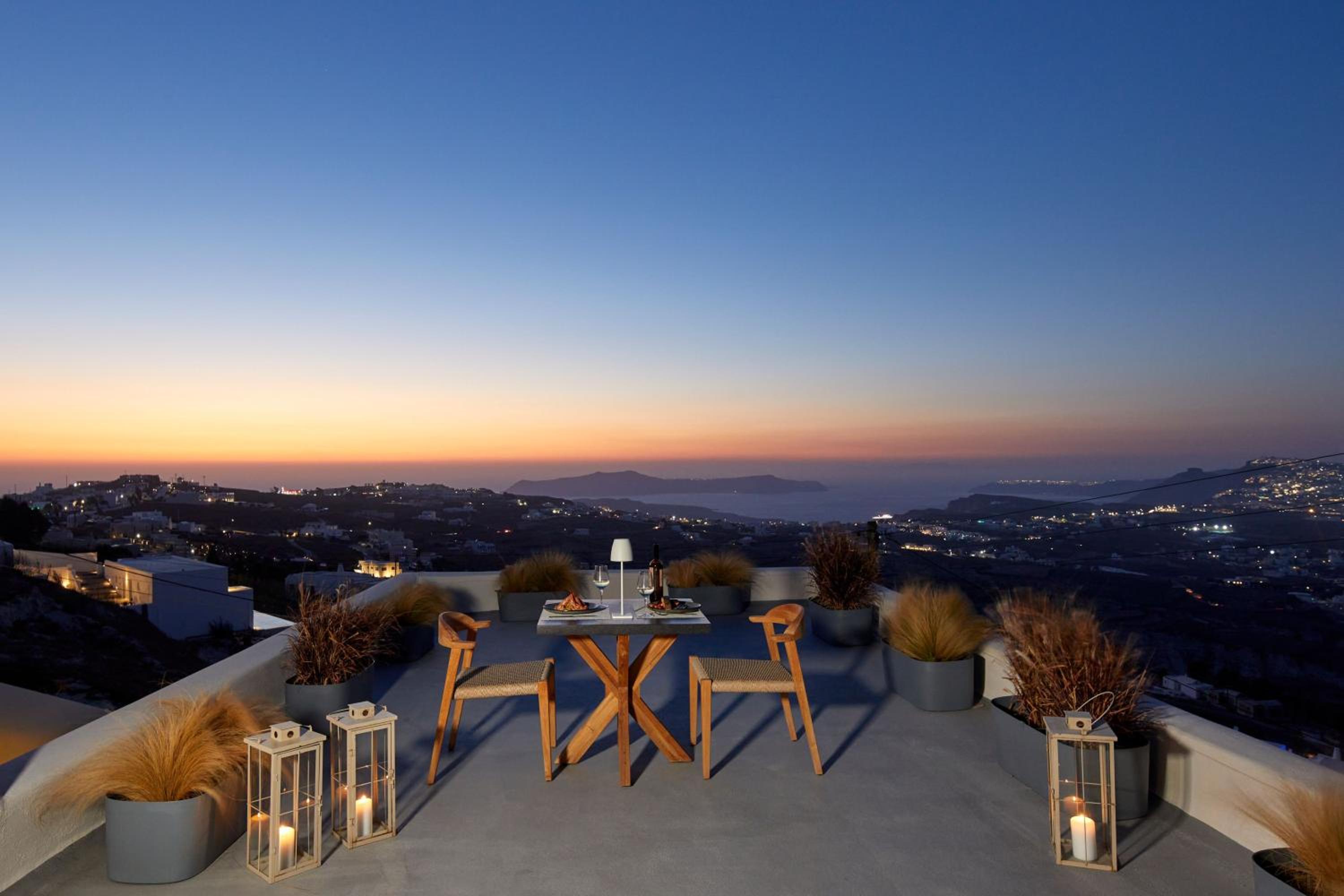 environnement original décoration de bon gout, aménagements patio et terrasses exceptionnels , vue imprenable et dominante sur Santorin et la caldera.
