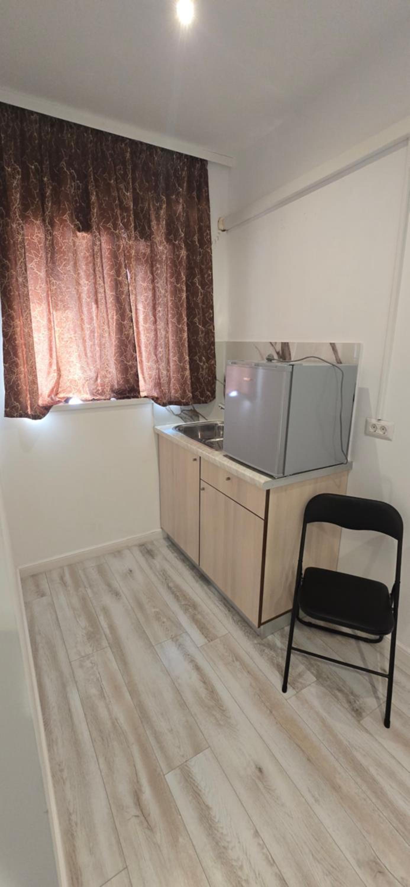 Насправді був тільки холодильник і умивальник. Не було навіть стаканів і чайника .
