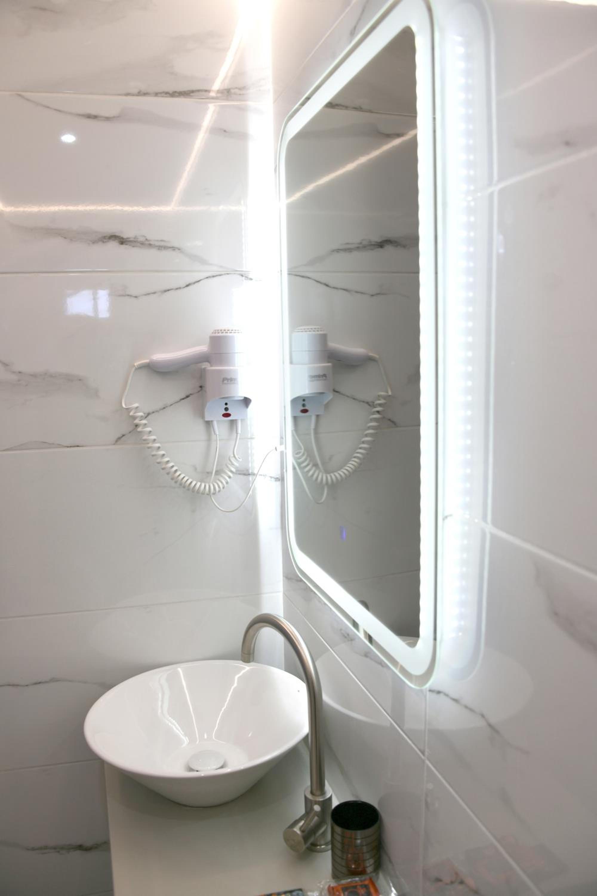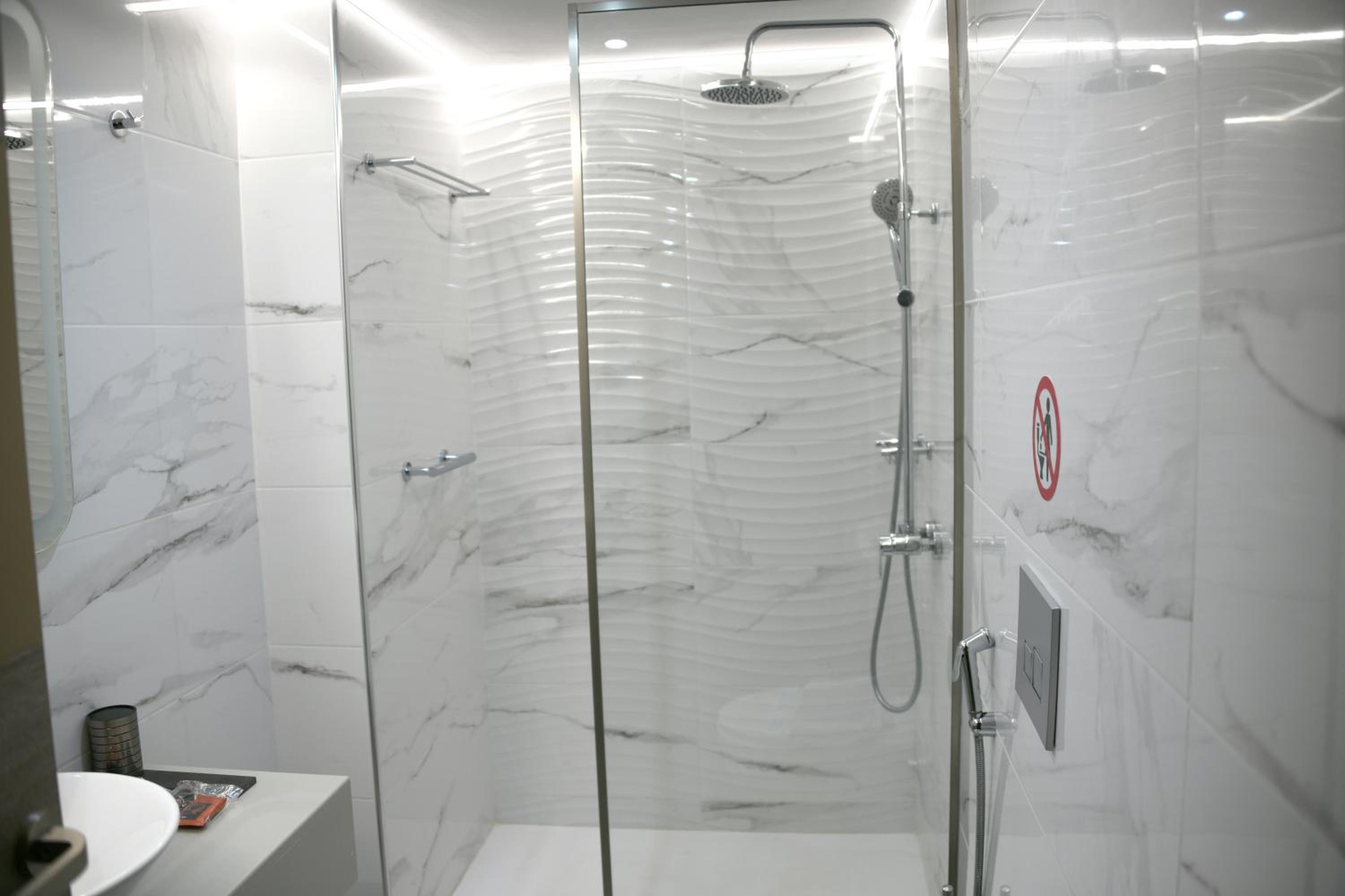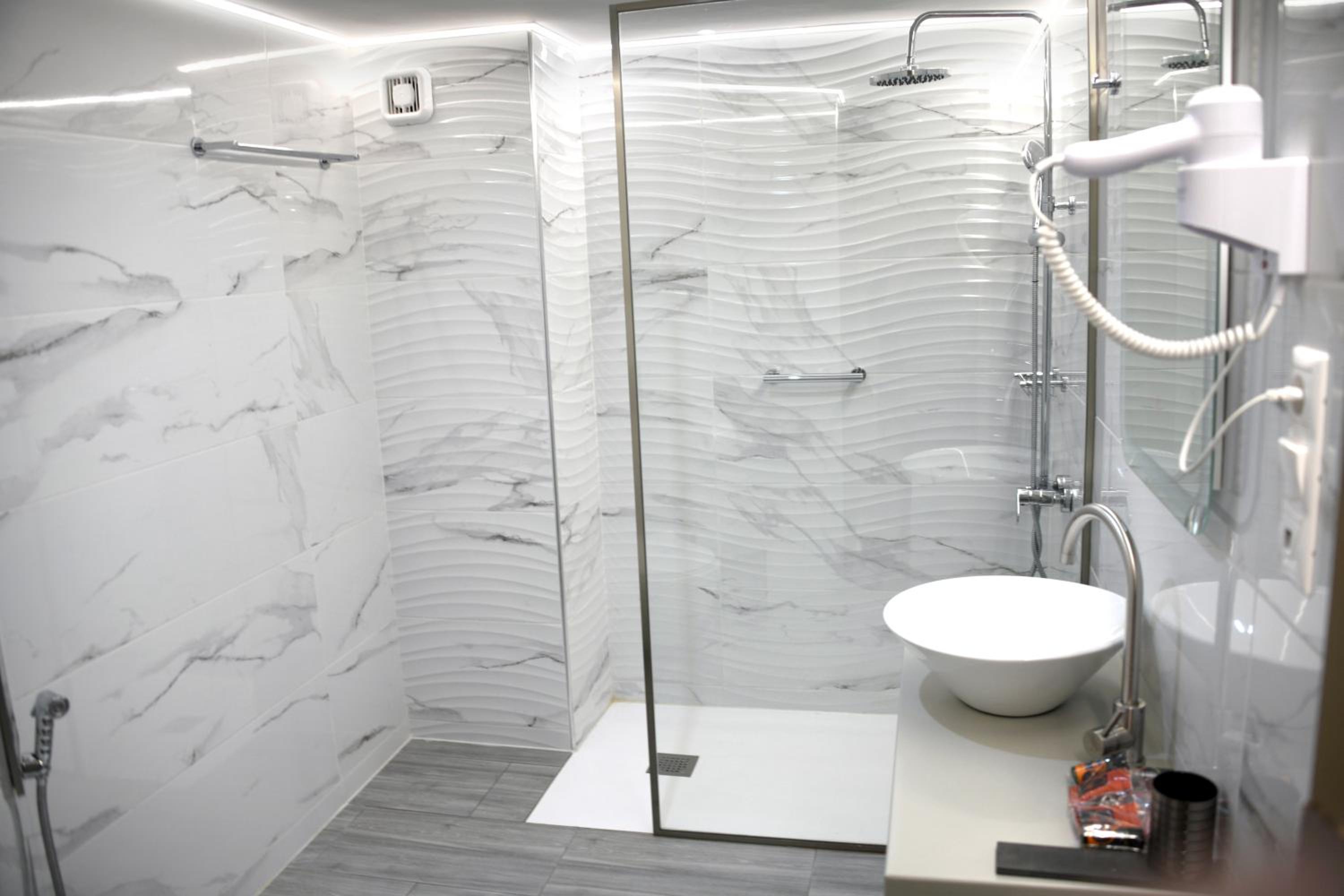 La douche basse sous plafond sans fenêtre, le sèche cheveux qu on ne peut pas déplacer (sécher les cheveux dans une pièce très humide).
