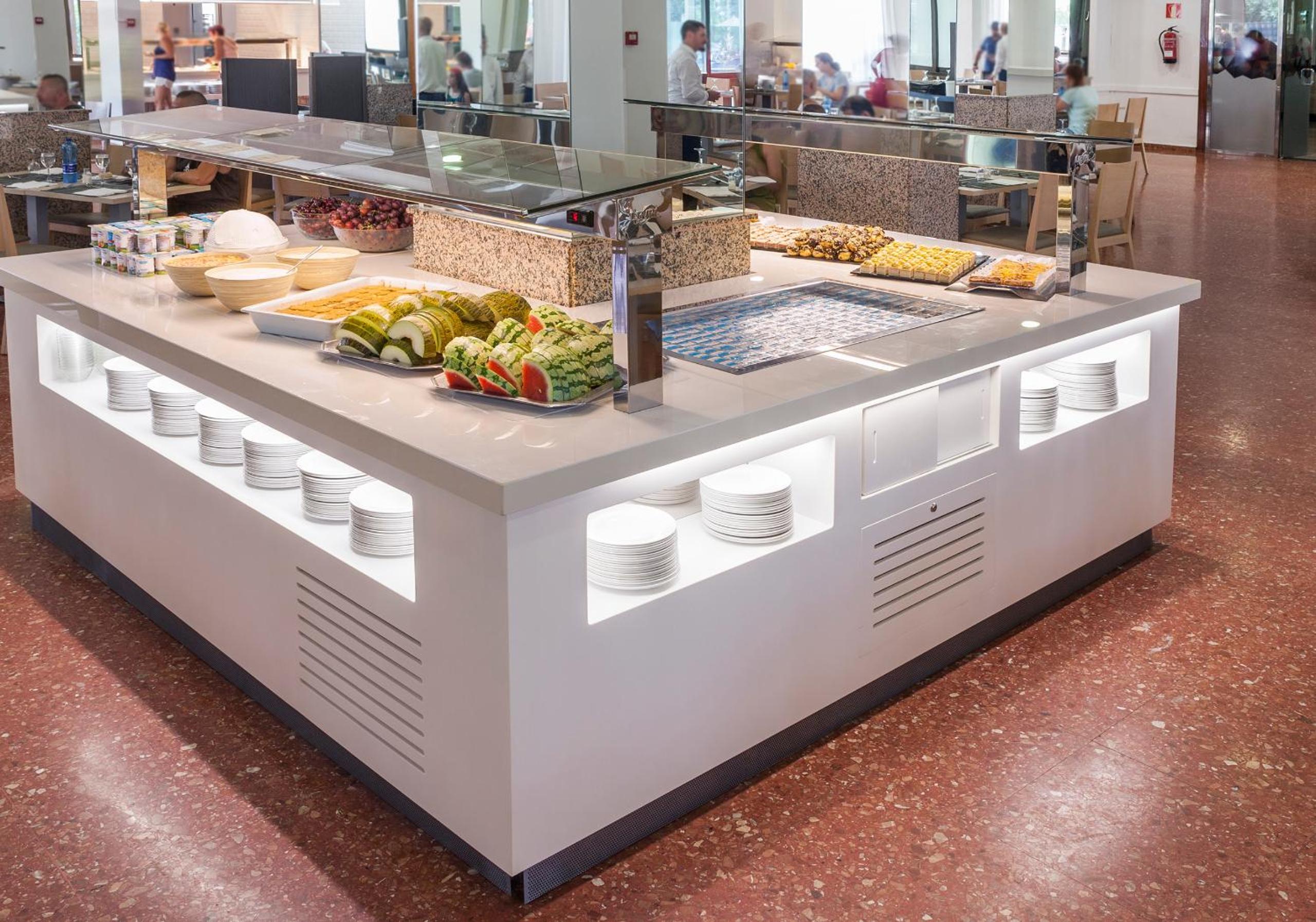 Open buffet restaurant with full board. Drinks included during meals according to the drinks menu (soft drinks, draft beer, house wine, sparkling or still water). Free buffet of hot and cold, sweet and savory snacks (*), served in the restaurant outside of meal times. *(Service available in high season. Check dates with the hotel).