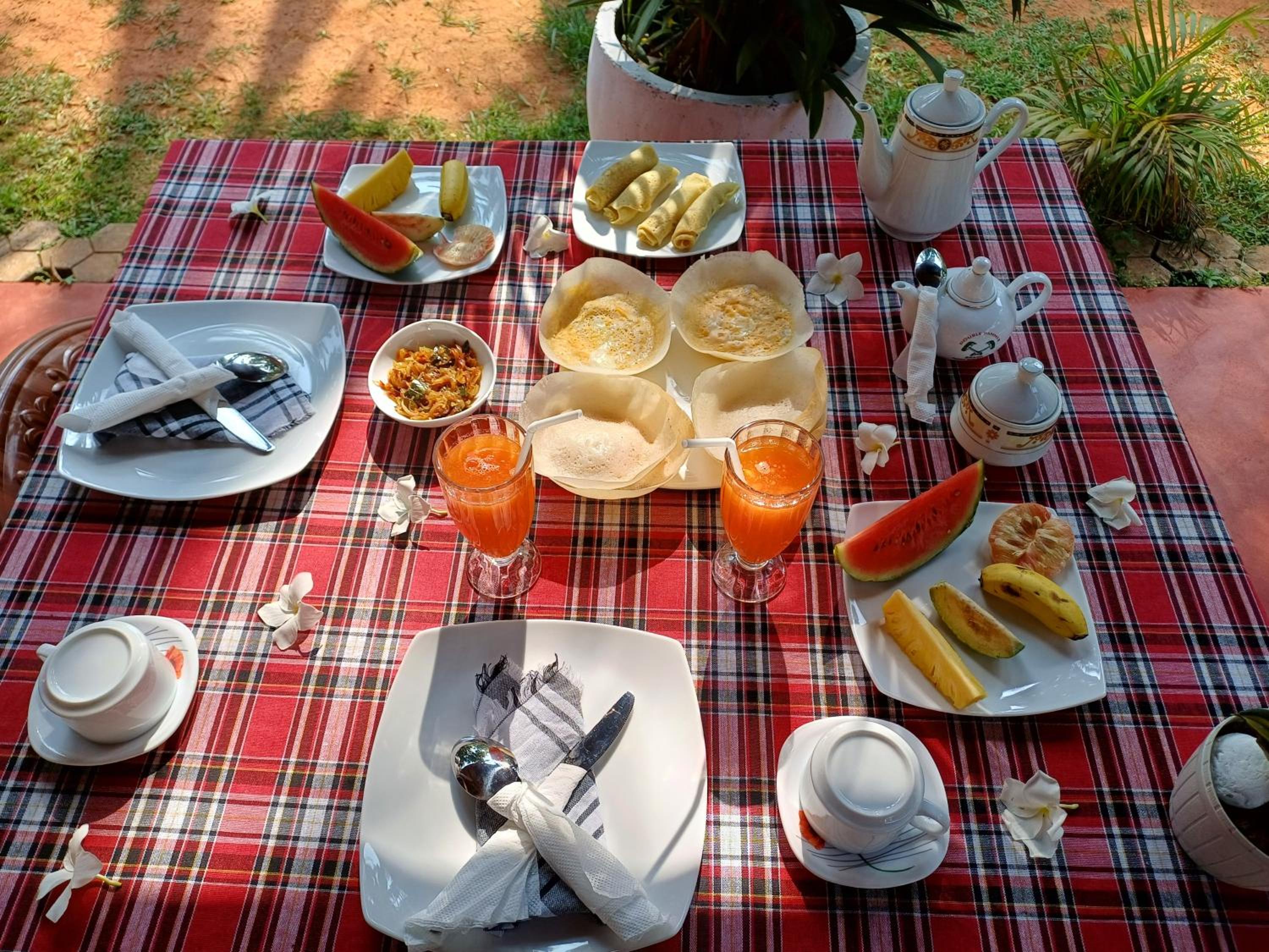 Das Frühstück war sehr reichhaltig, abwechslungsreich und lecker. Besonders hervorzuheben ist der super sympathische und extrem engagierte Gastgeber Vasantha, der unseren Aufenthalt, zu einem ganz besonderen machte. Er holte uns kostenfrei von der Bushaltestelle ab, brachte uns dorthin auch wieder zurück und fuhr erst wieder als wir sicher im richtigen Bus saßen. Darüberhinaus machte er zahlreiche Vorschläge, was wir unternehmen können und begleitete uns sogar zur nächtlichen Seaturtle Beobachtung am Strand, wo er selbst als Teil des Teams den Schutz der Seaturtles unterstützt. Wir standen dem Ganzen erst skeptisch gegenüber, wurden aber sehr positiv überrascht und durften dank Vasanthas Begleitung auch getrennt von den anderen Touristen einen Blick auf die Meeresschildkröte werfen. Sehr zu empfehlen!