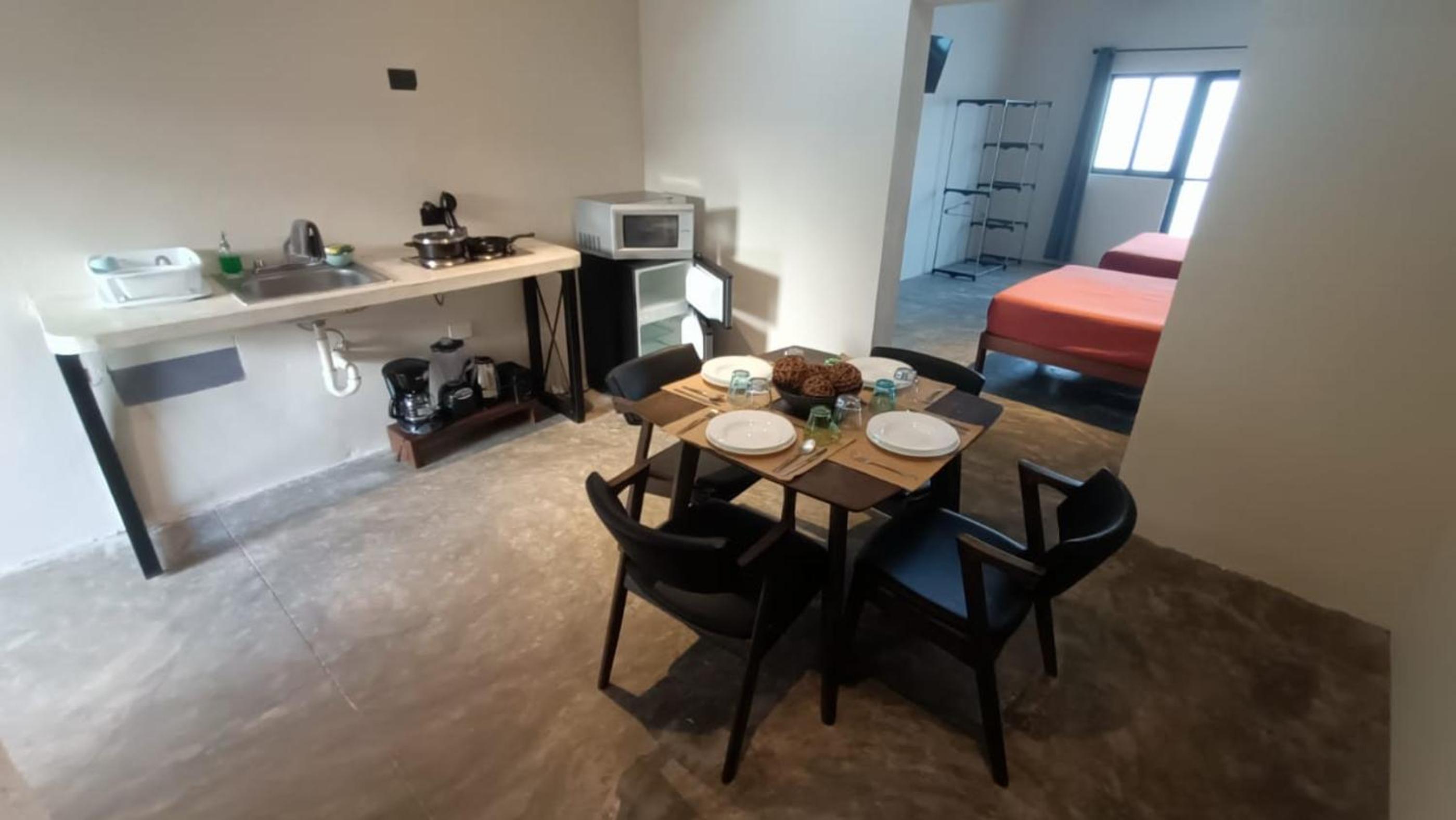 Tiene una pequeña cocina, básica pero suficiente. Es amplio. El dueño nos resolvió rapidamente los problemas a traves de Whatsapp