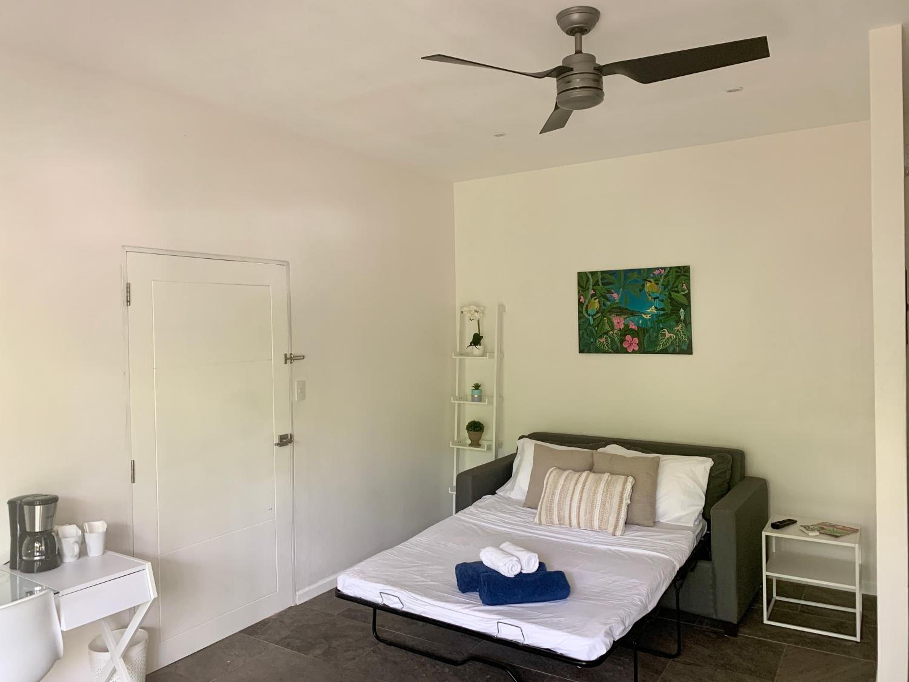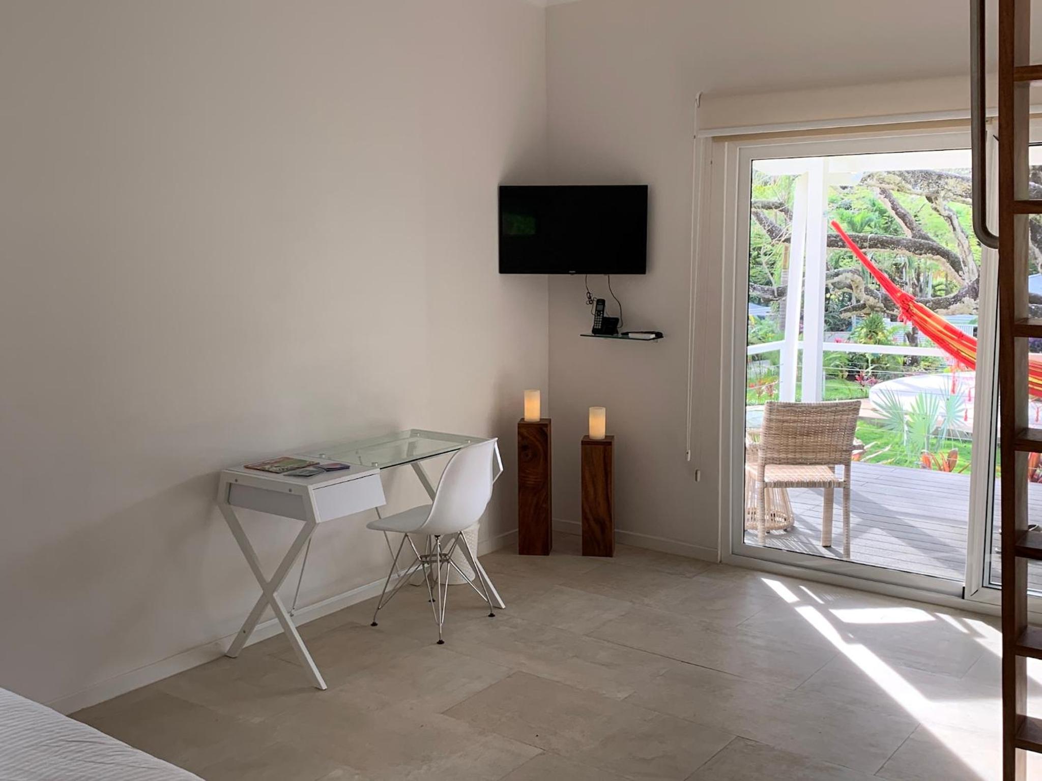 El TV está muy lejos de la cama y se ve muy pequeño. No hay mucho lugar para guardar maletas y ropa. El restaurante cierra temprano (como todo en Costa Rica). El camino cercano al hotel no está muy bien, bastantes pozos. Está lejos de la playa, hay que estar con auto.