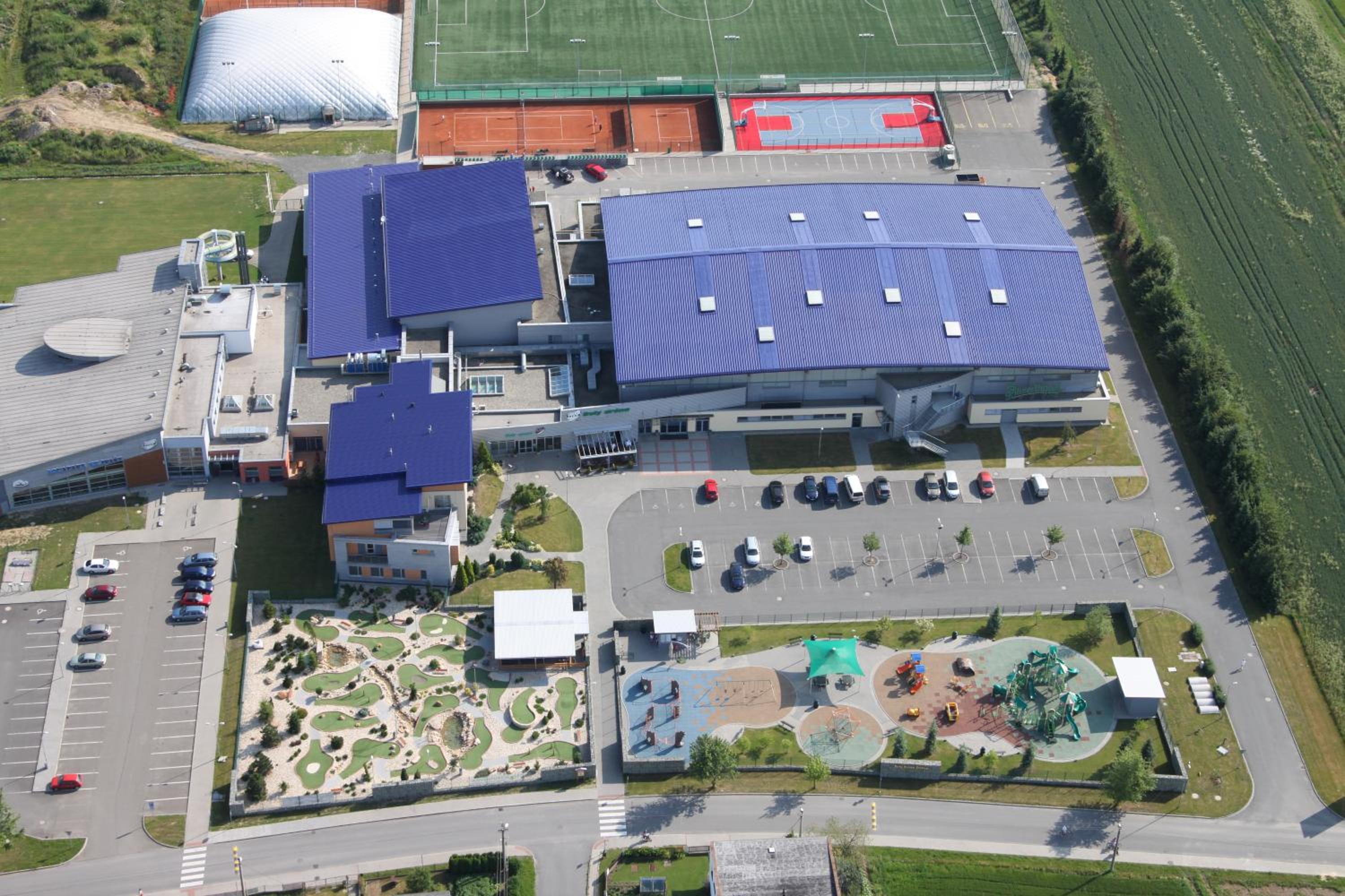 Buly Aréna in Kravaře offers a range of luxurious amenities including an aqua-park, wellness center with sauna, gym, and indoor pool. Guests can also enjoy free Wi-Fi, free parking, and a variety of sports facilities such as an ice rink, tennis court, and mini golf course.