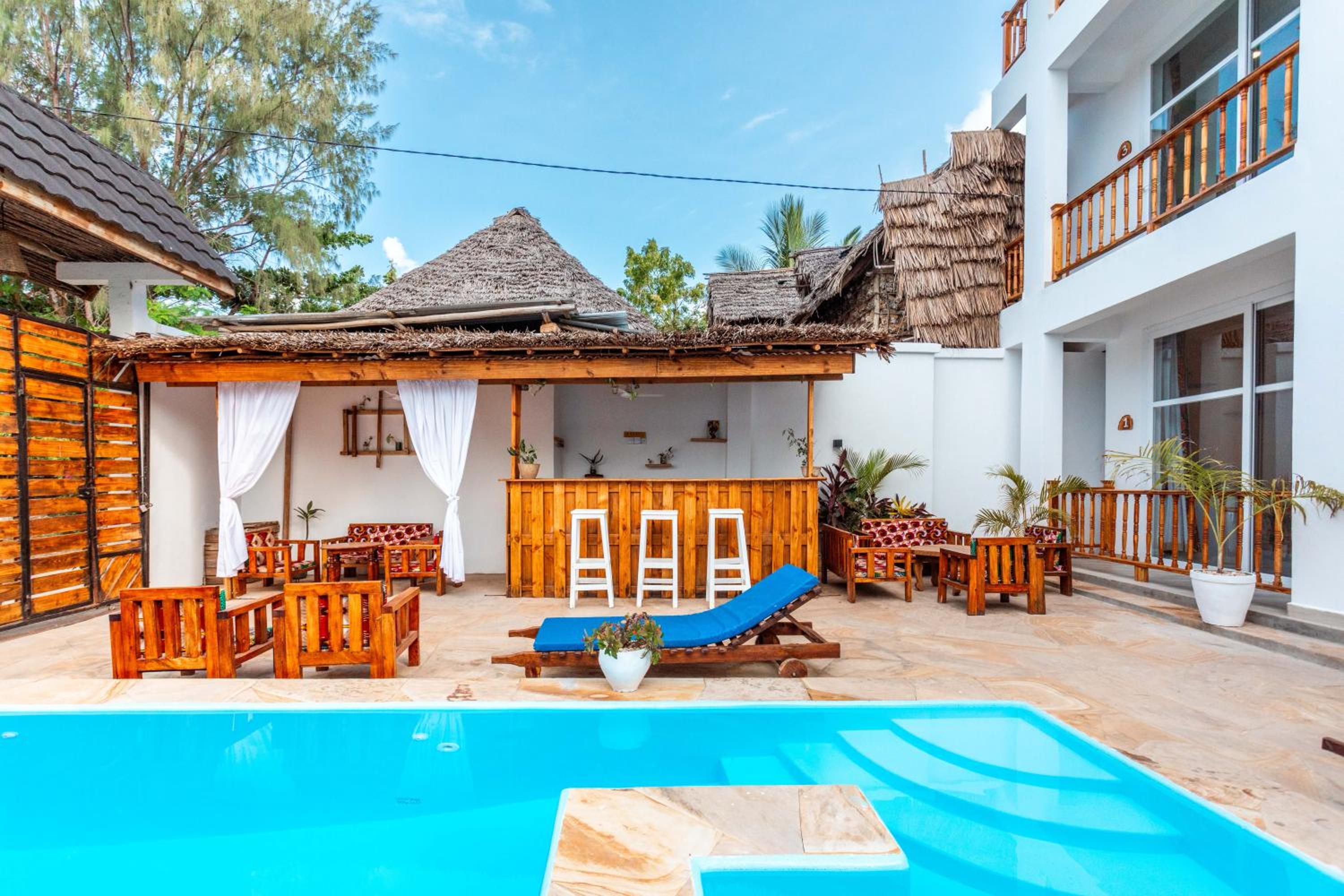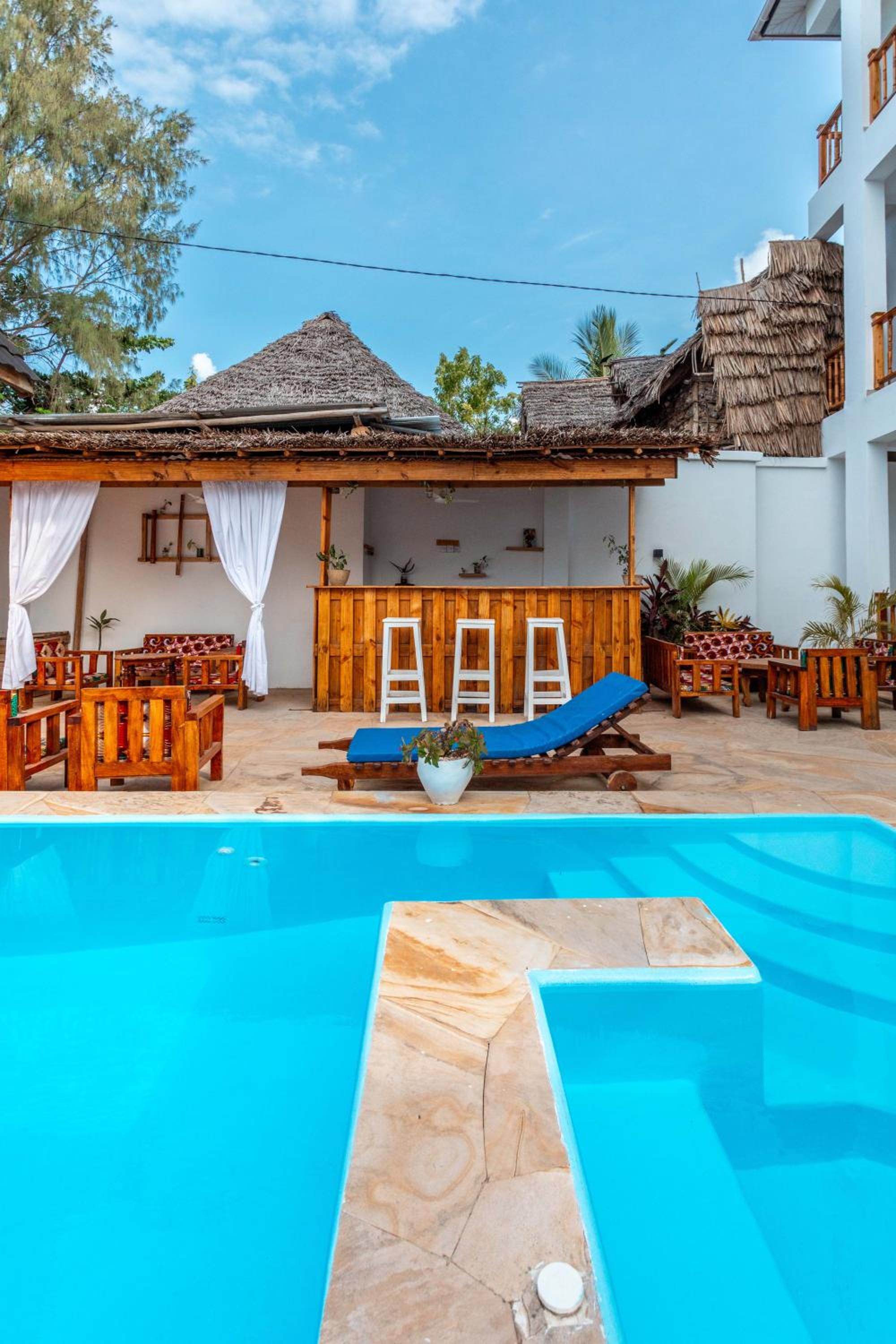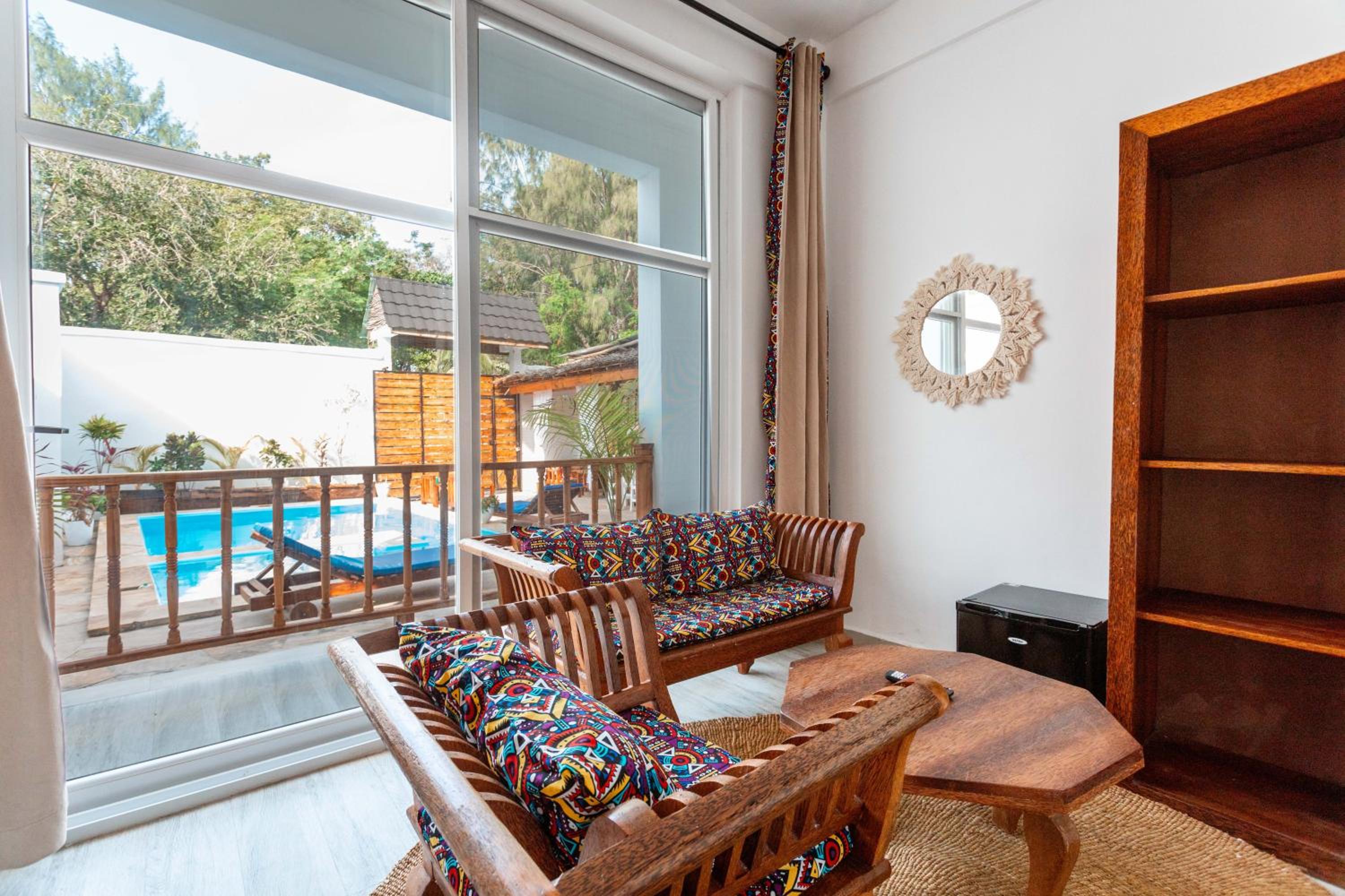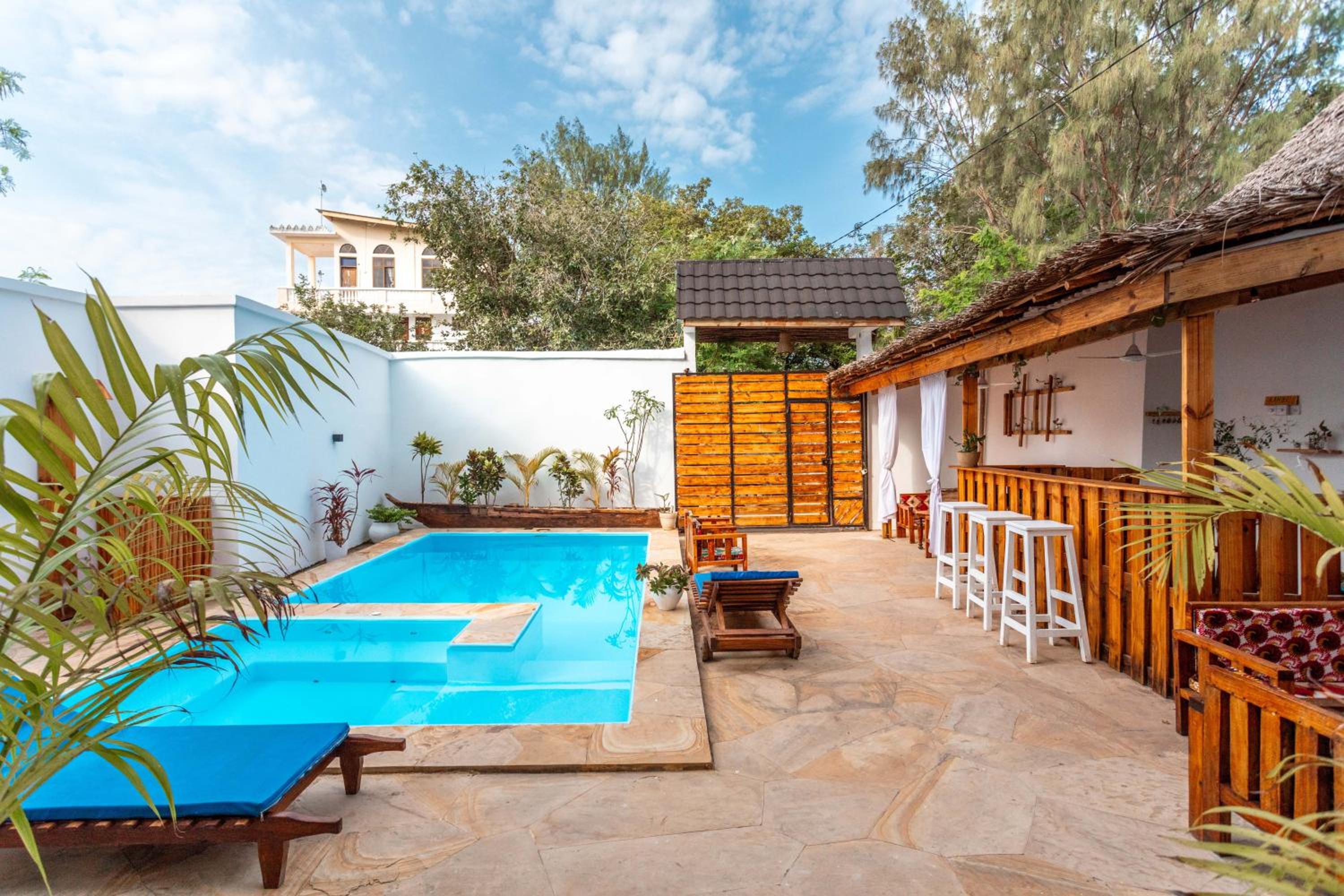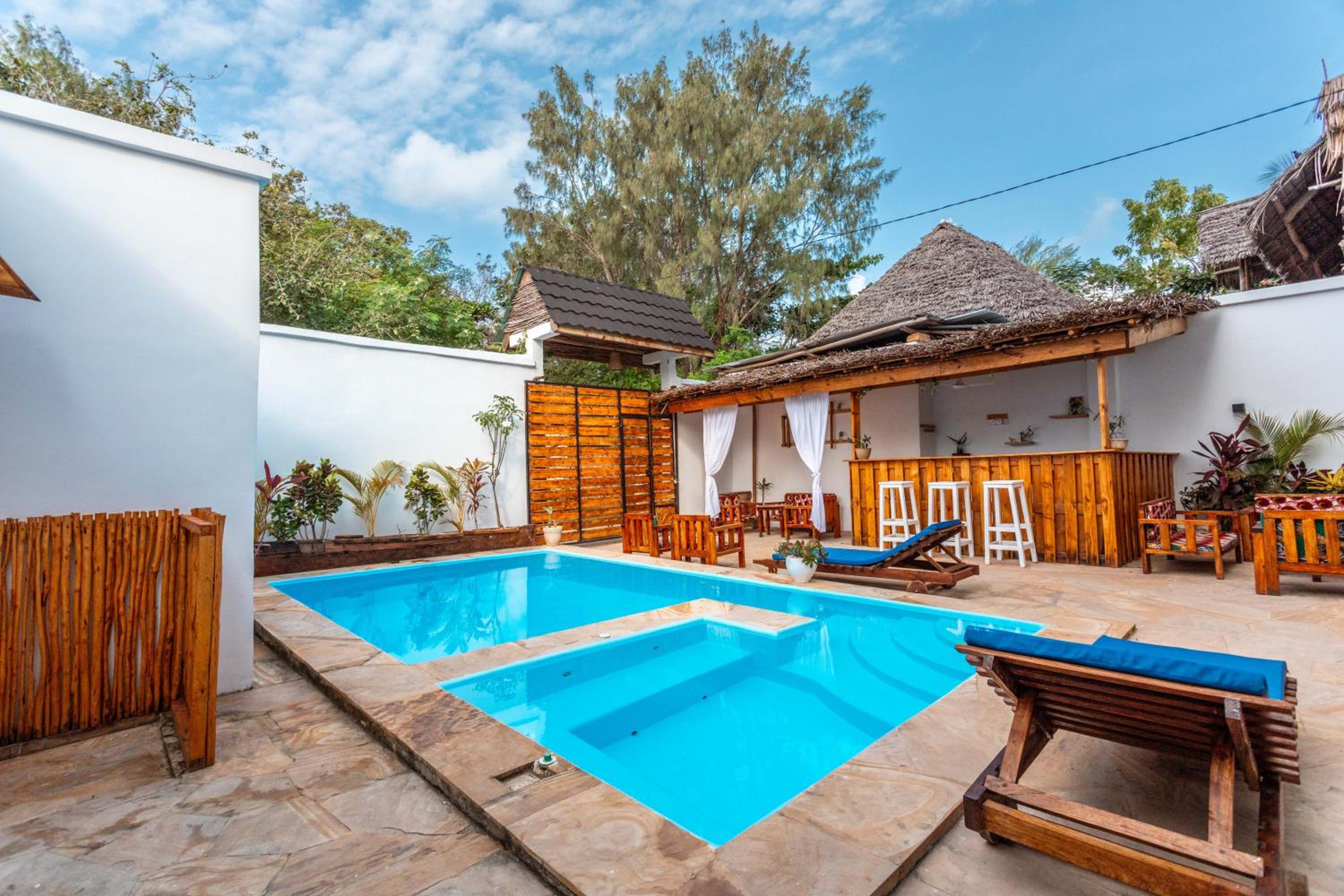 Unwind by the outdoor swimming pool, stroll through the garden, or lounge in the shared lounge area for a tranquil retreat in the heart of Jambiani.