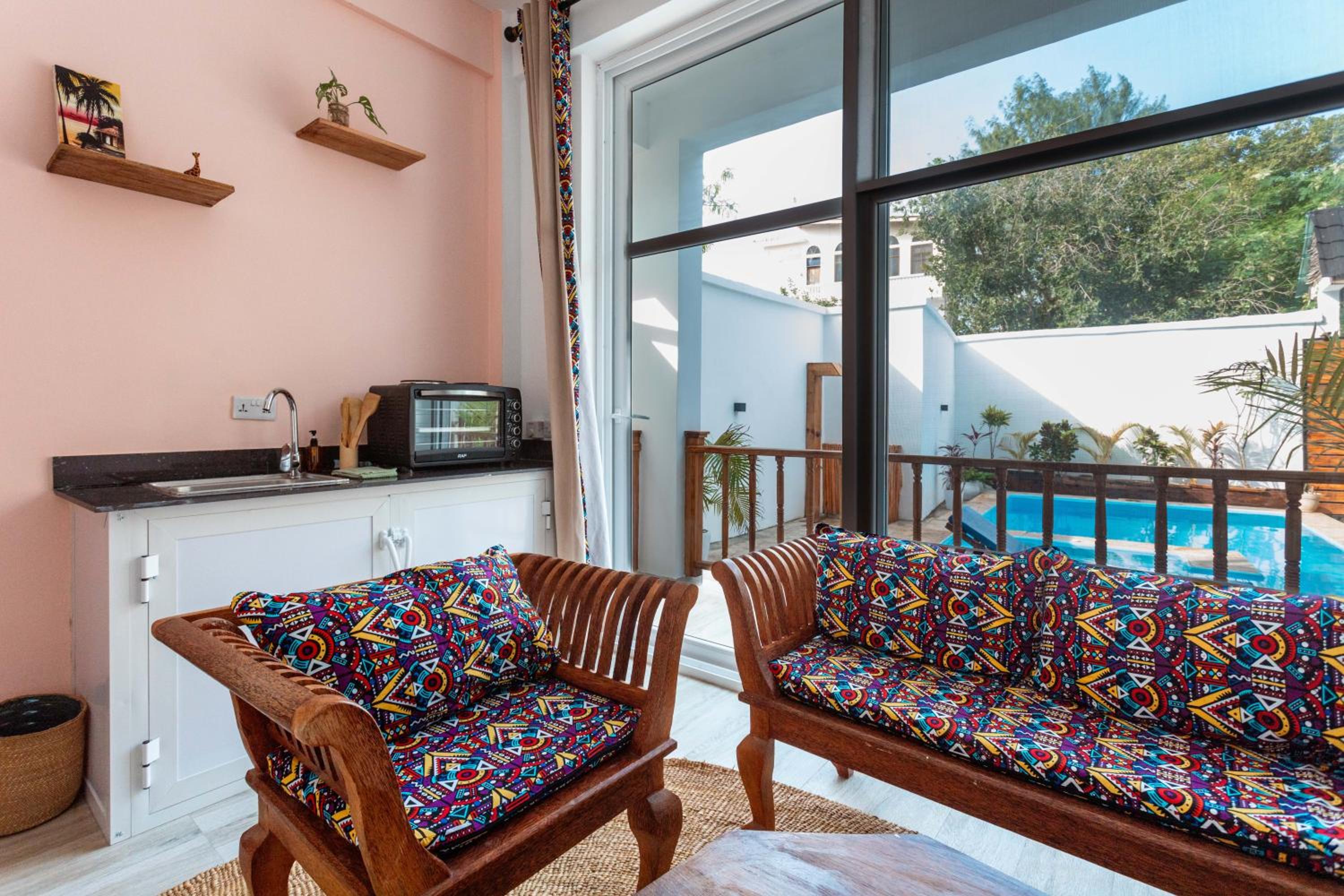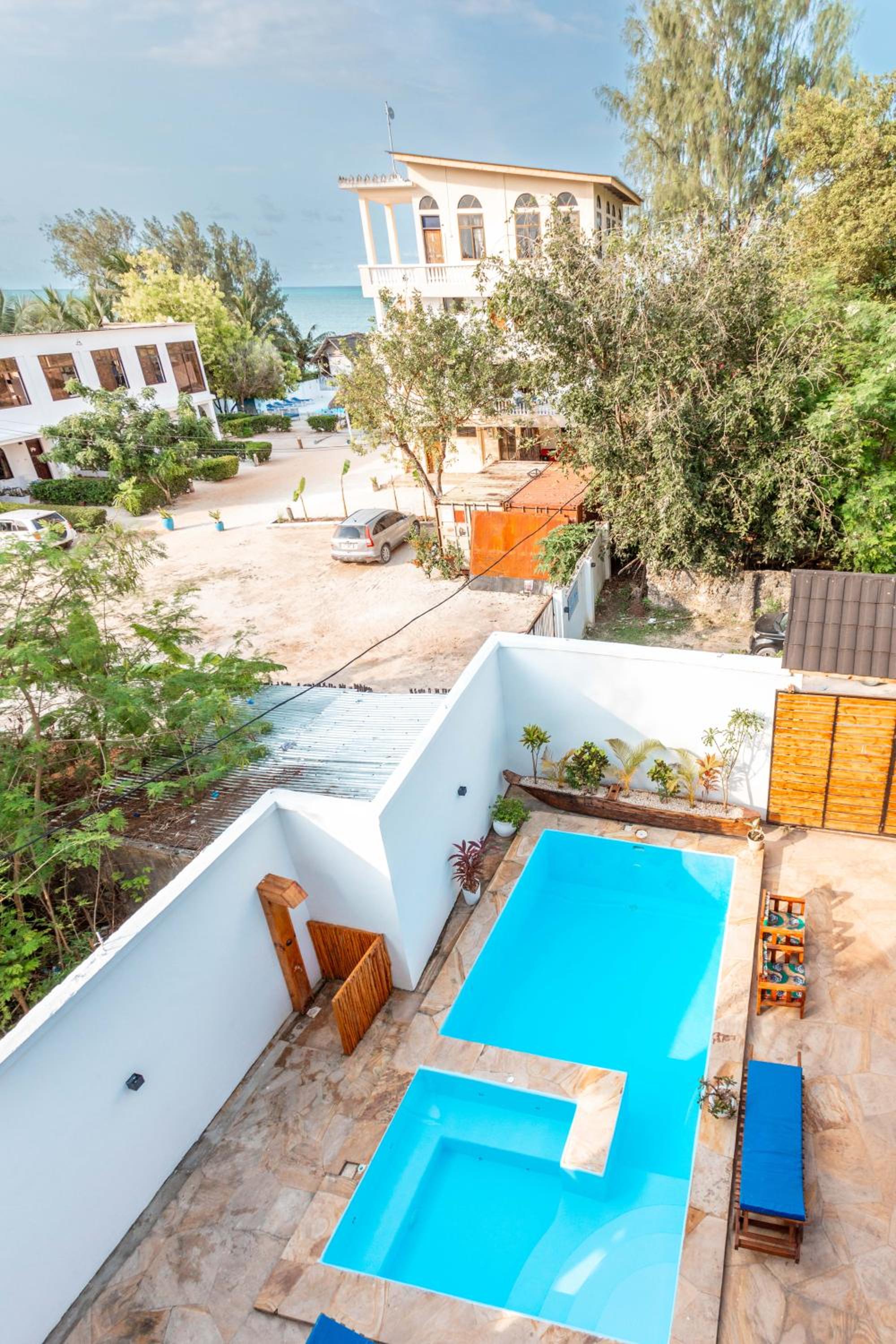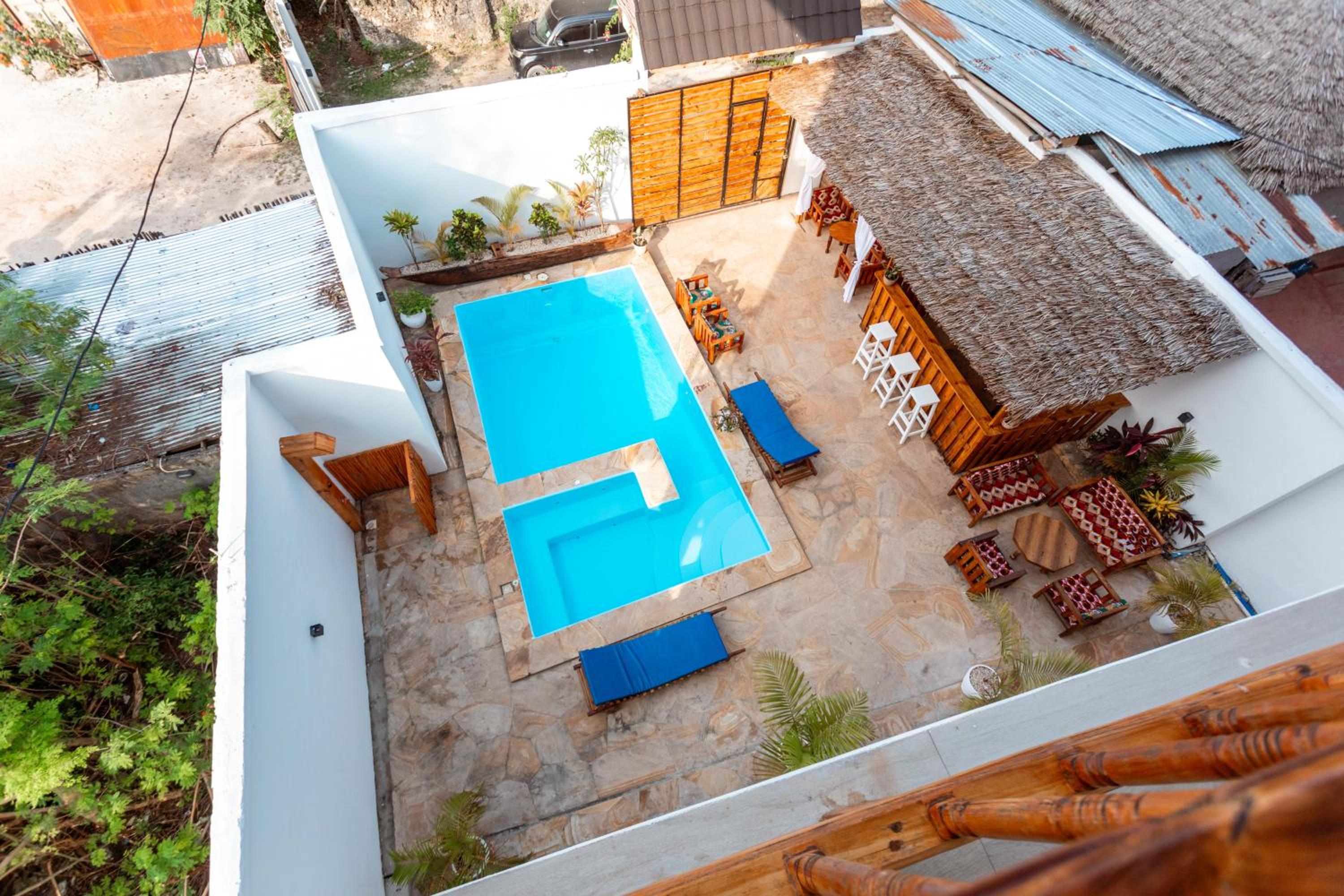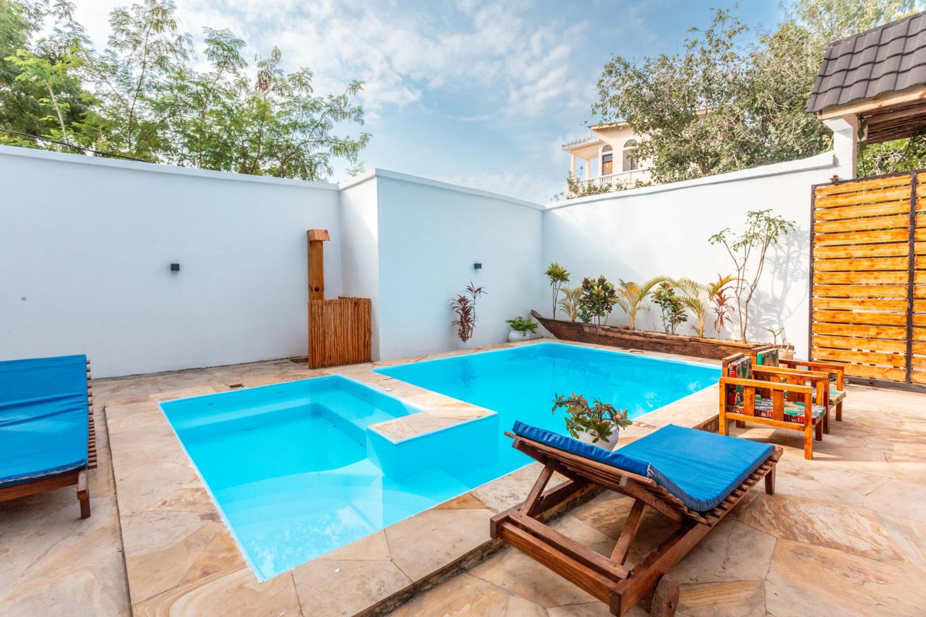 Unwind by the outdoor swimming pool, stroll through the garden, or lounge in the shared lounge area for a tranquil retreat in the heart of Jambiani.