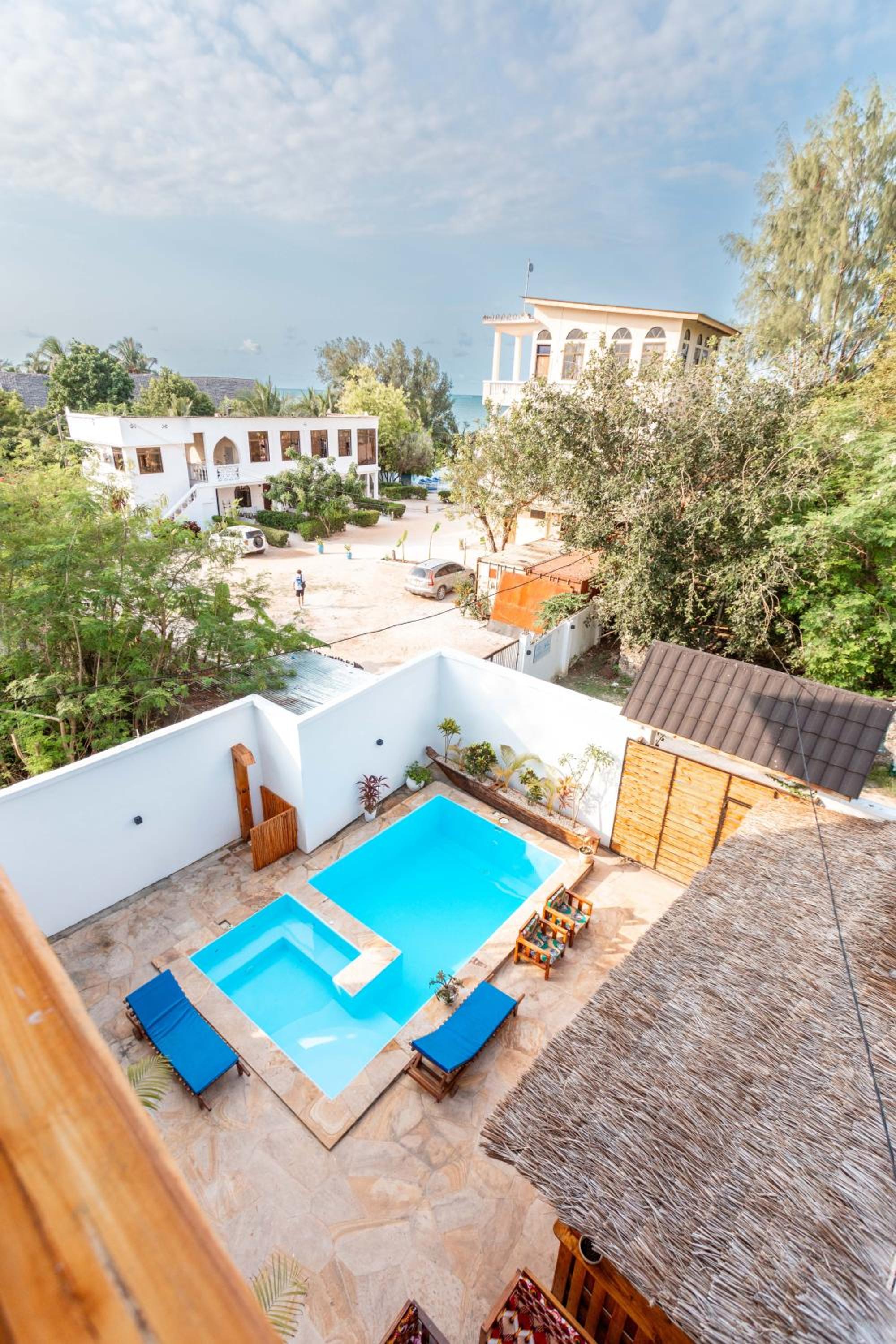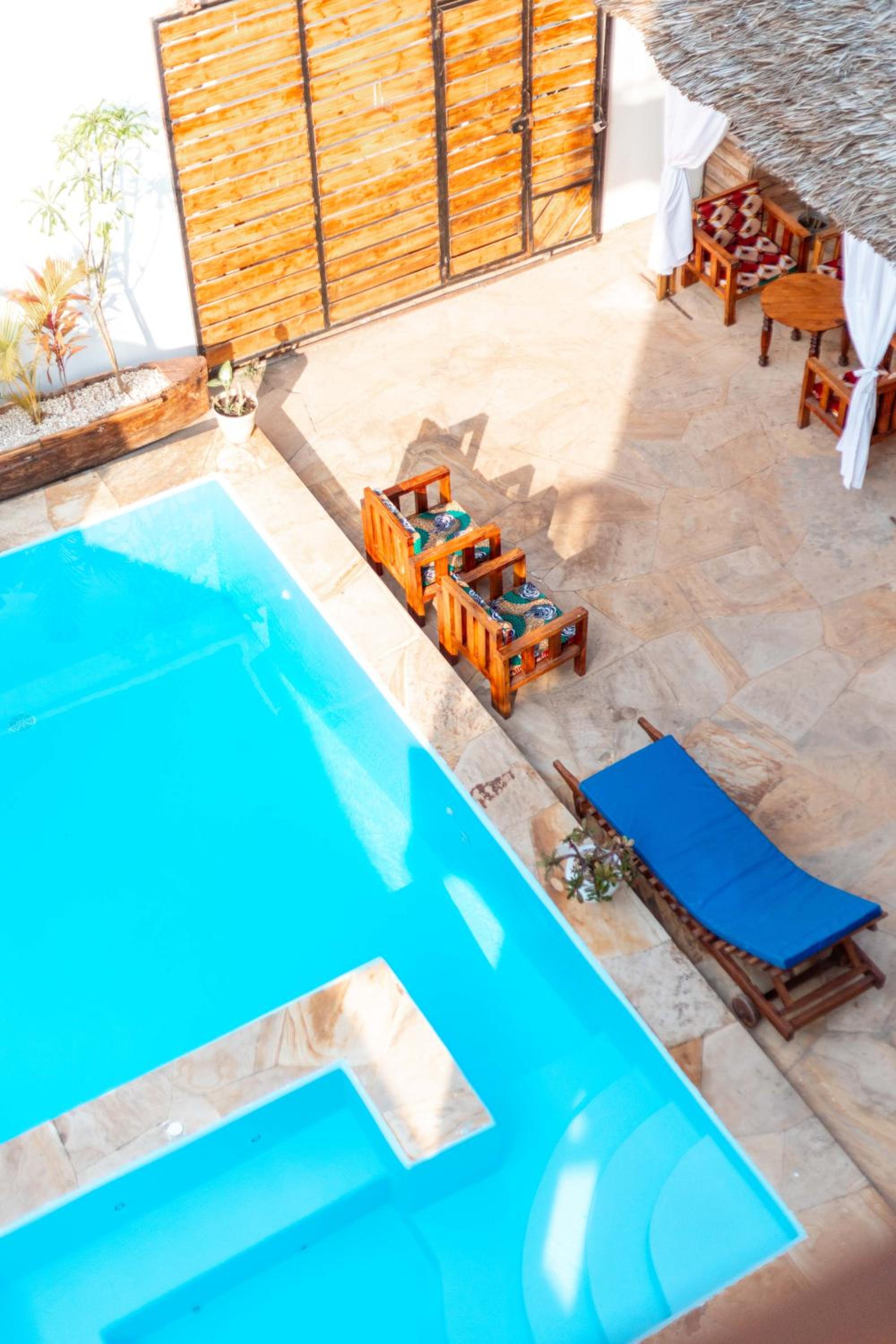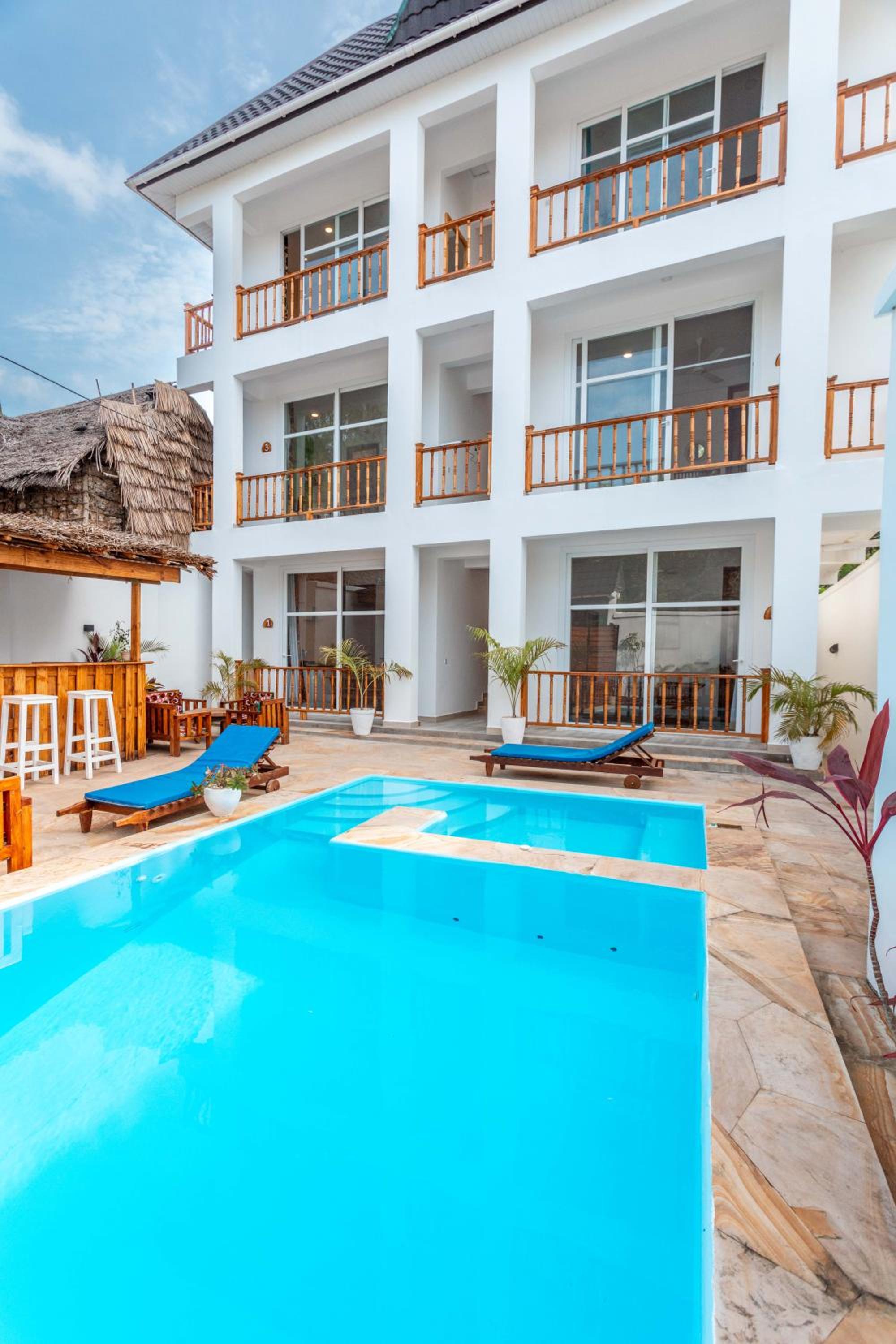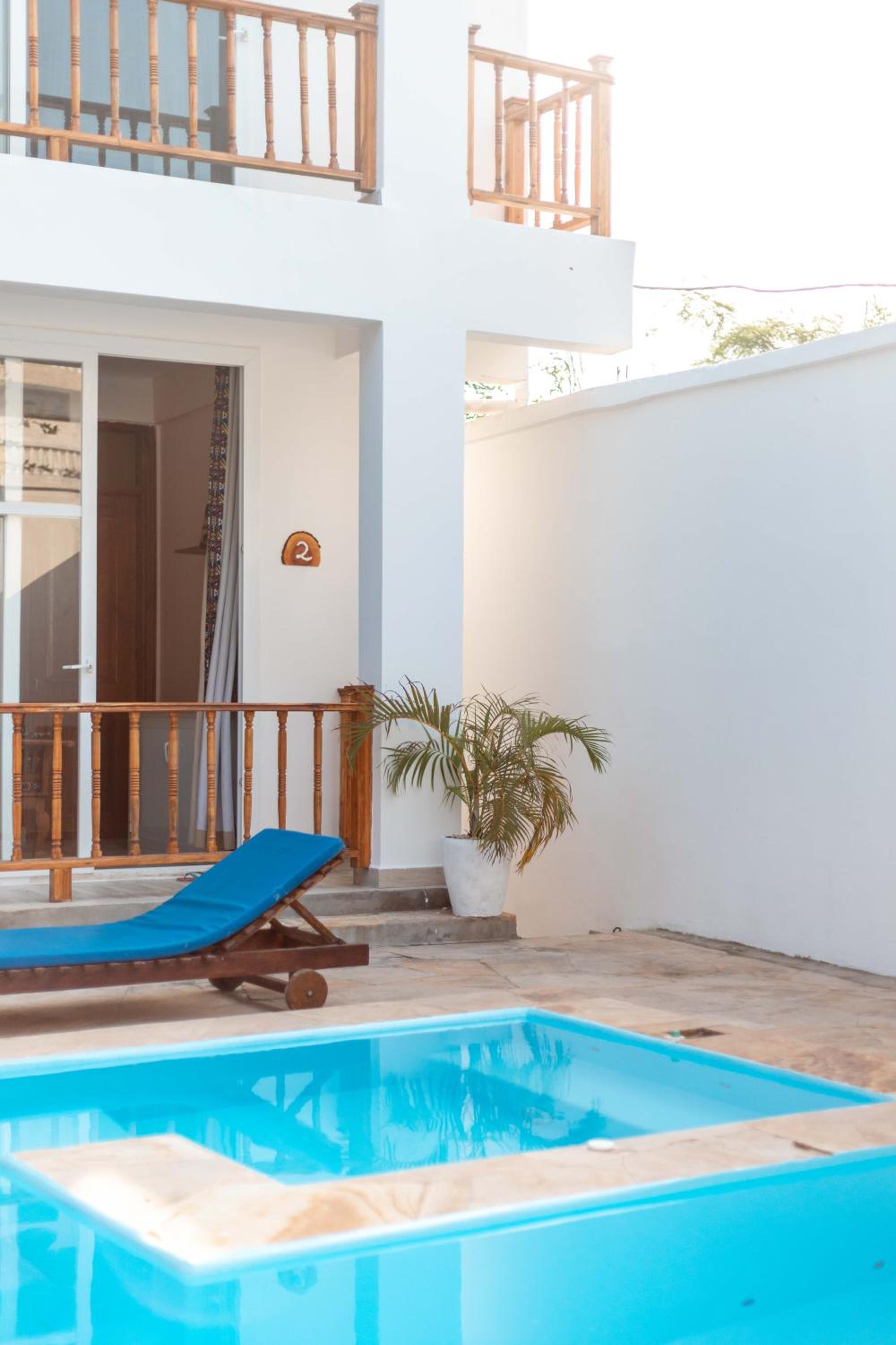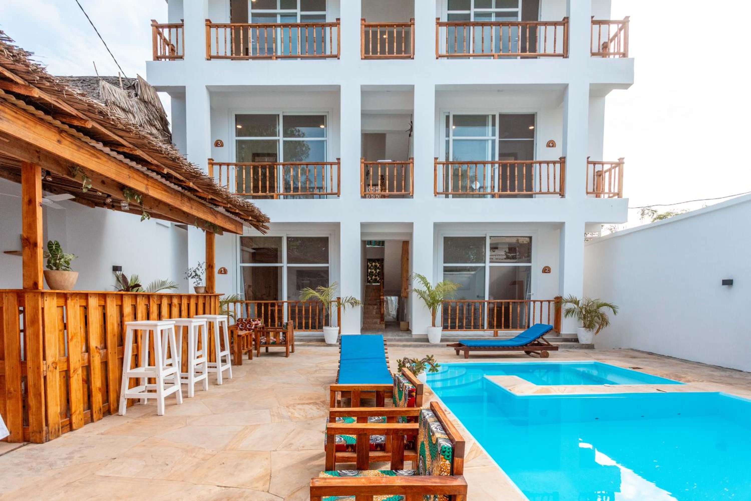Unwind by the outdoor swimming pool, stroll through the garden, or lounge in the shared lounge area for a tranquil retreat in the heart of Jambiani.