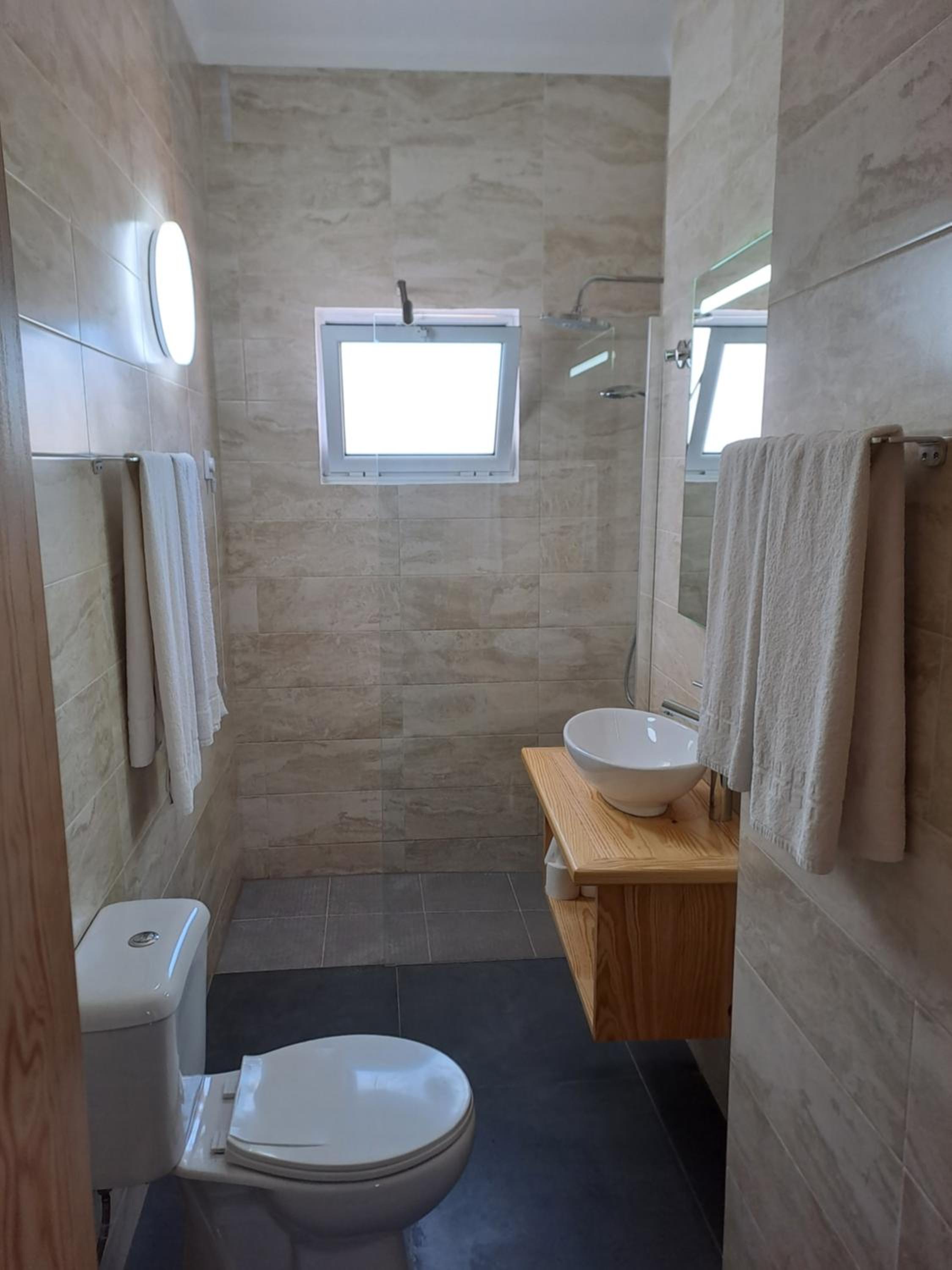 Badkamer in een soort kast. Wc kon je nauwelijks op zitten zo smal