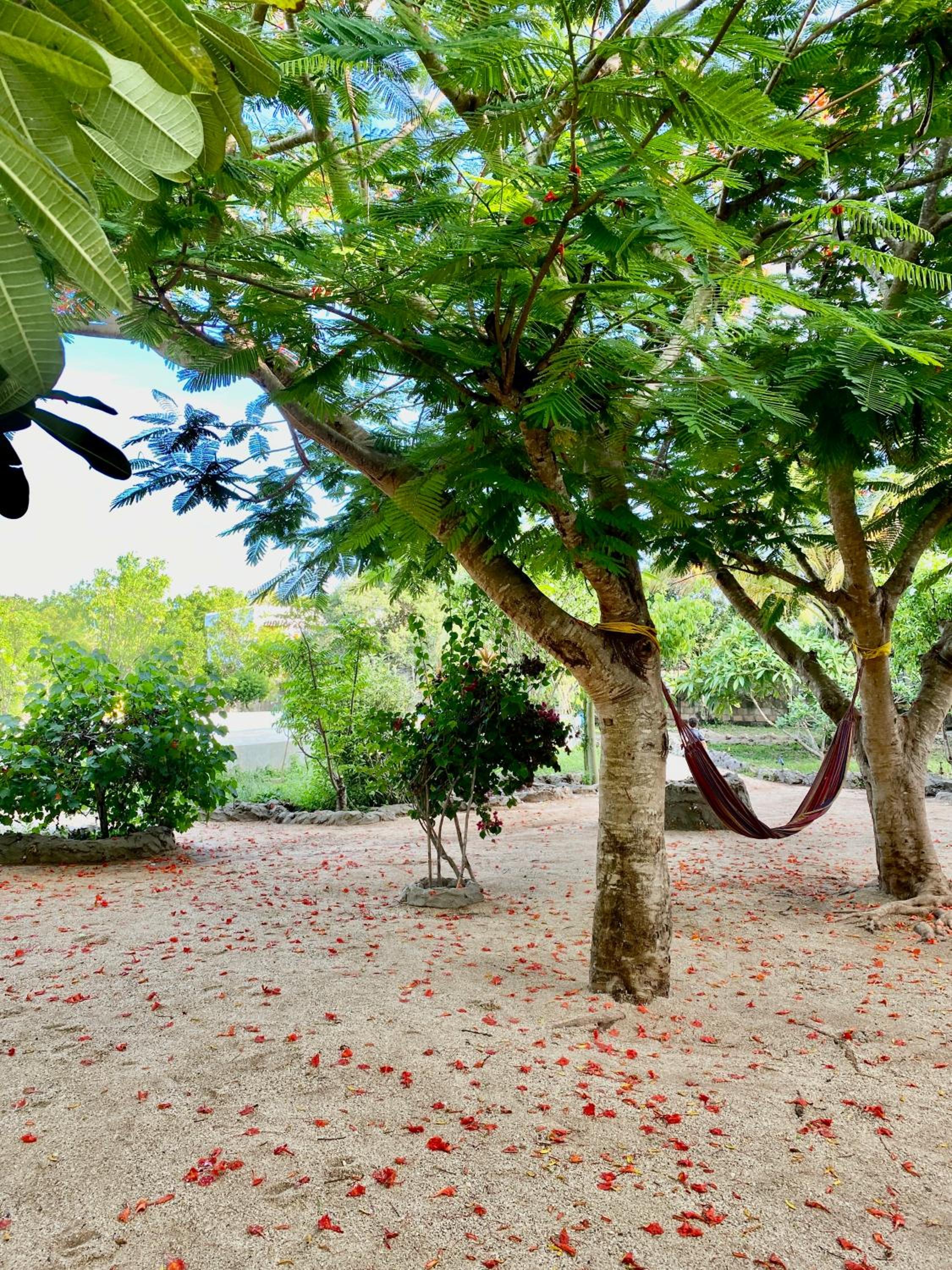 Het geheel ligt heel rustig in een tuin met zwembad. Wij hadden twee driepersoons kamers en die waren allebei op de begane grond, met genoeg ruimte en ook een klein zitje voor de kamer. Er is een restaurant dat helaas op de dag van onze aankomst gesloten bleek te zijn, maar Kameleon Blue, zit er direct naast en zij hebben een prima restaurant. De tweede dag hebben we wel een drankje kunnen drinken en prima gegeten.