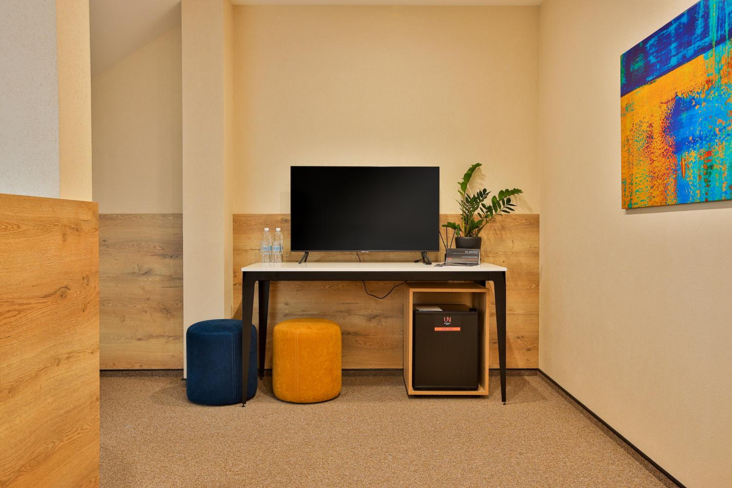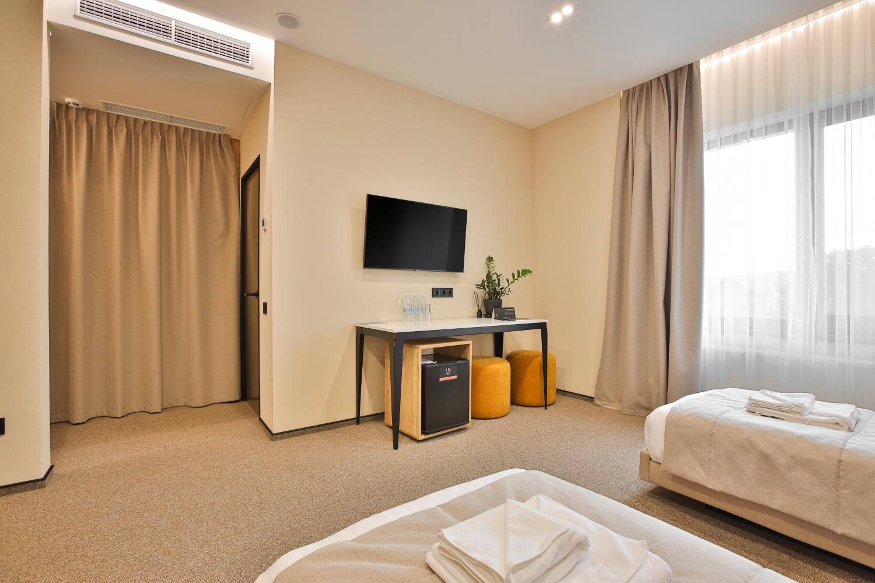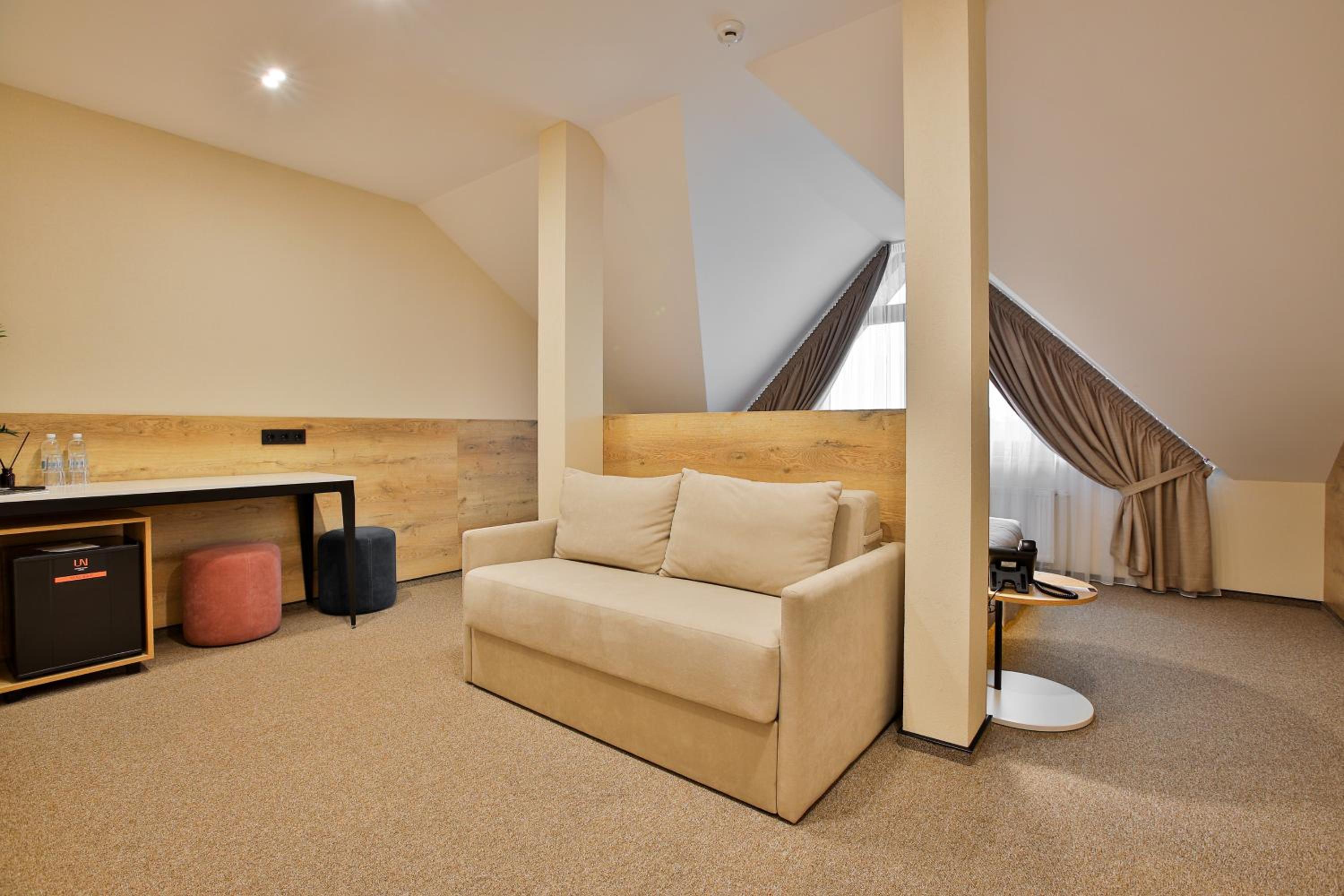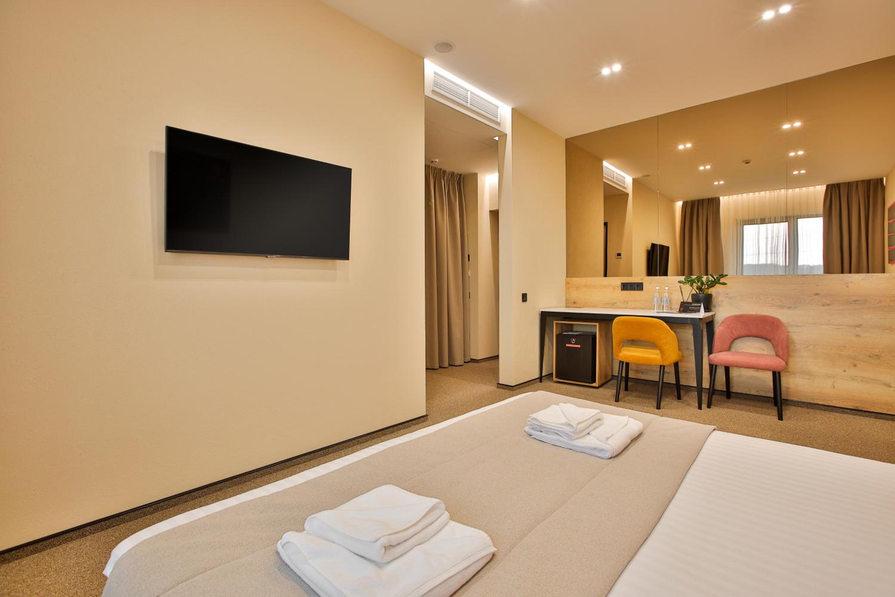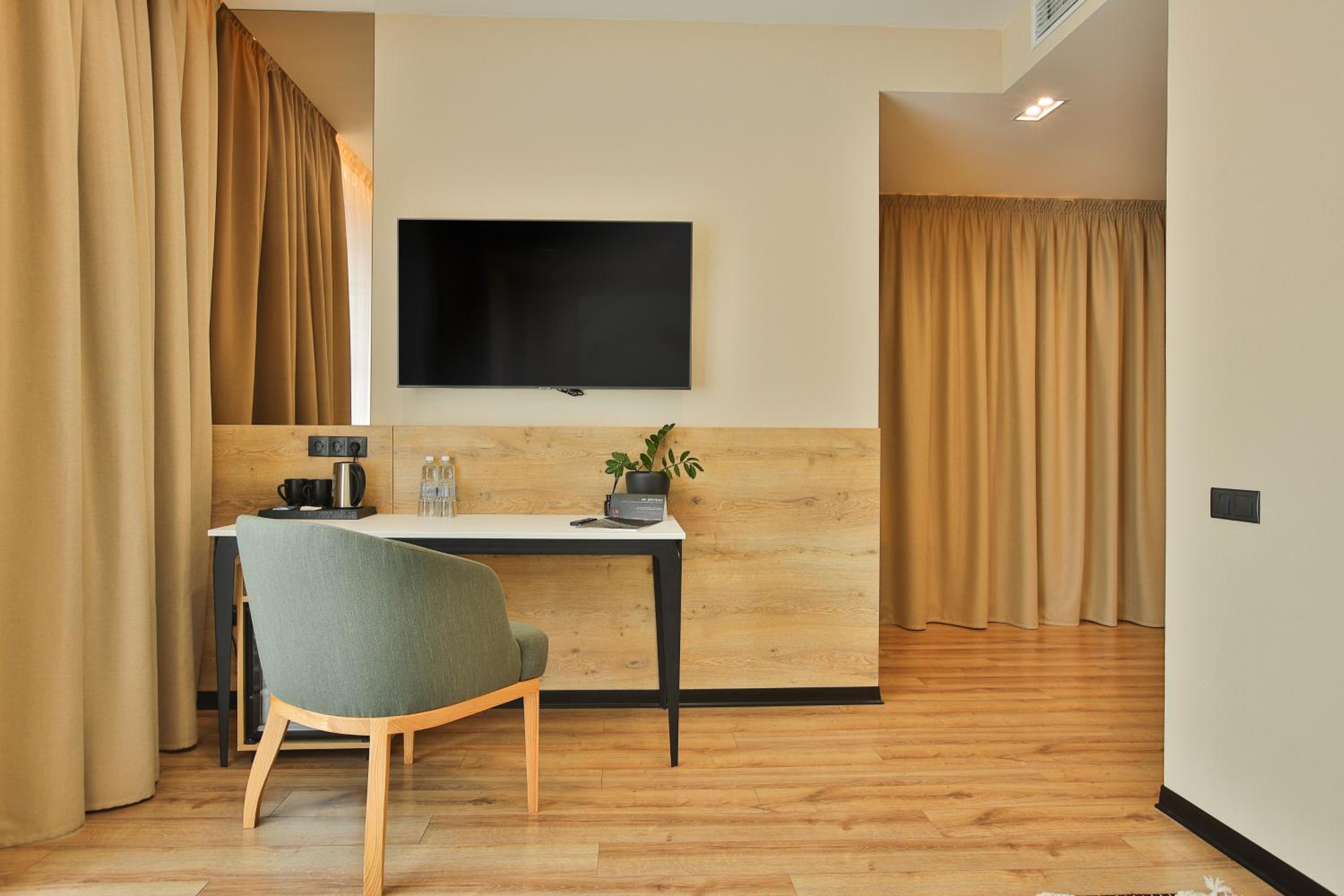 сучасний дизайн, просторий номер з балконом. величезне зручне ліжко, все чисто, зручний диван, два телевізора з інтернетом( ютуб і т.д) наявність хоч і не великого але спа, поруч андерхіл парк
