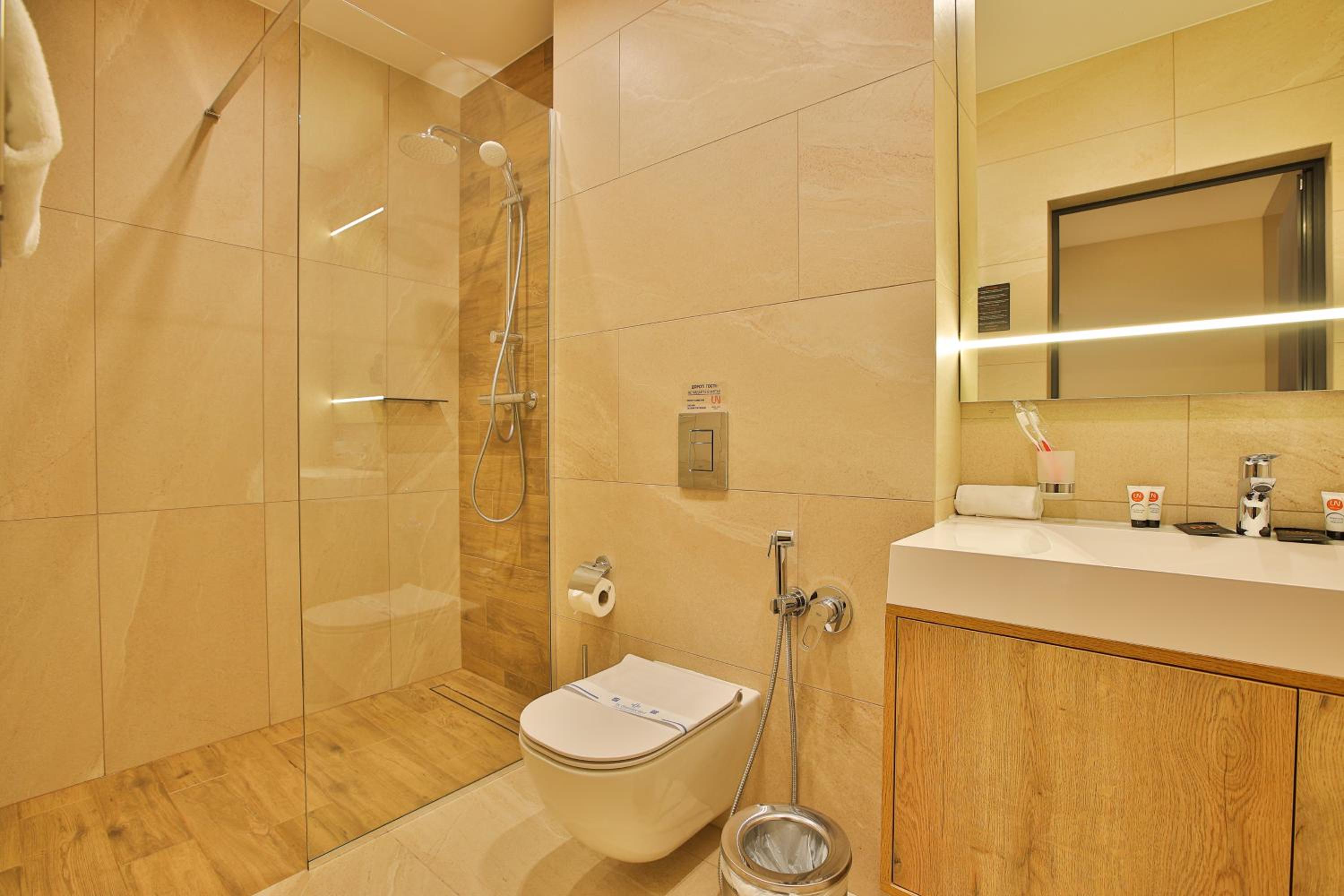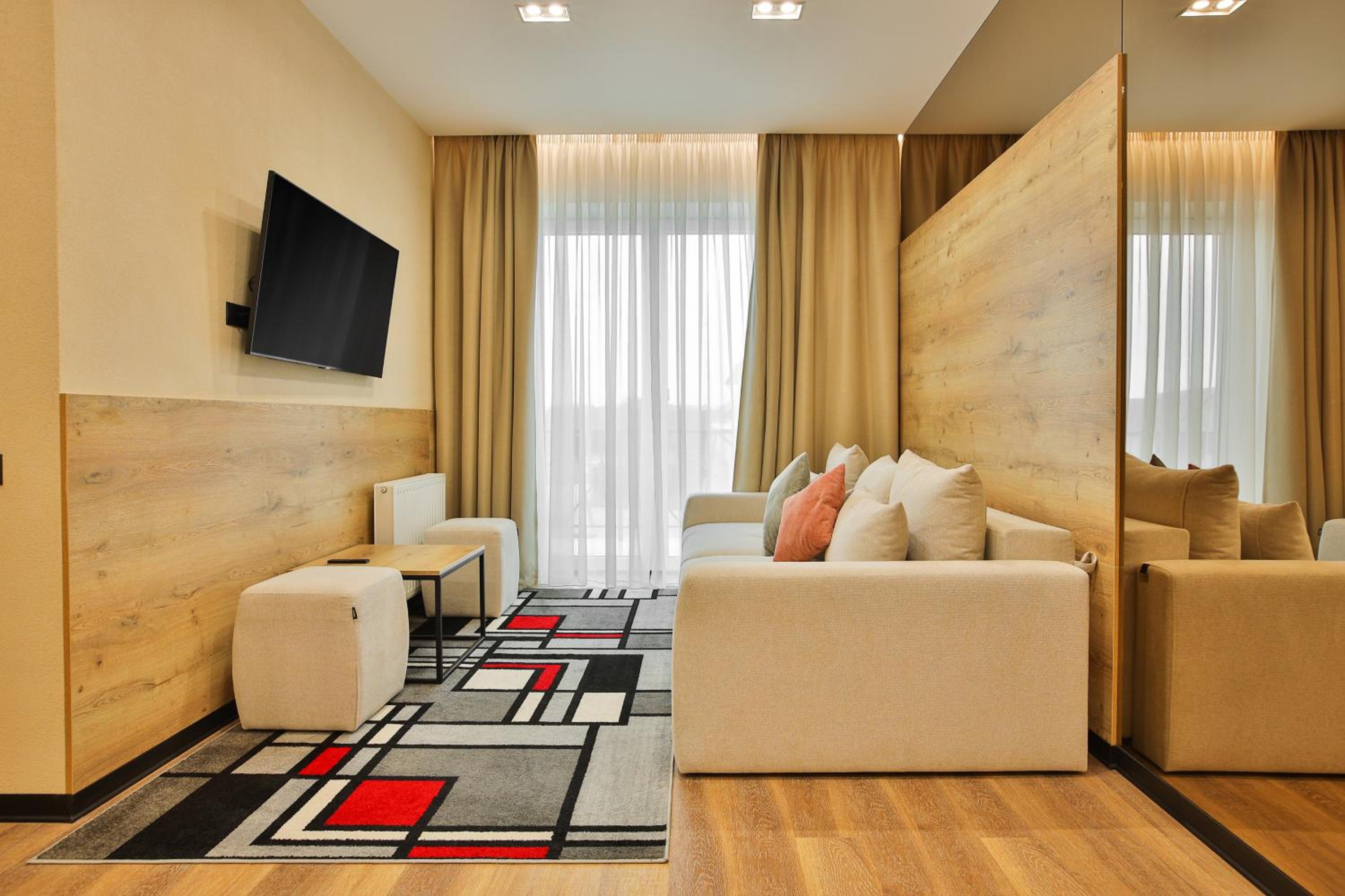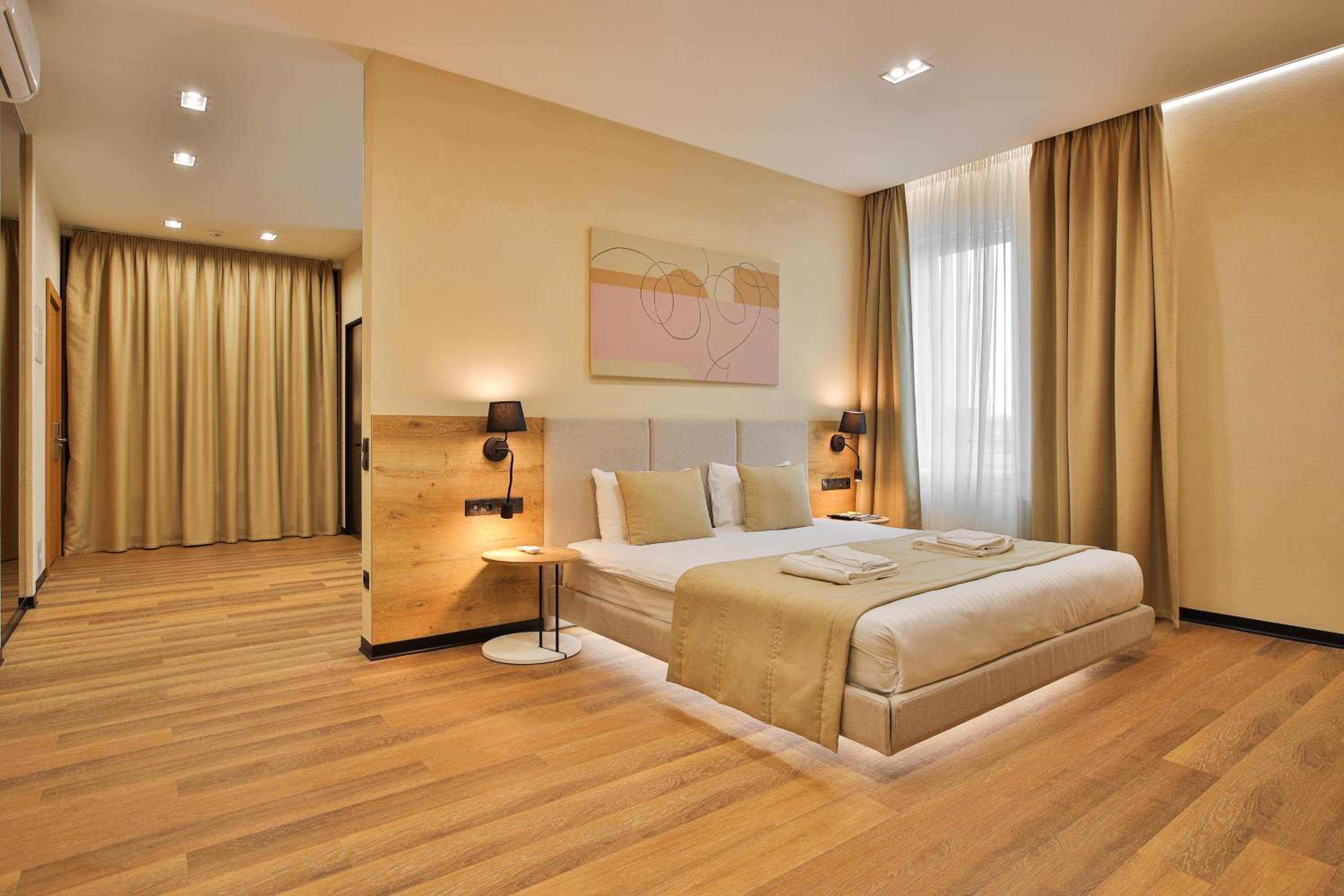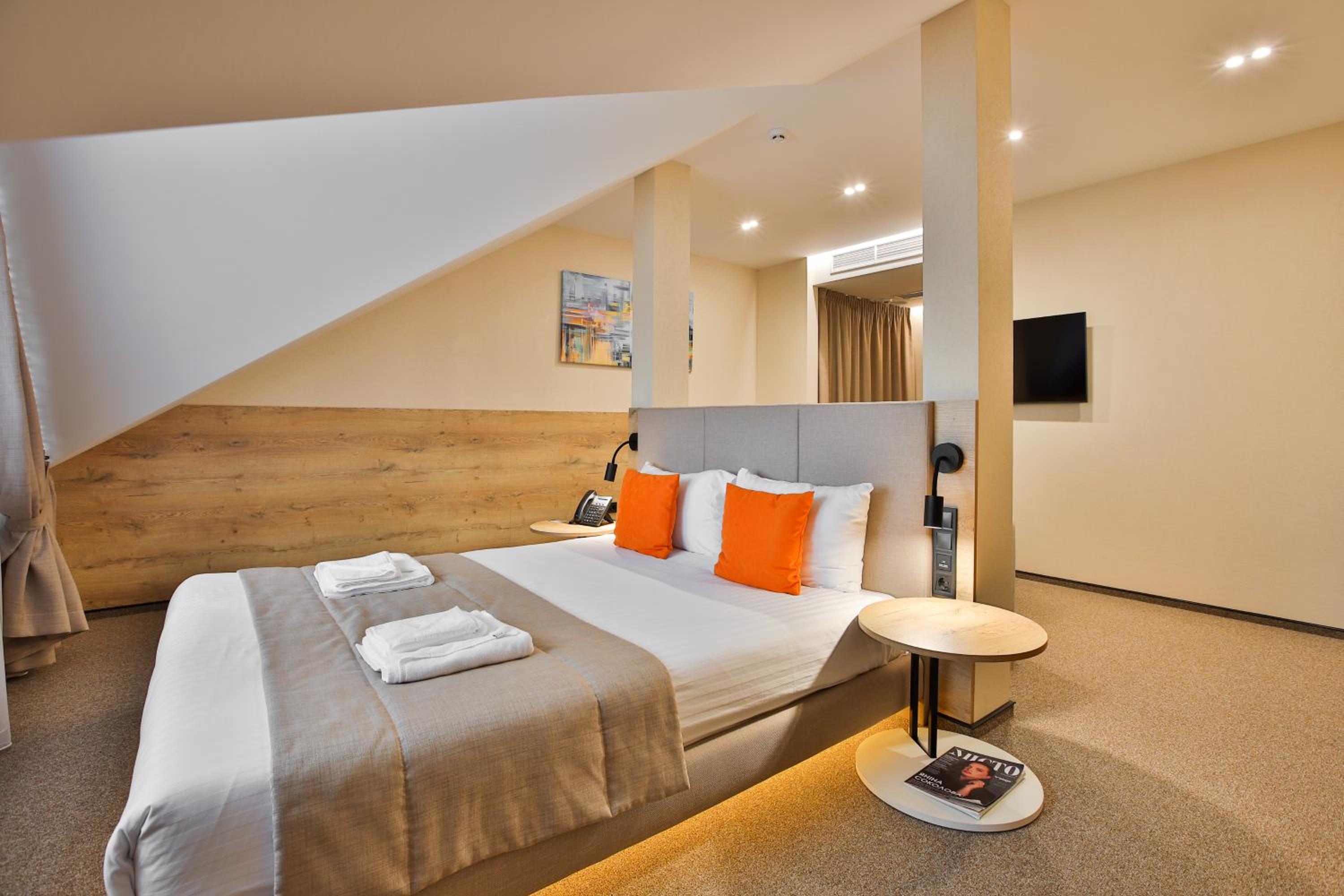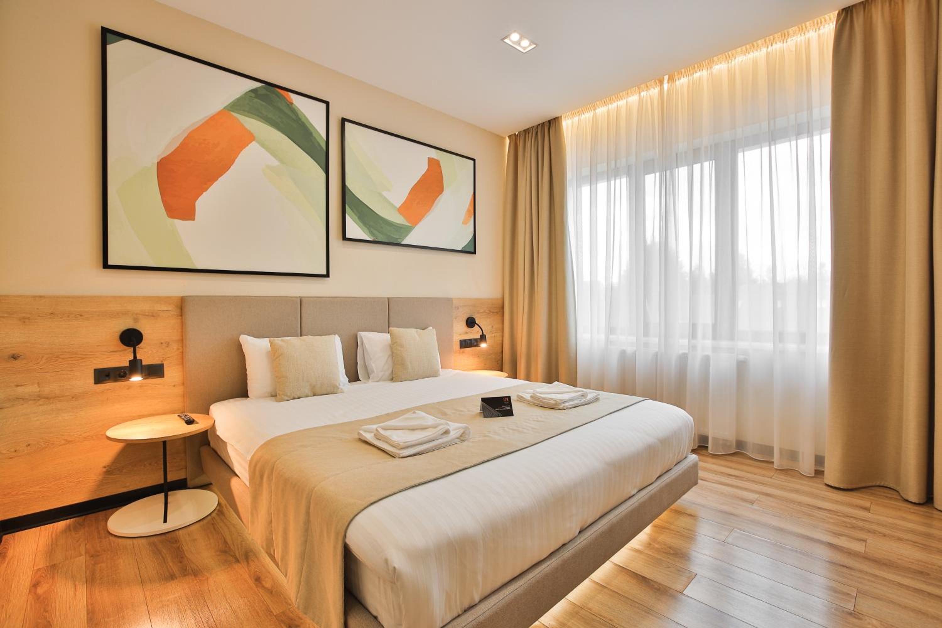 сучасний дизайн, просторий номер з балконом. величезне зручне ліжко, все чисто, зручний диван, два телевізора з інтернетом( ютуб і т.д) наявність хоч і не великого але спа, поруч андерхіл парк