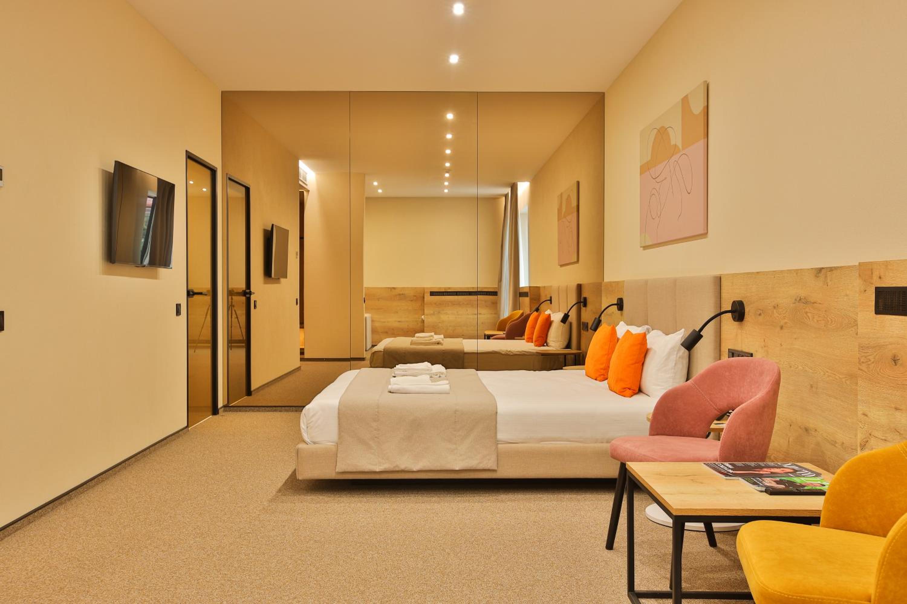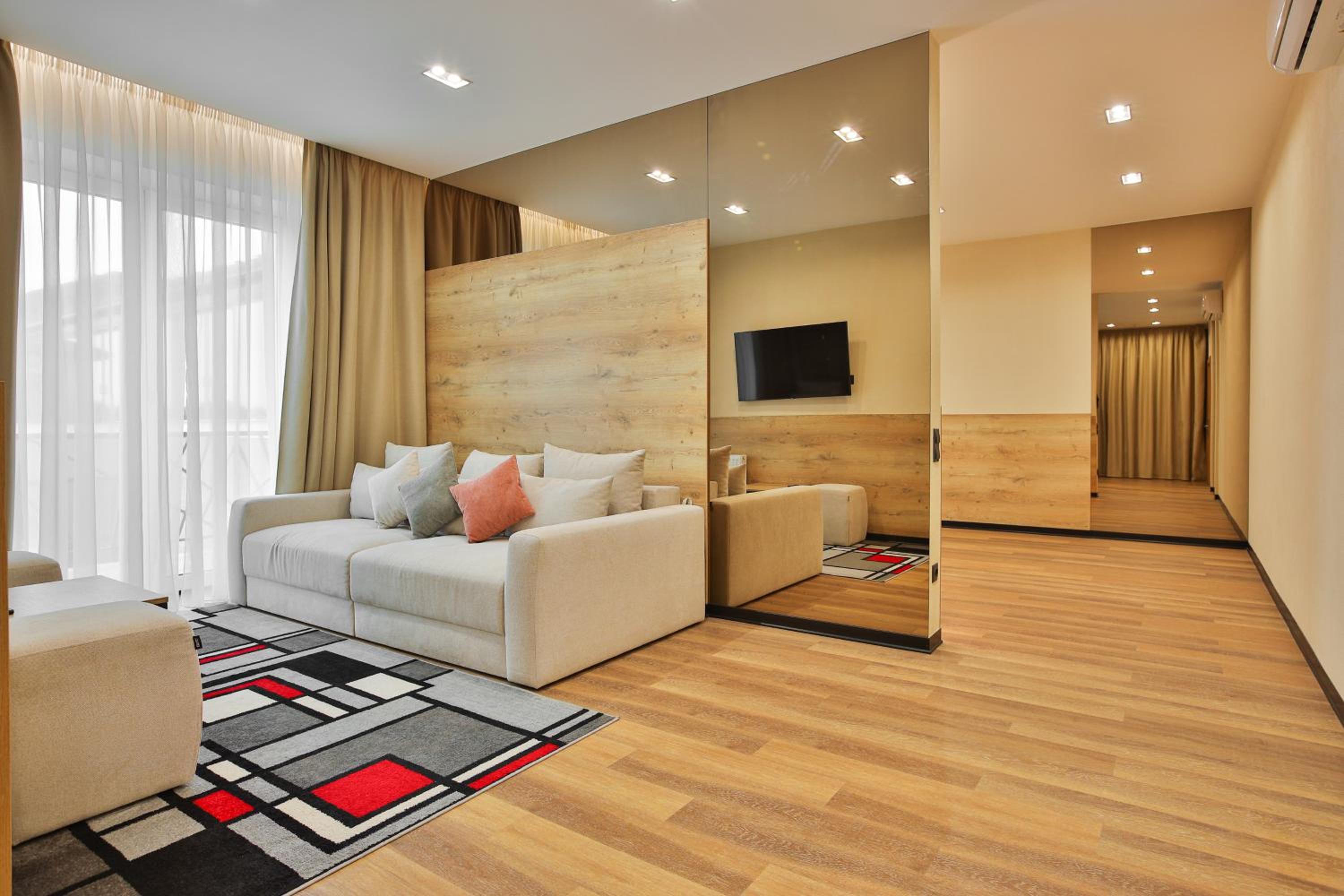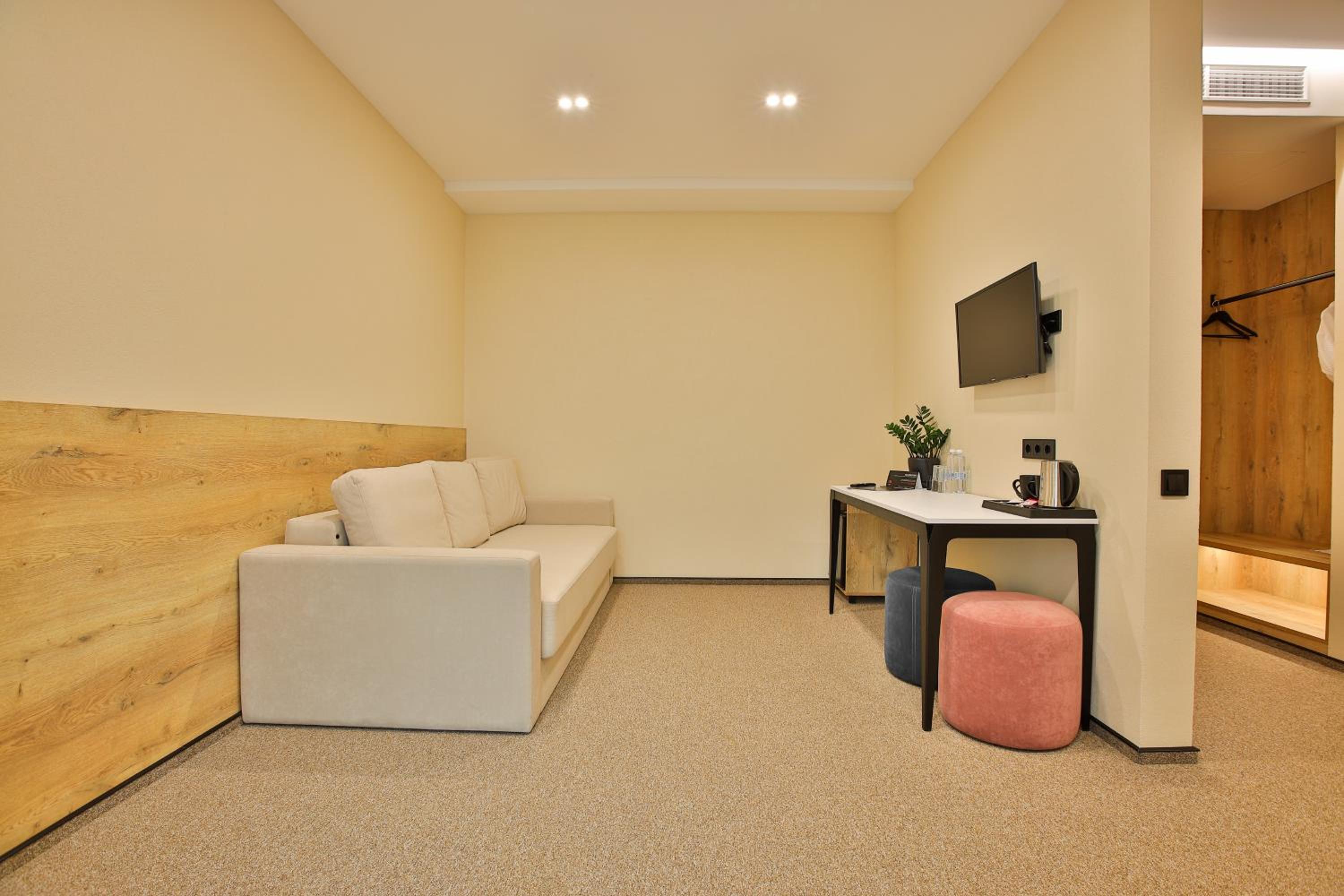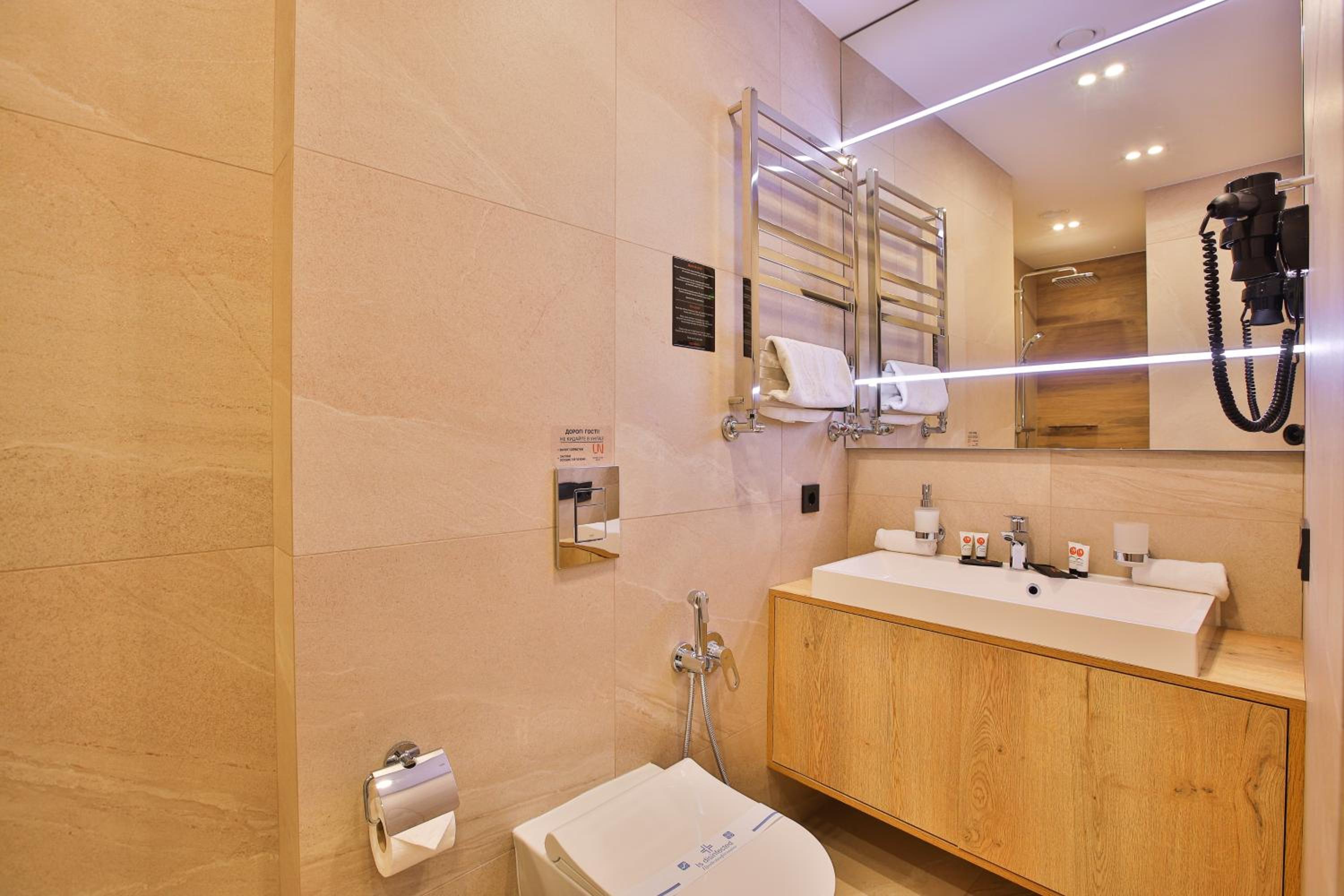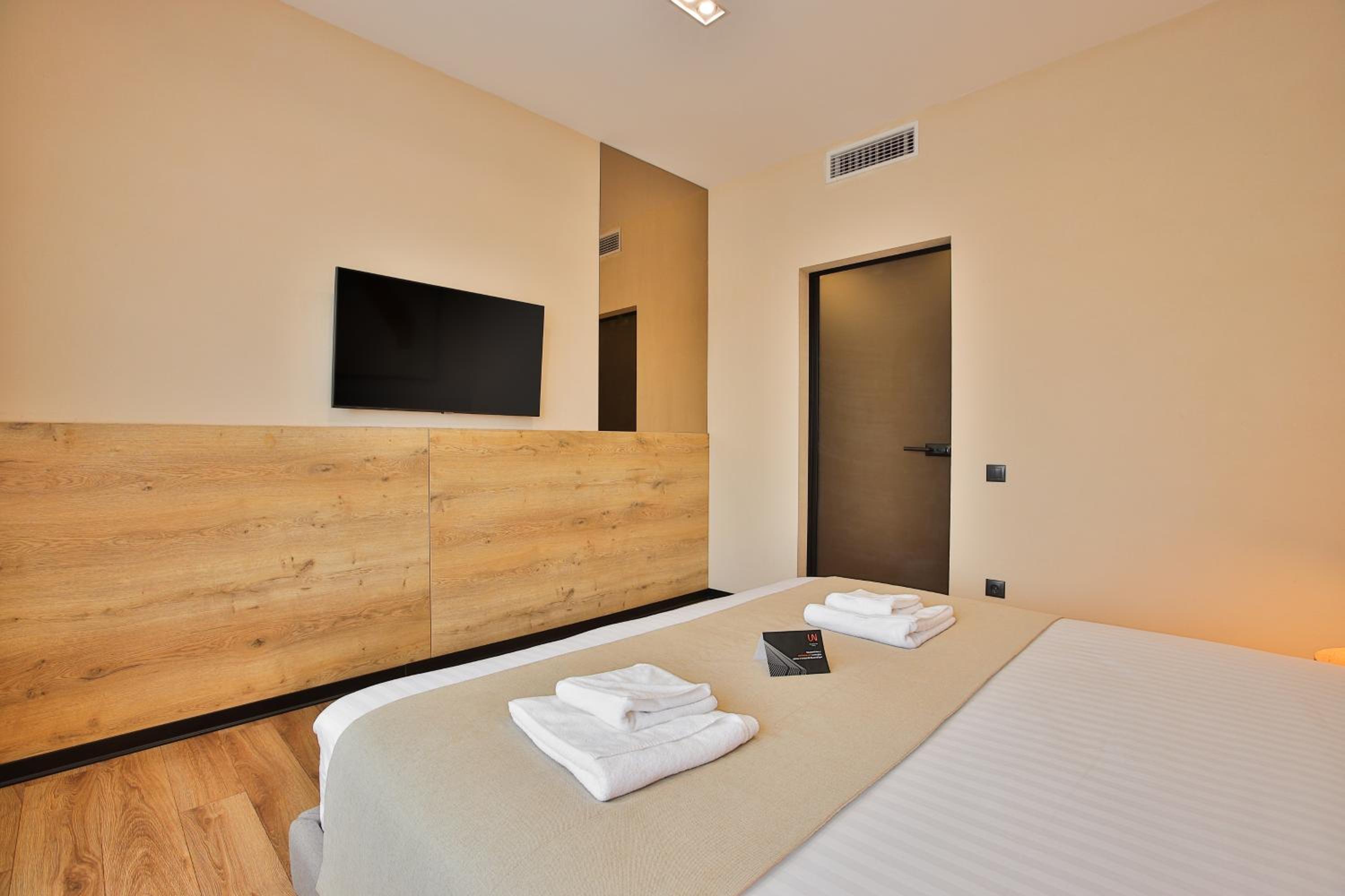 сучасний дизайн, просторий номер з балконом. величезне зручне ліжко, все чисто, зручний диван, два телевізора з інтернетом( ютуб і т.д) наявність хоч і не великого але спа, поруч андерхіл парк
