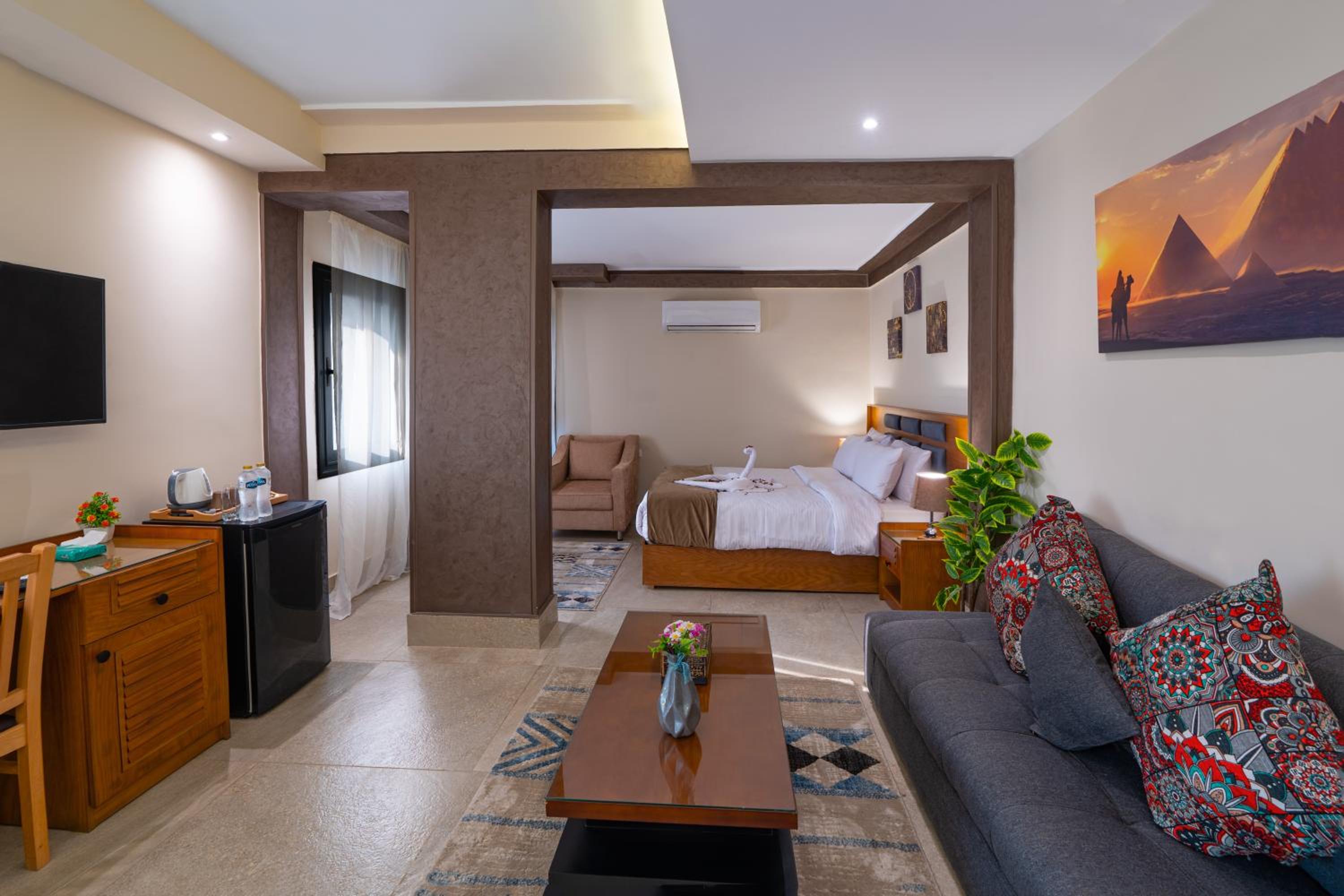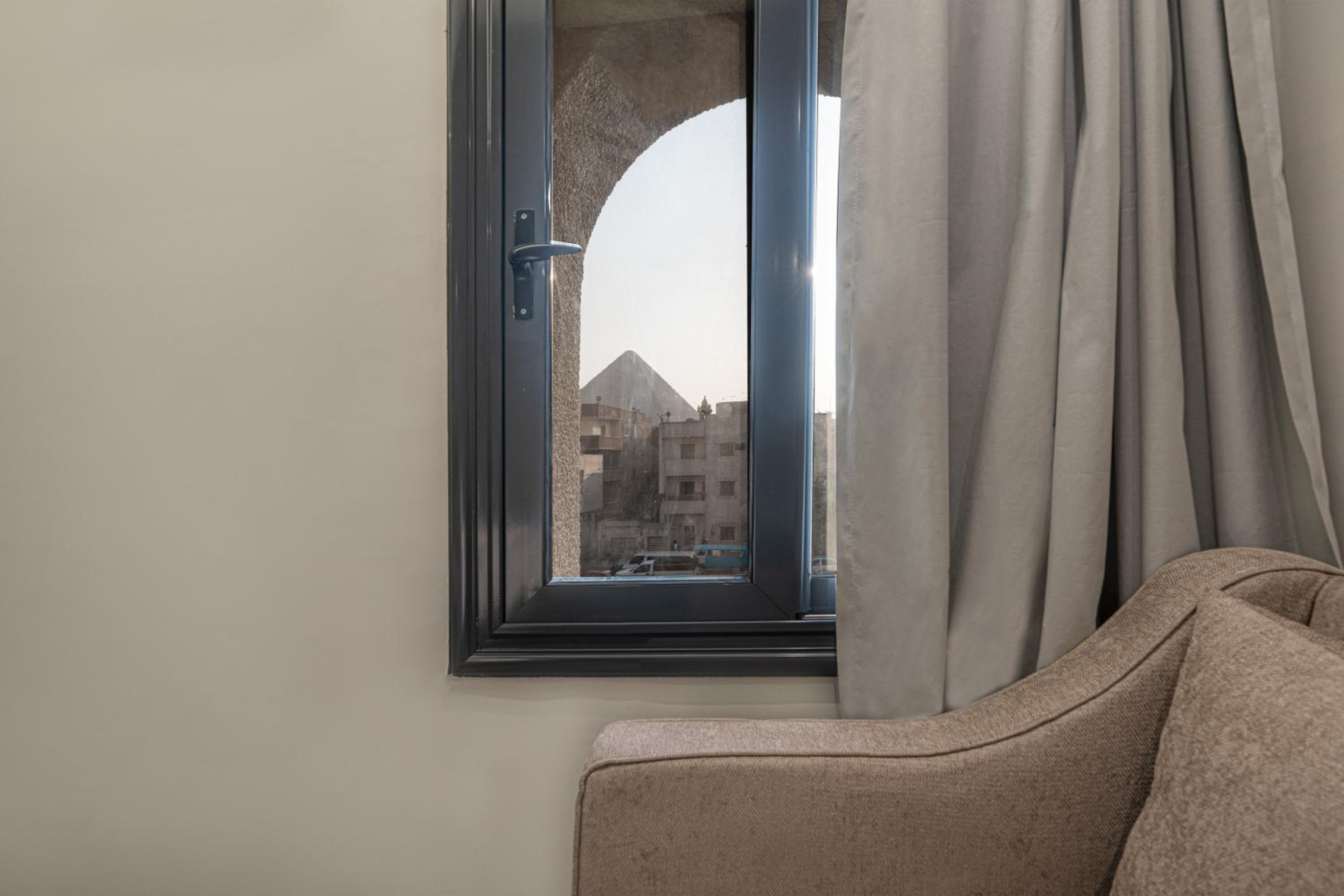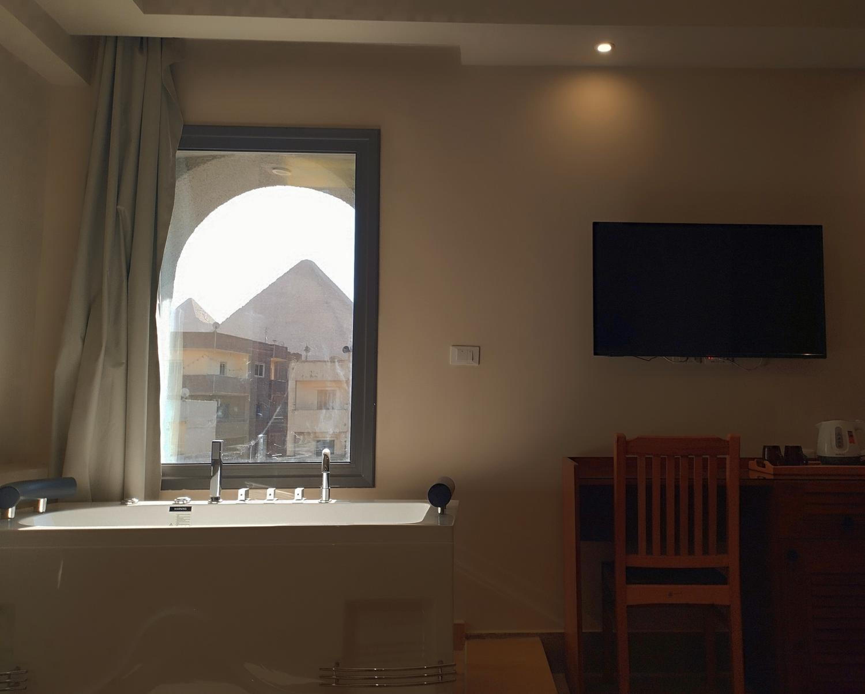 Me gustó la vista que tiene hacia las piramides. Eso es lo mejor. Las habitaciones son grandes, espaciosas, están limpias y las camas son confortables. Tienen sillones en el interior para sentarse, así que las recomiendo. No tiene ascensores pero el personal es amable y nos ayudaron a subir las maletas al piso de la habitación. Es un negocio familiar y son todos muy simpaticos. El wifi funcionó bastante bien y cualquier duda que tuvimos nos ayudaron. Desde el lugar, estas a 10minutos en auto de Giza y a 12min del Museo GEM.