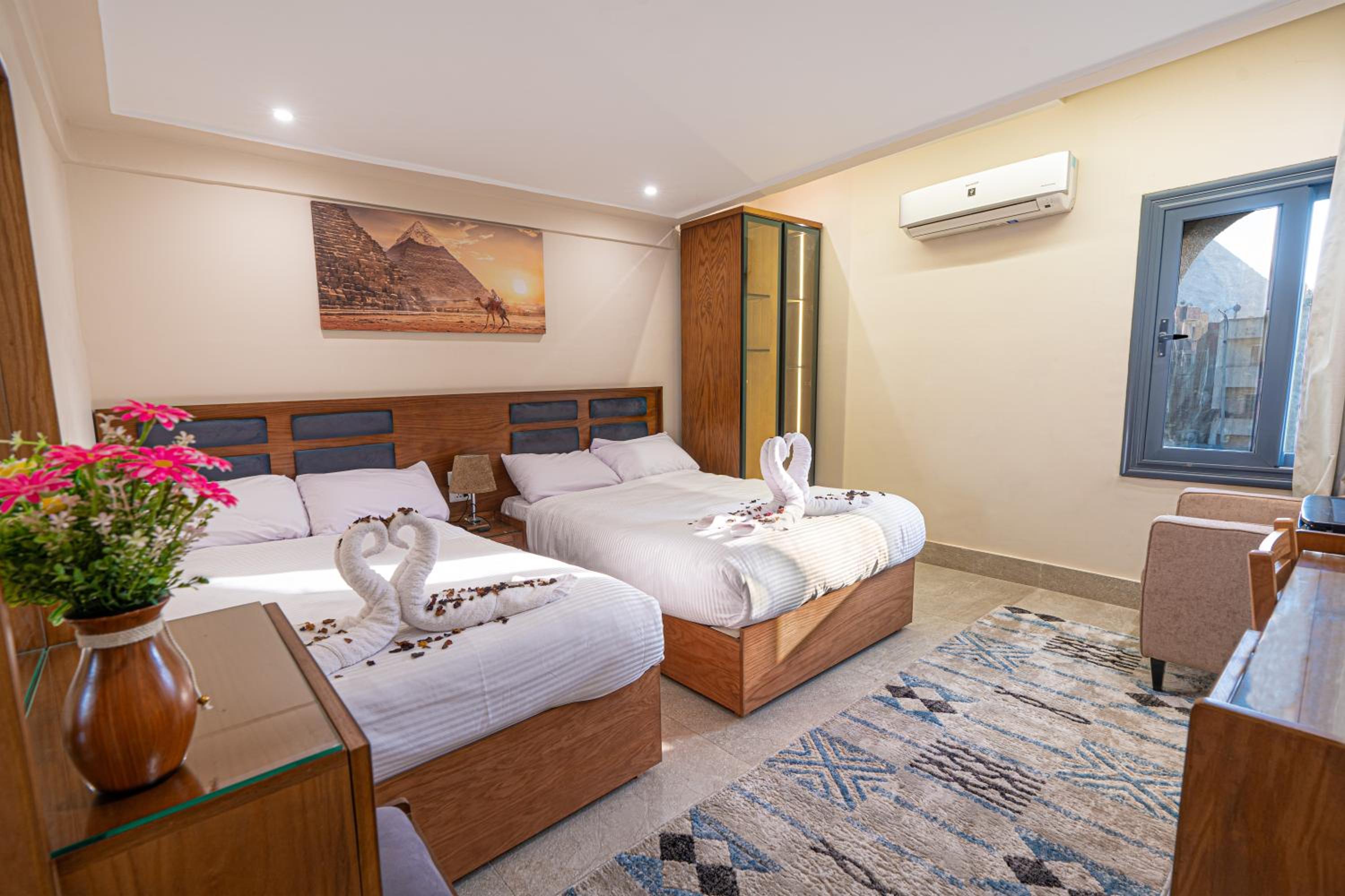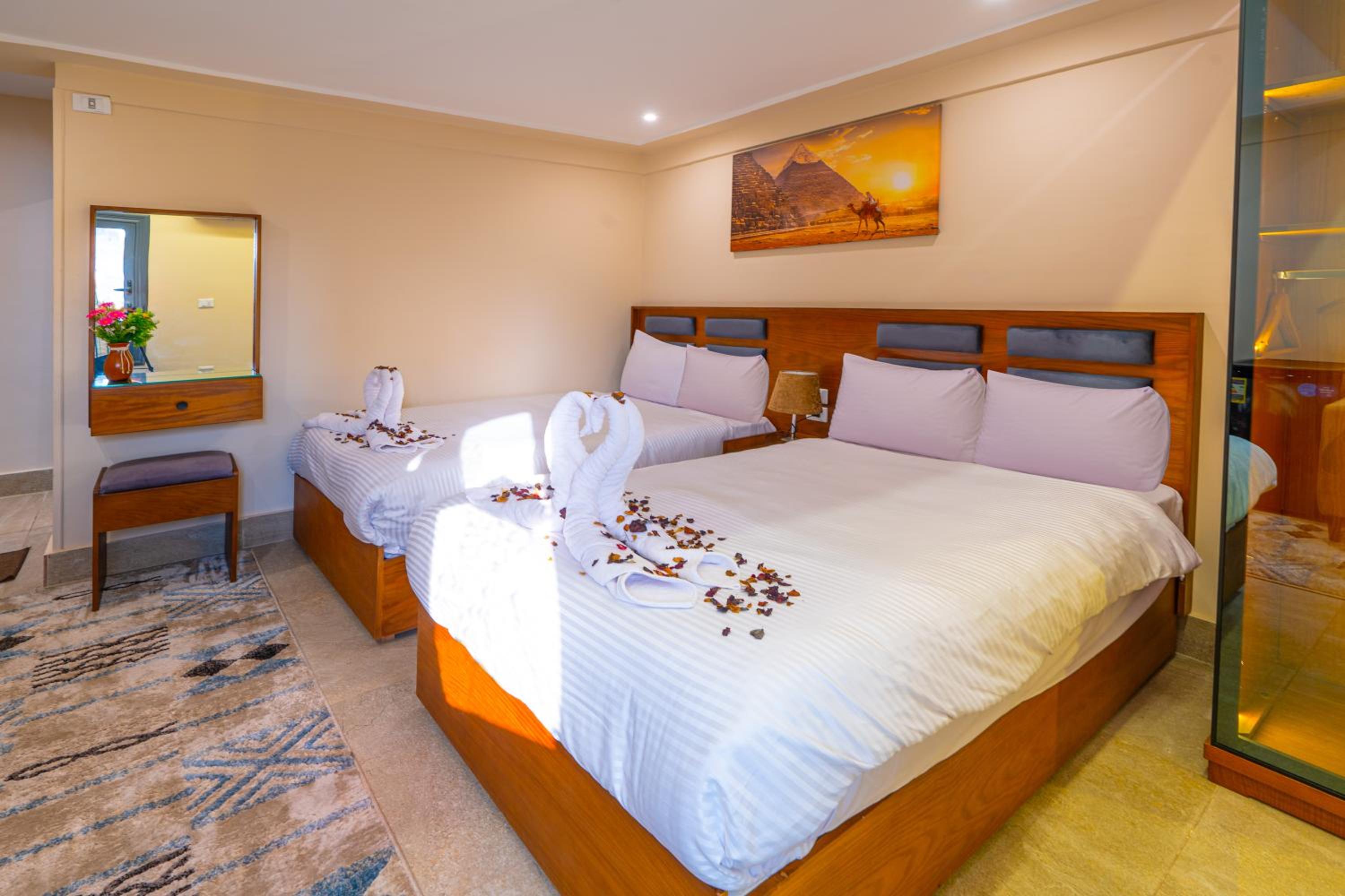 They went above and beyond to make sure everything was perfect throughout my stay. The rooftop view of the pyramids is absolutely breathtaking, especially at sunrise and sunset. Breakfast was delicious, the rooms were clean and comfortable, and everything was very well organized. The location is ideal, only about 10 minutes from the pyramids, and all of this at a very reasonable price.