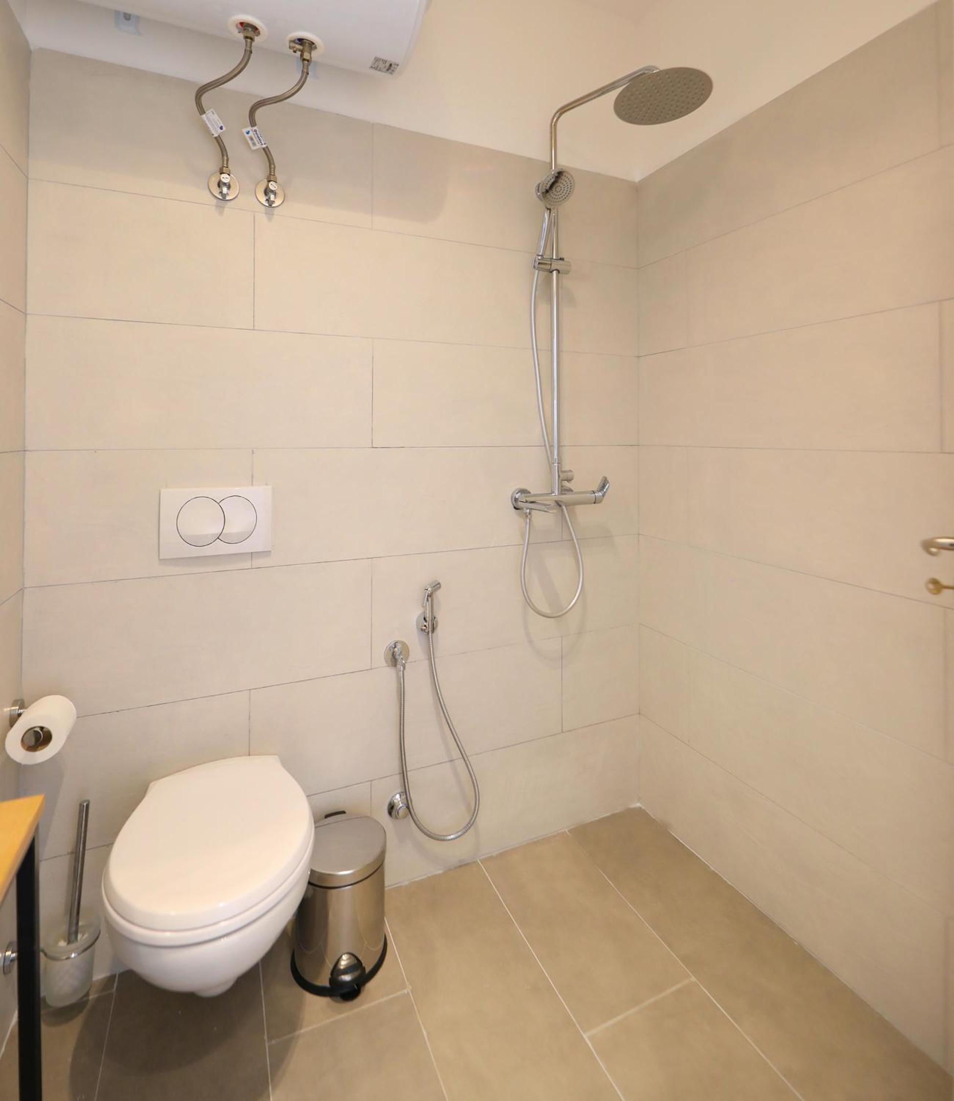 W łazience nie było kabiny prysznicowej, był prysznic i płytki z odpływem. Wody było w całej łazience po kąpieli.