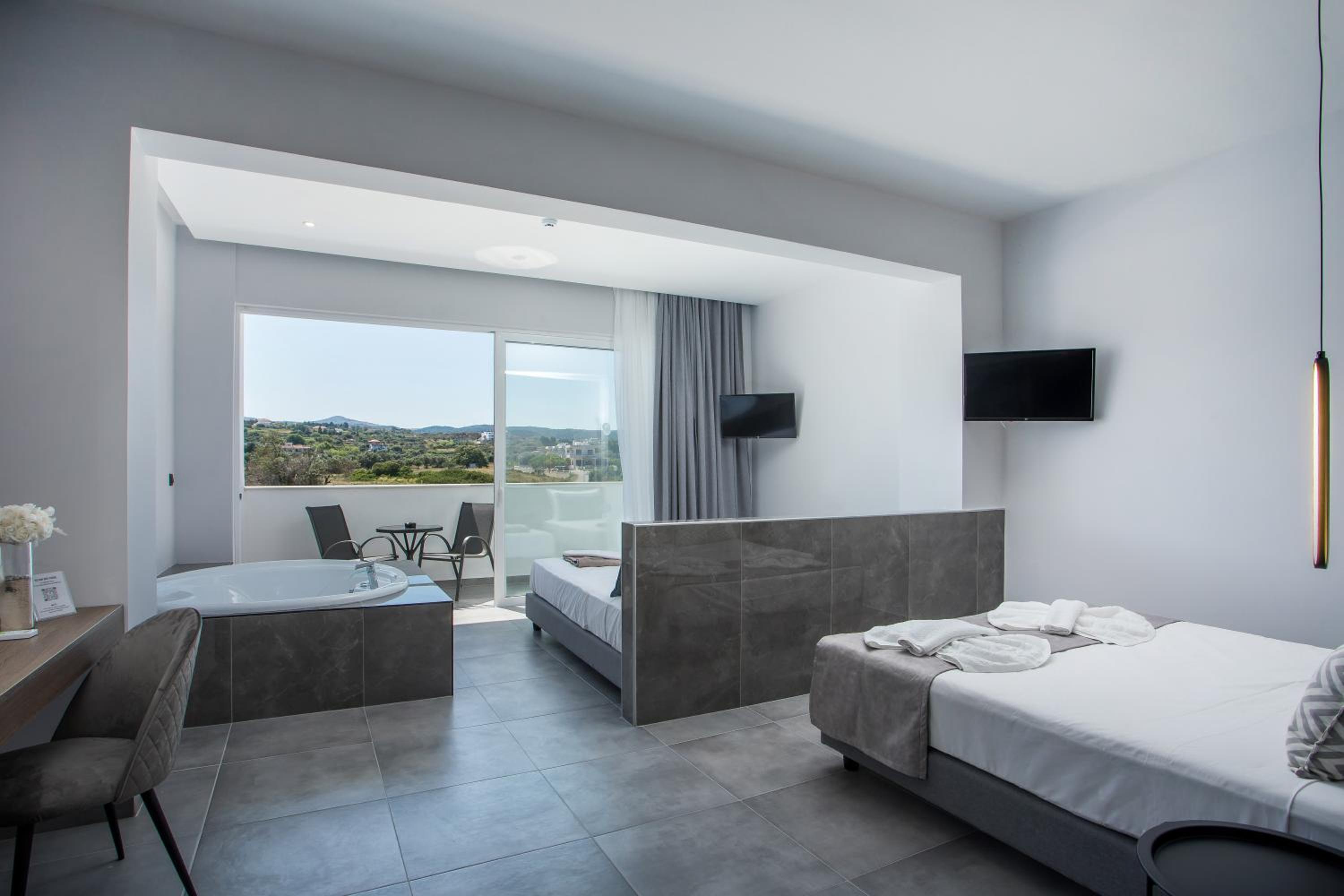The rooms are great and modern, beds are super comfortable and the rooms are cleaned every day with fresh towels, the shower is powerful and nice and hot which having been to Rhodes 9 times sometimes you cannot get hot water but this wasn't the case here.