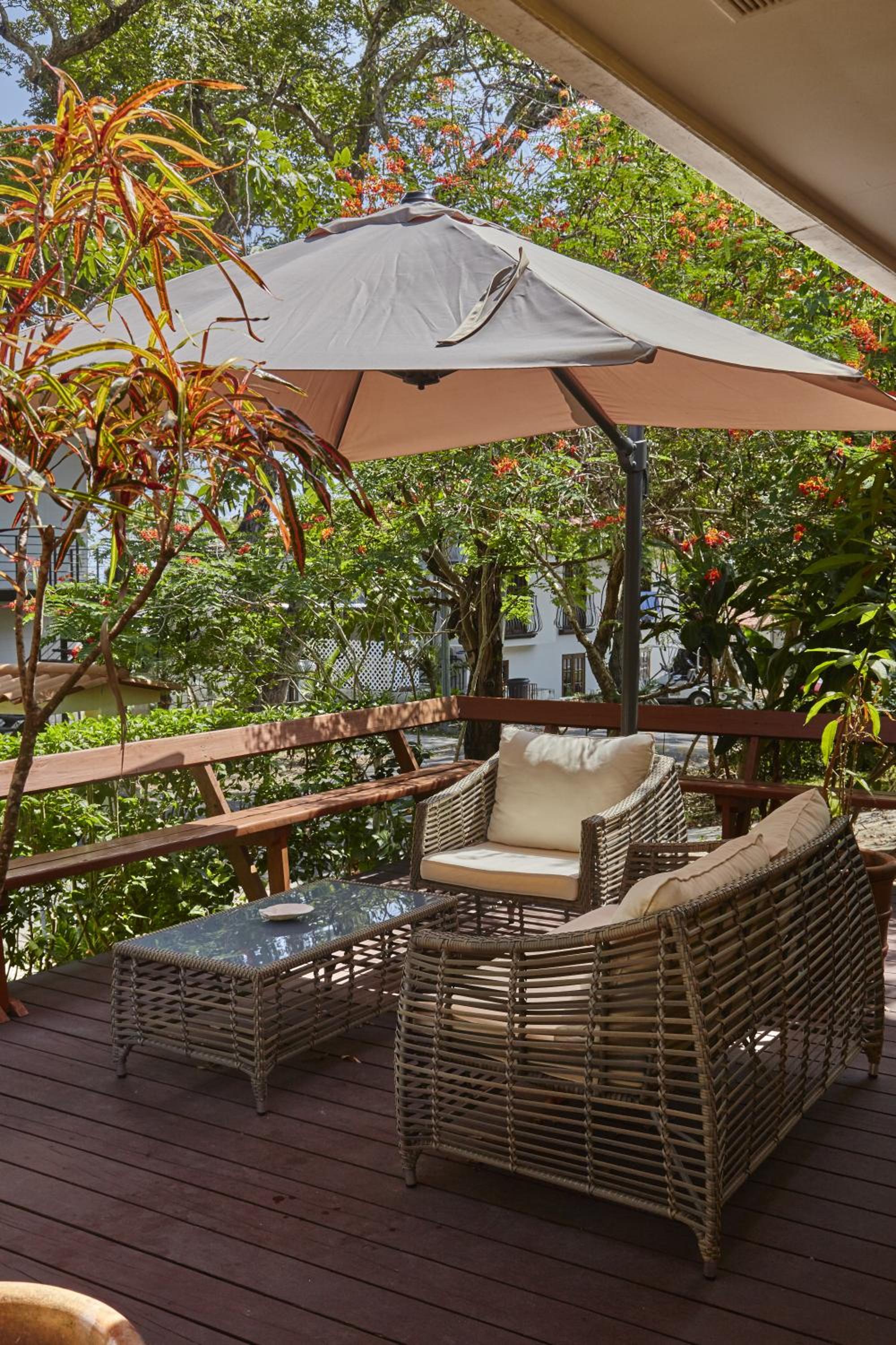 Luxurious Rooms with Private Patios: Experience elegance and relaxation in our rooms with private patios overlooking lush tropical surroundings. Each room is beautifully decorated in a rustic style, offering a cozy retreat with modern amenities.