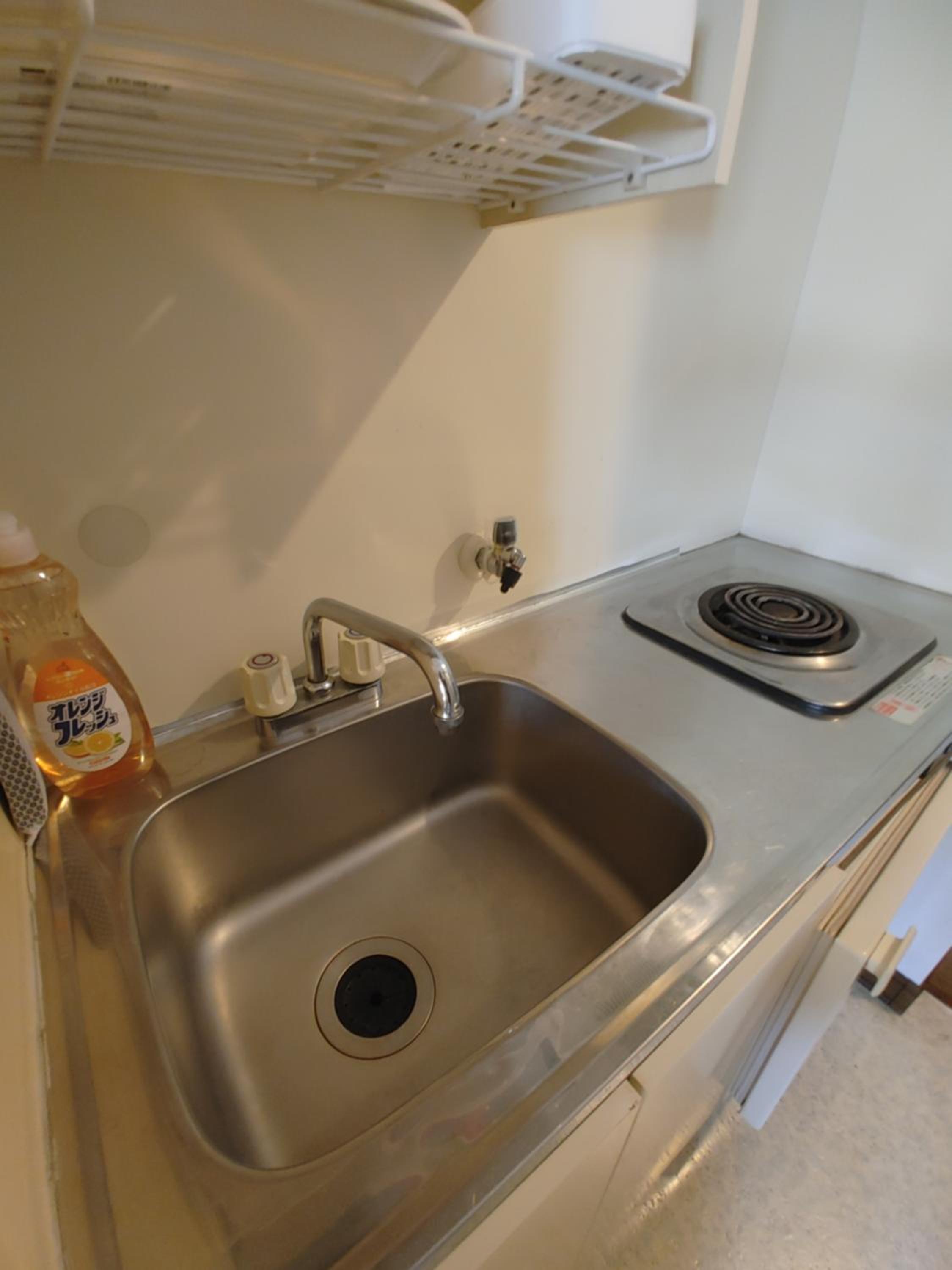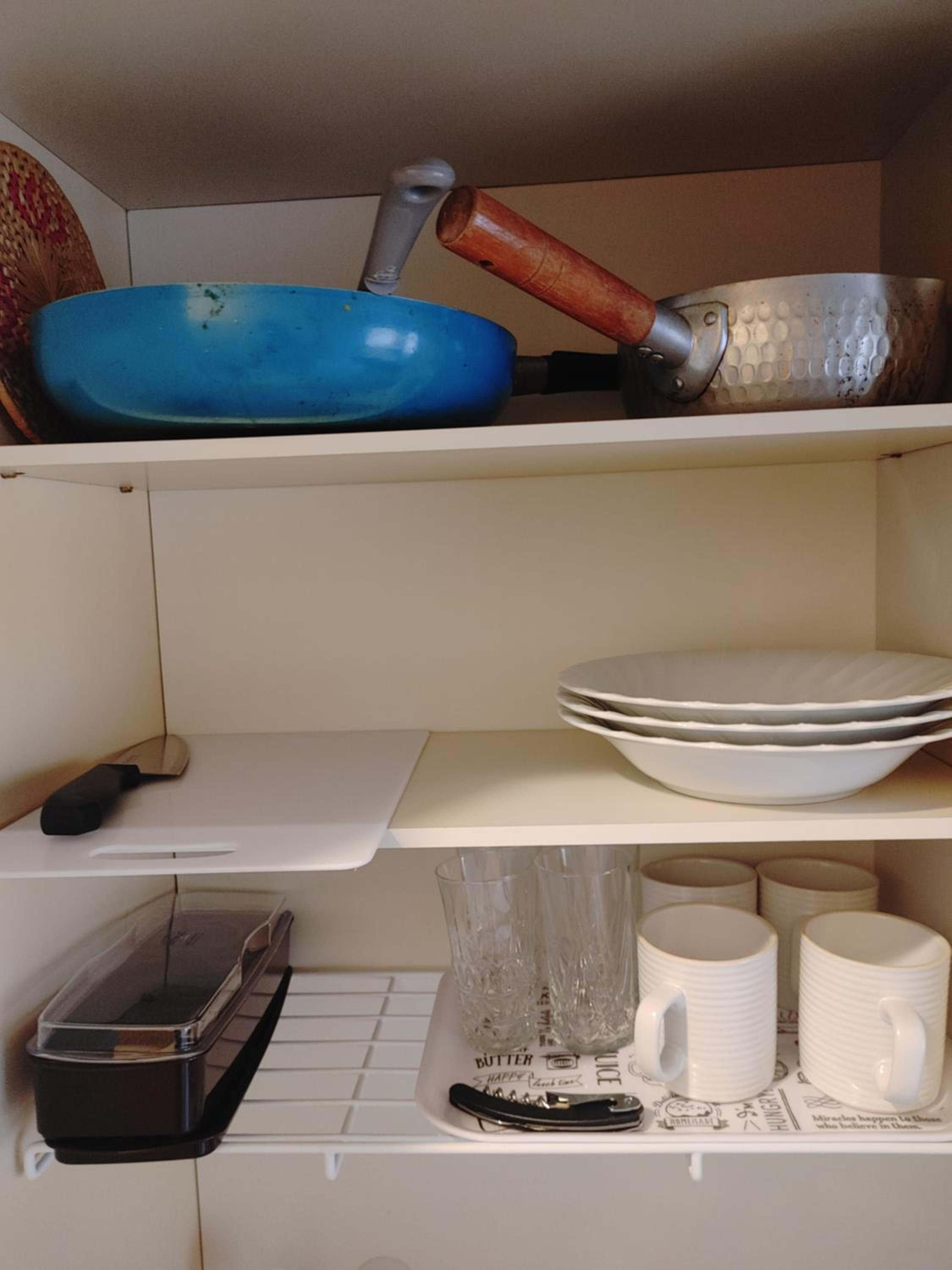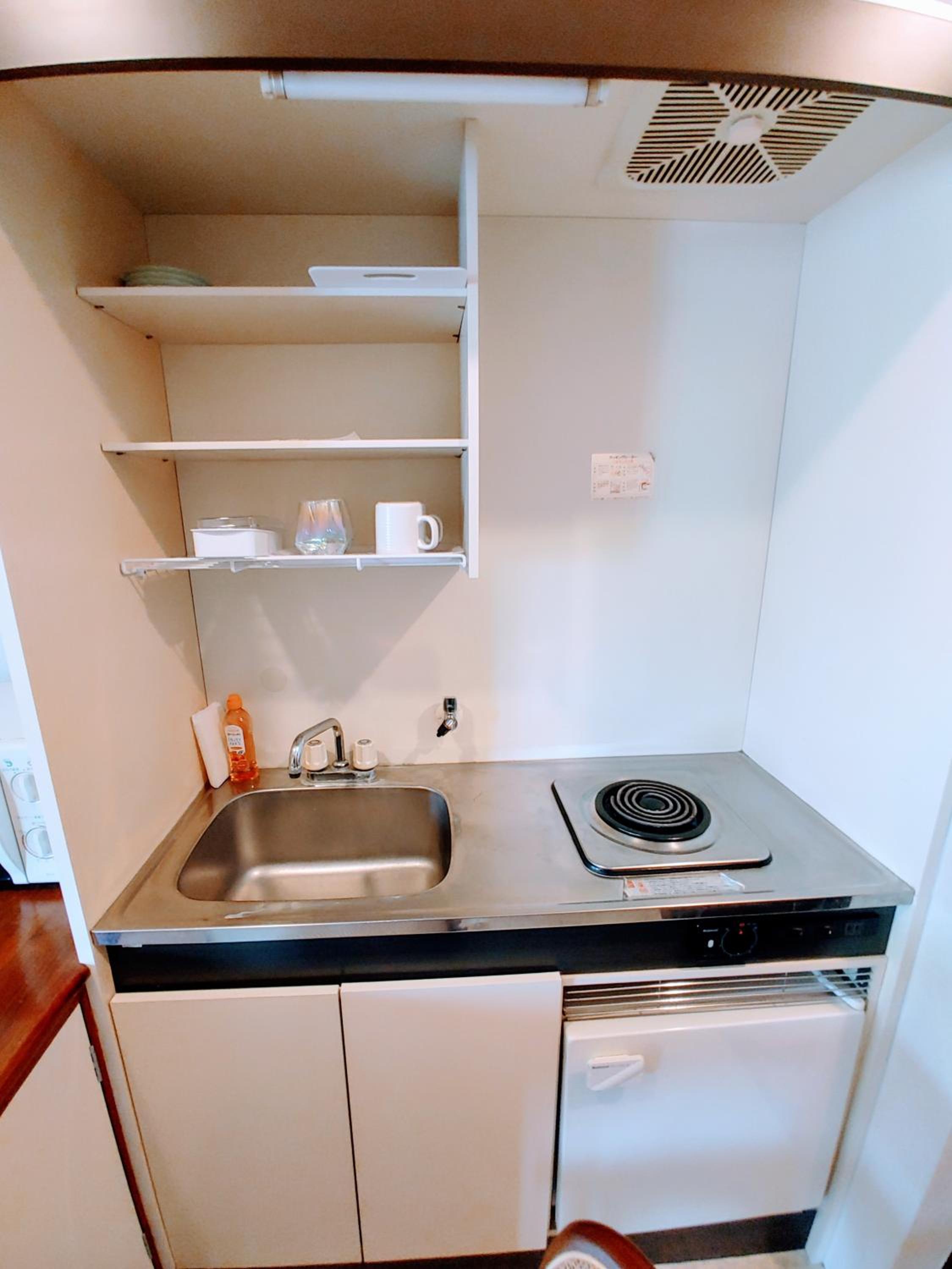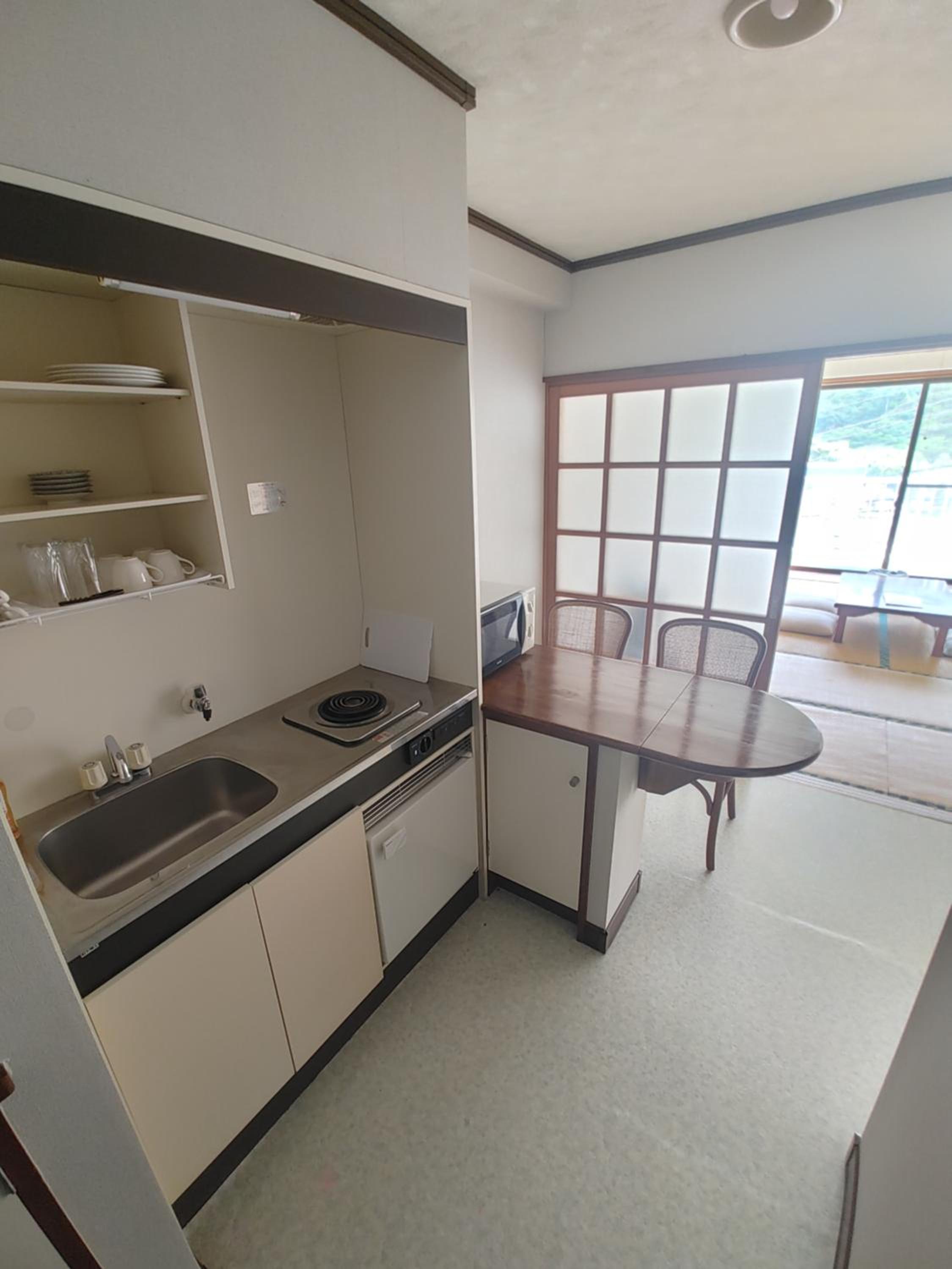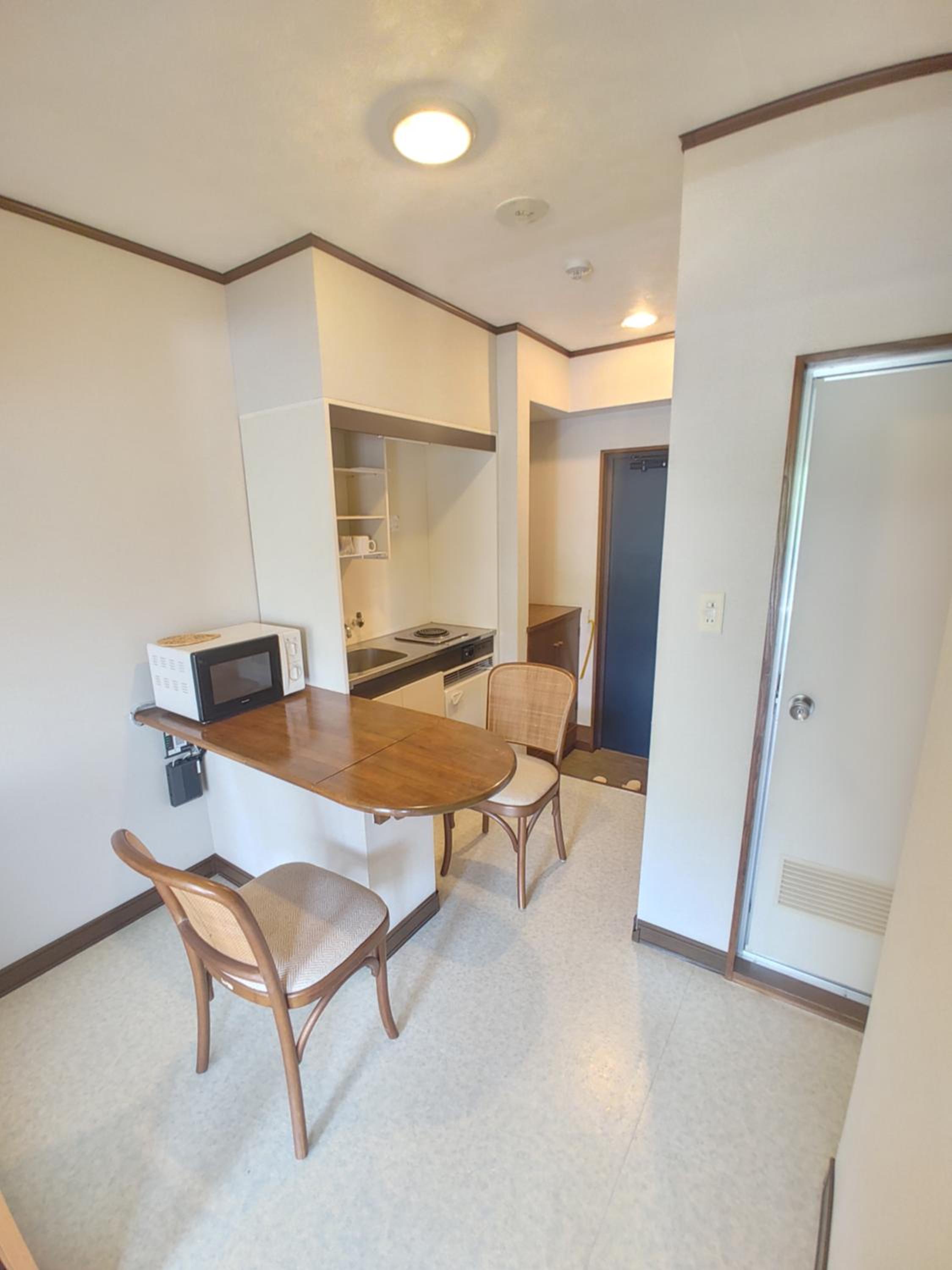 Inside the room, there was a small kitchen where we could prepare light meals. All the necessary utensils were provided, and having a microwave in each room was very convenient.