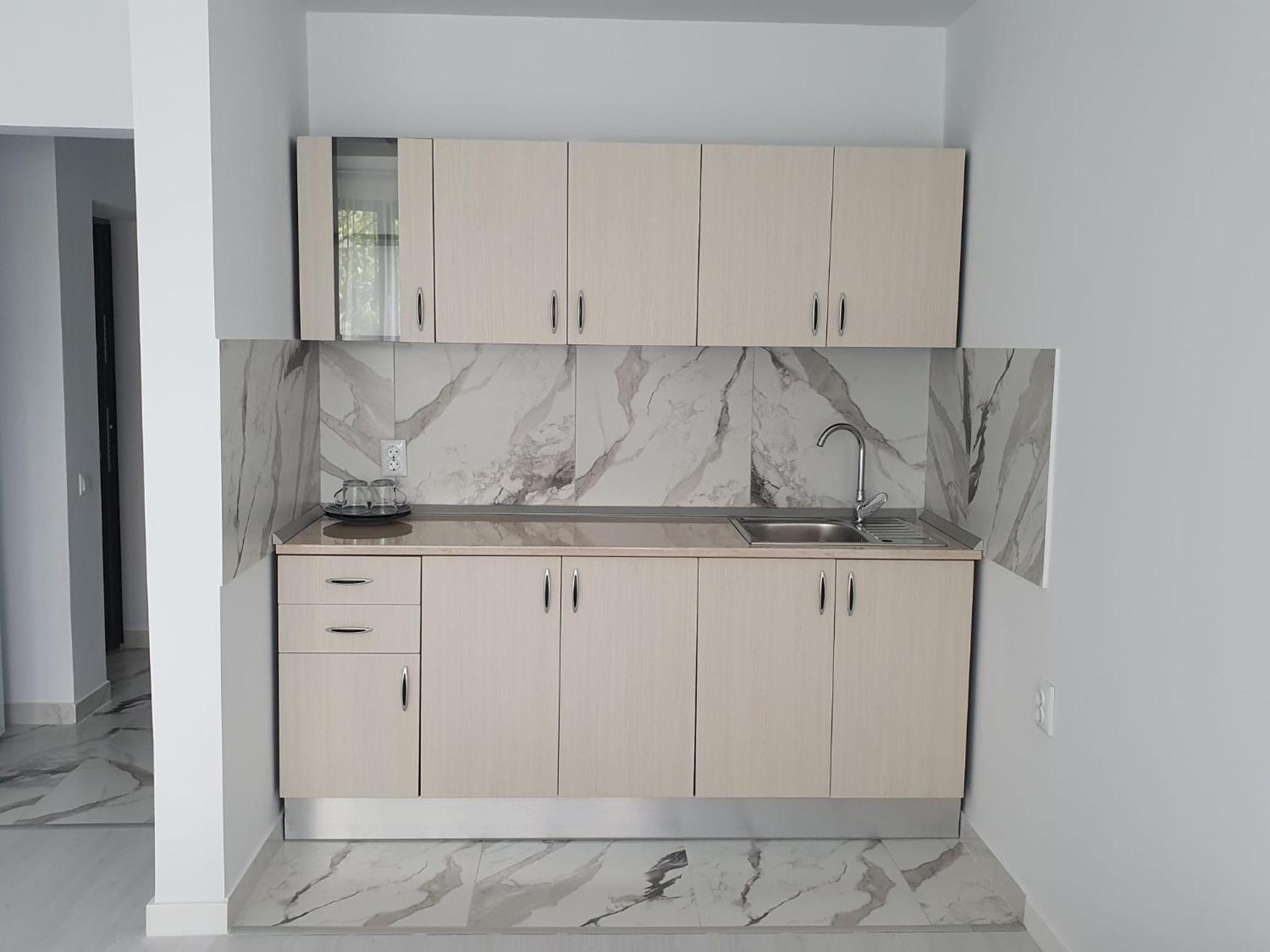 Bardzo słabo wyposażony kącik kuchenny. Tylko dwa duże talerze. Żadnych kieliszków, mniejszych talerzy - ograniczało to zrobienie śniadania np. Nie było otwieracza do wina i butelek. Zapach czystości jak w szpitalu.