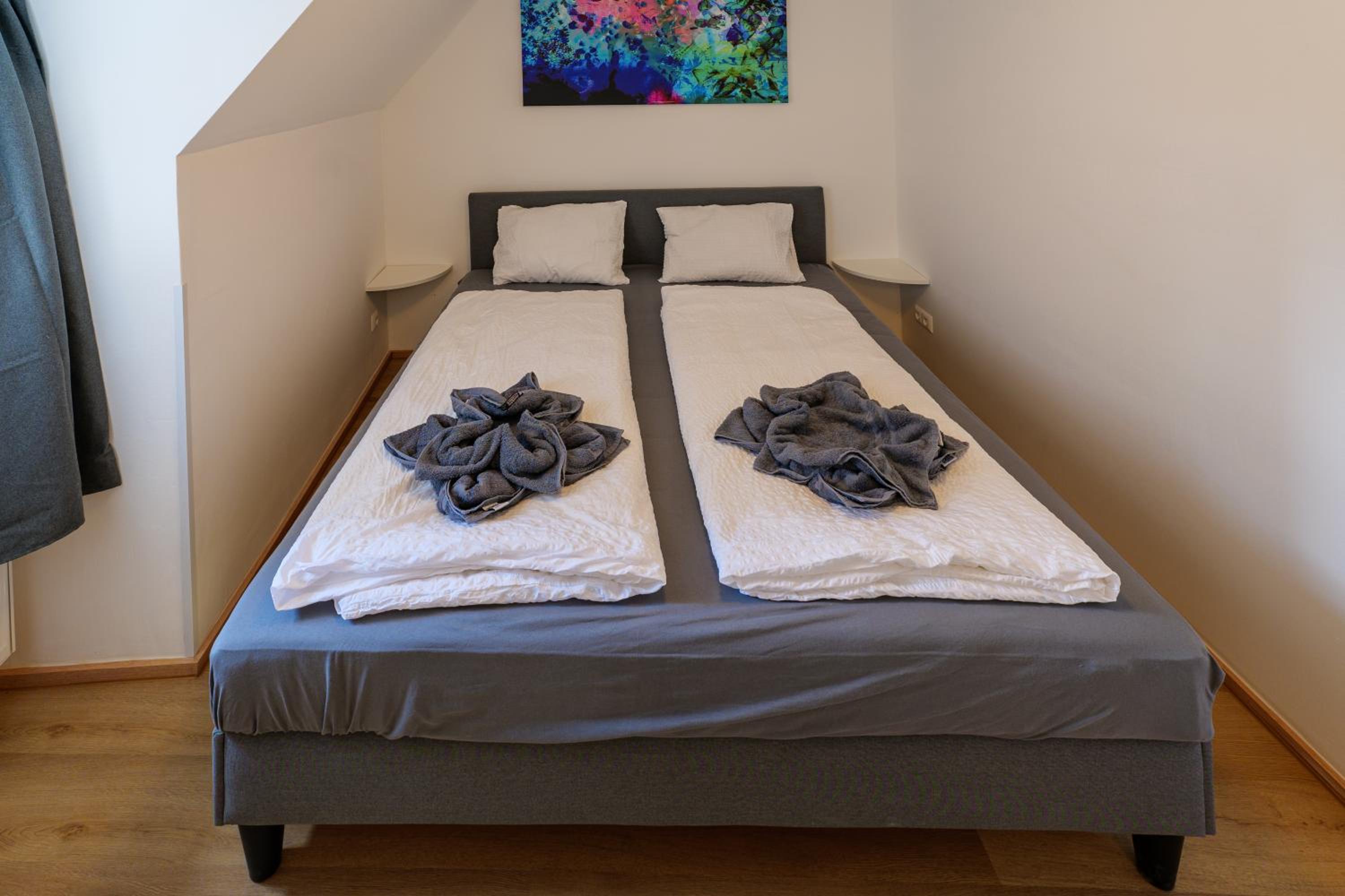 Wir blieben für eine Nacht (Eltern plus Baby). Das Appartement 6 ist perfekt für eine kleine Familie oder eine kleine Gruppe. Es sind 5 Betten, wobei 3 einzeln stehen bzw 2 davon zu einem Doppelbett zusammengeschoben werden können (diese 3 Einzelbetten befinden sich im Schlafzimmer). Das andere Doppelbett ist im Wohn-Essbereich. Das Häuschen ist supersüß und die Wohnung lieb renoviert. Auf Anfrage gab's auch ein Beistellbett für unsre Kleine.