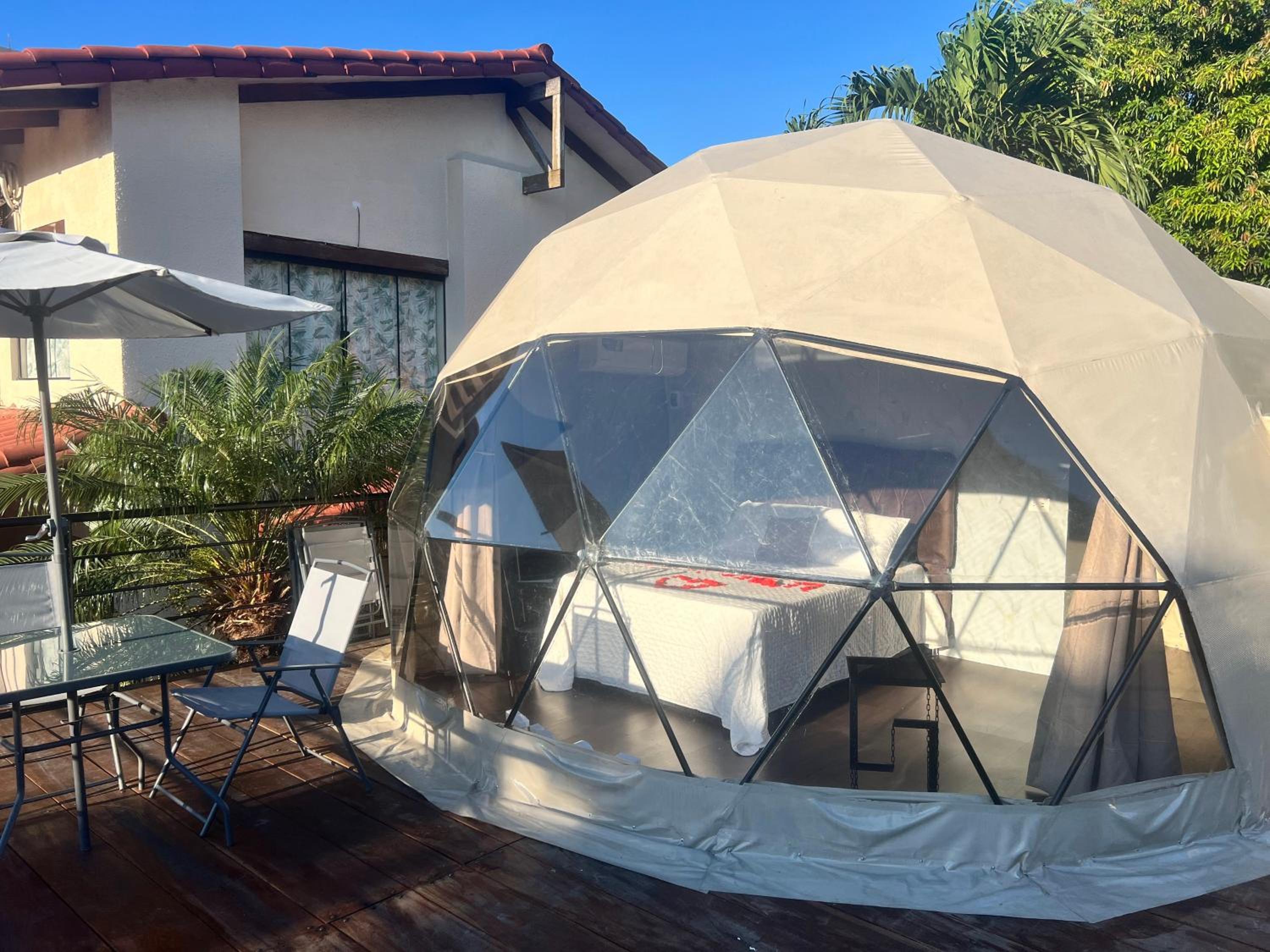 Experience a blend of comfort and nature in our glamping accommodation with a garden setting and outdoor pool.