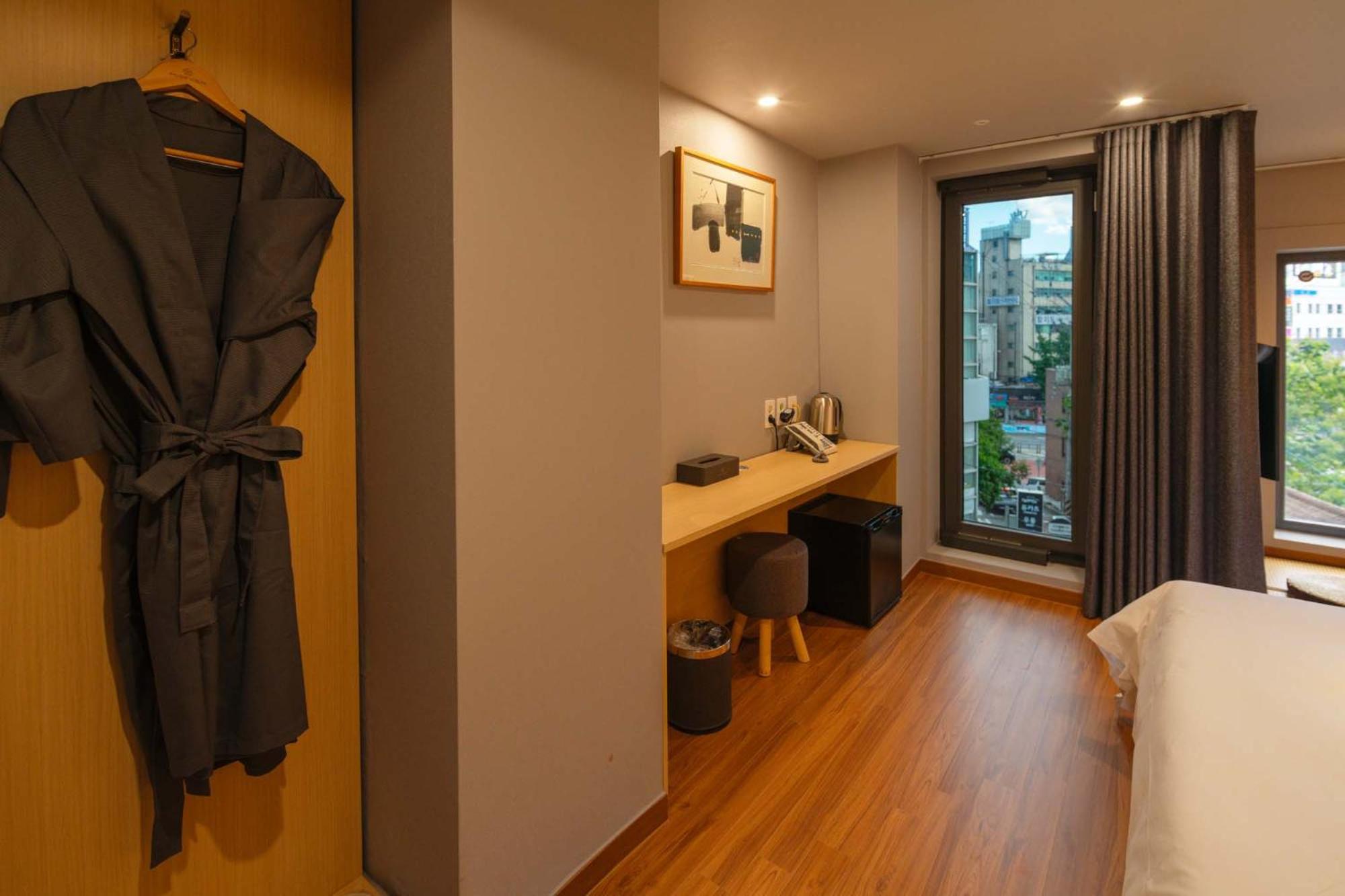 The bathroom and toilet, although very adequate, just doesn’t have the necessary fixtures- to hang hand towels, place your toiletries, even to place the handsoap. I requested a clean up of the room so I can get fresh towels, by pressing the bell outside the room, but it seemed to have gone nowhere. Communication wqs also a bit difficult, considering of course that don’t speak Korean.