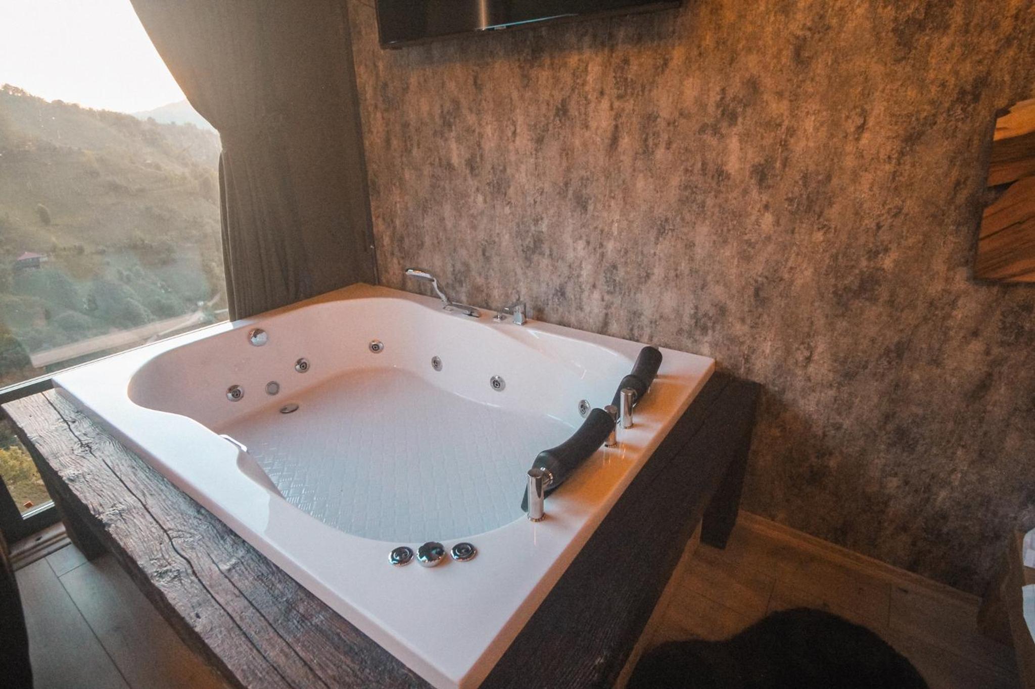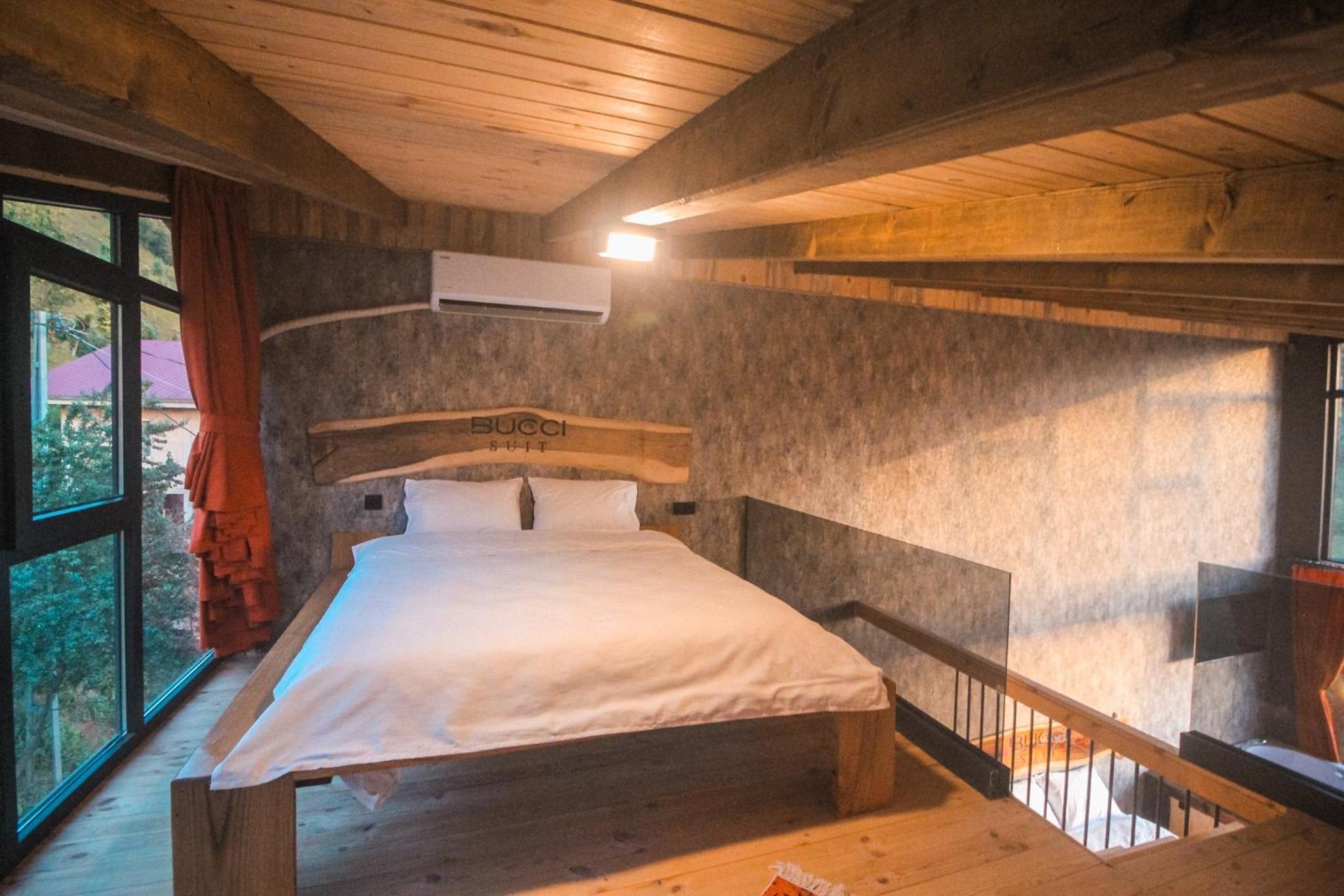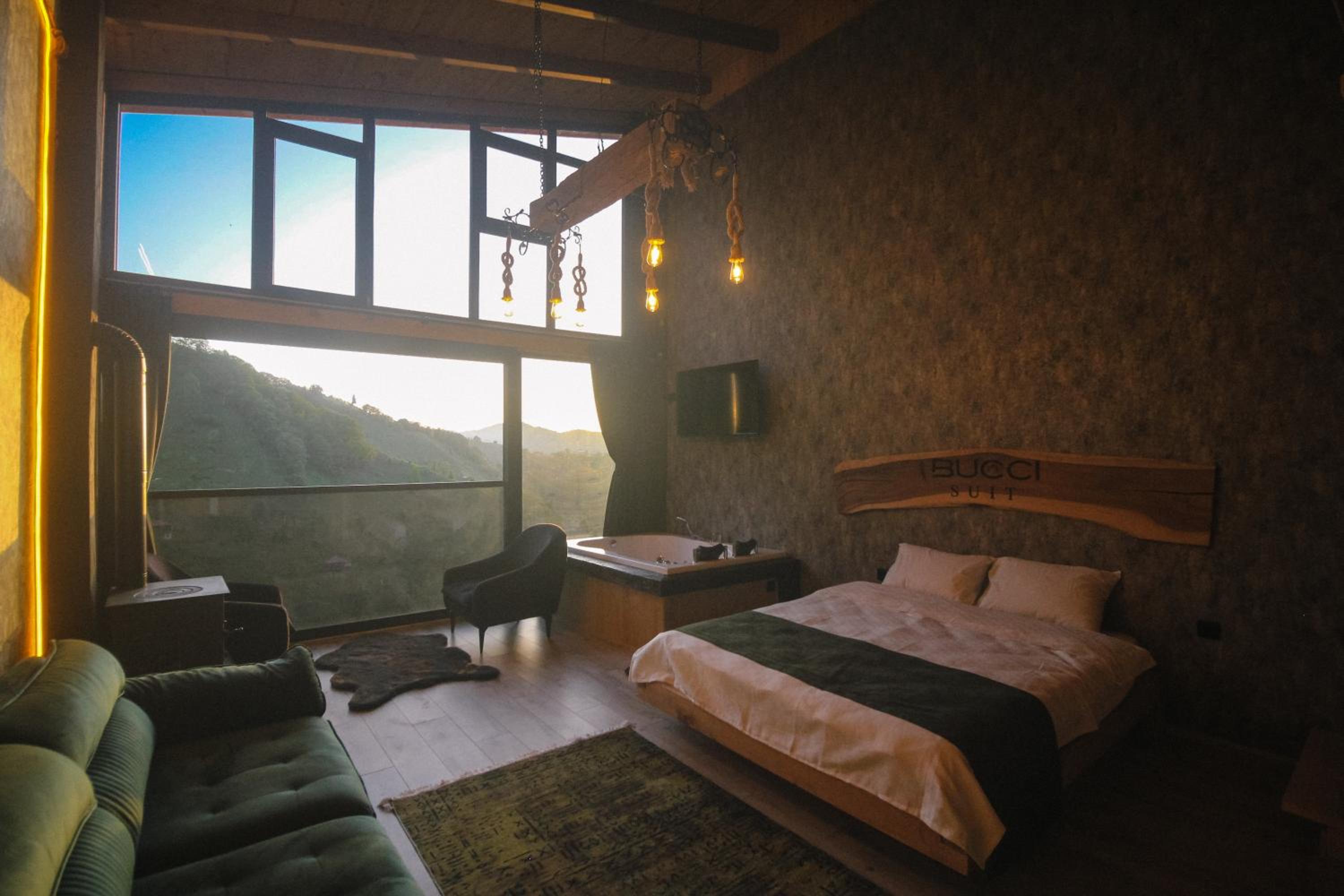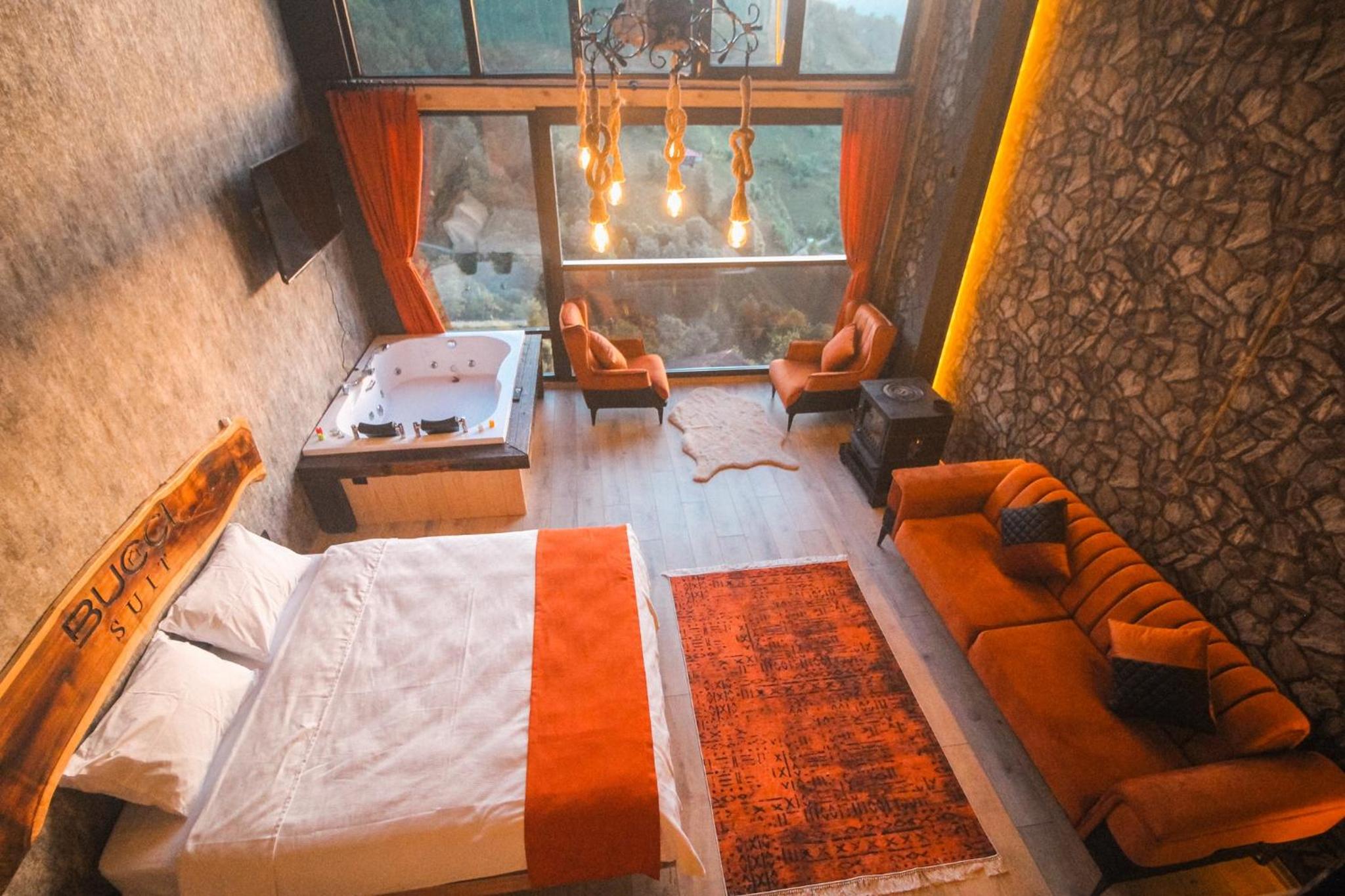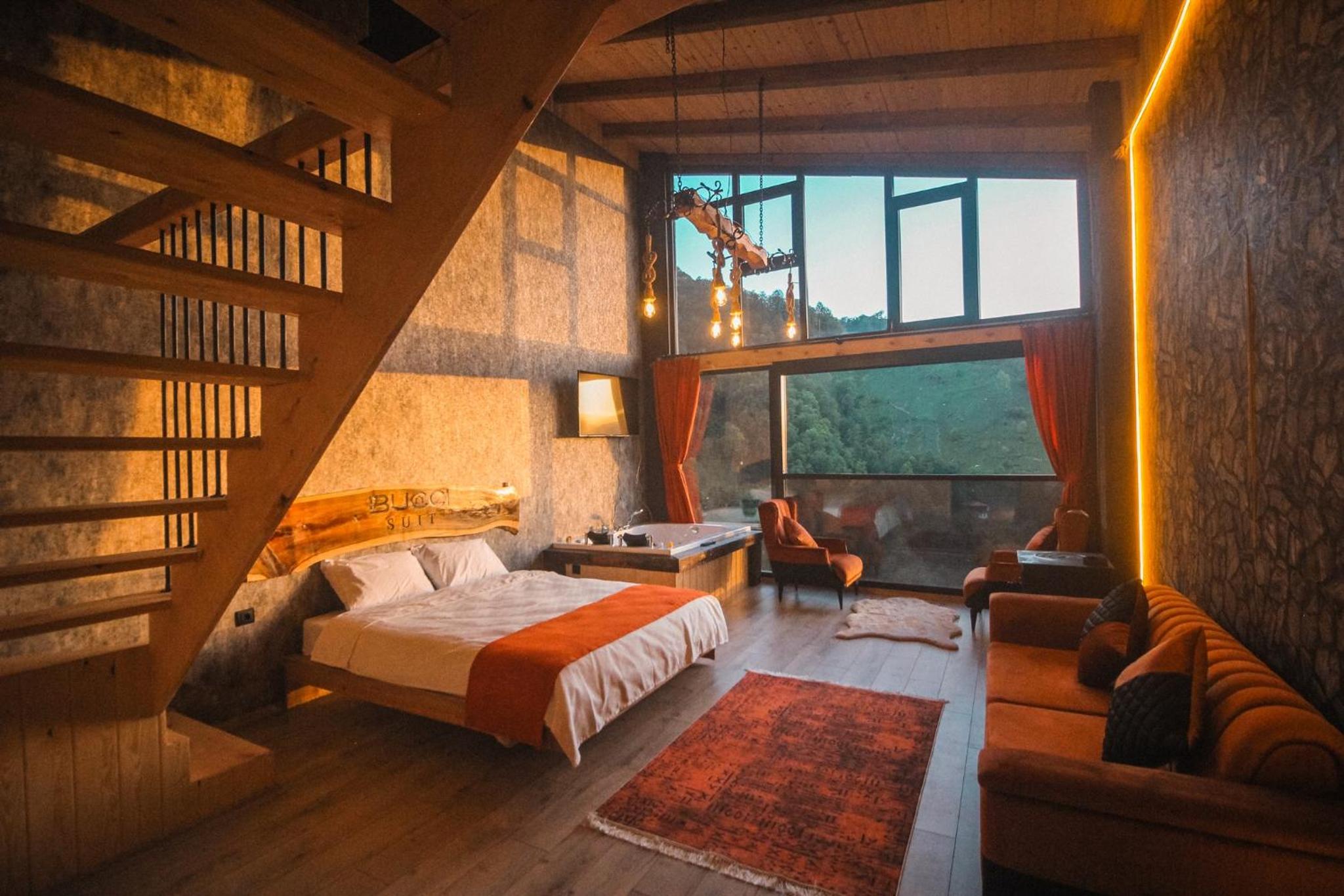 Indulge in relaxation at Bucci Suit with a spa bath, fireplace, and stunning mountain views. Unwind at the on-site bar or enjoy the garden and shared lounge areas. Book now for a tranquil getaway.