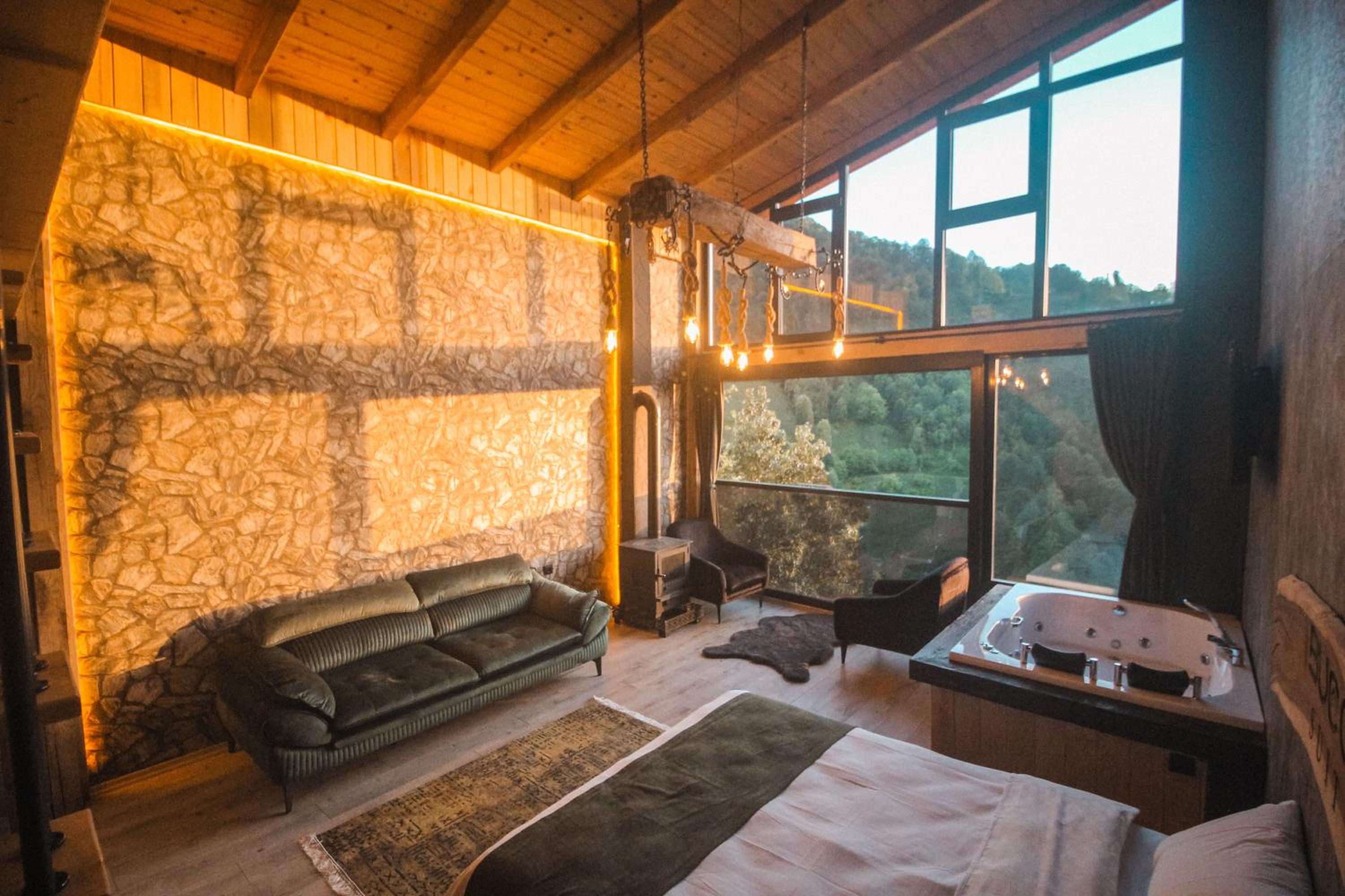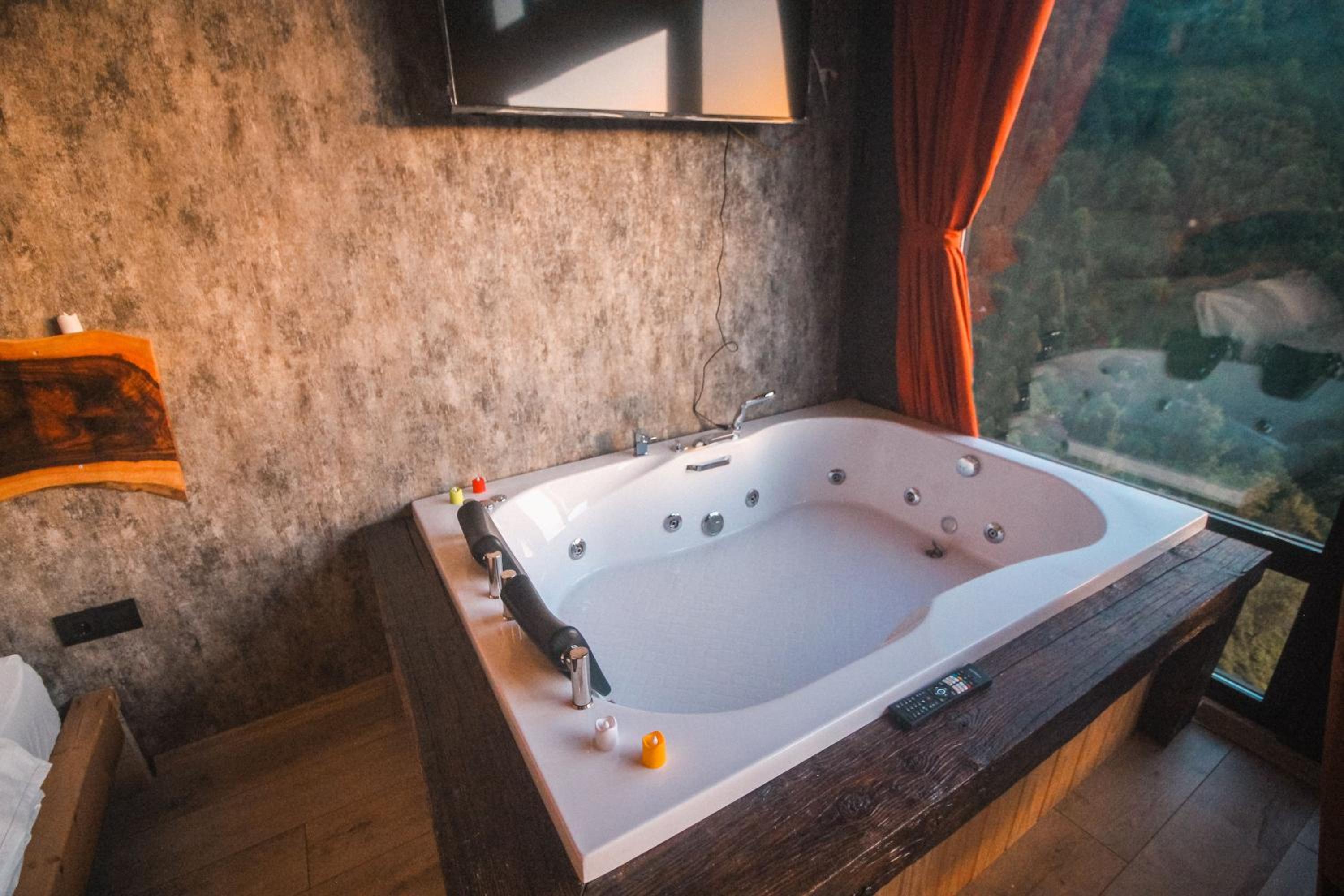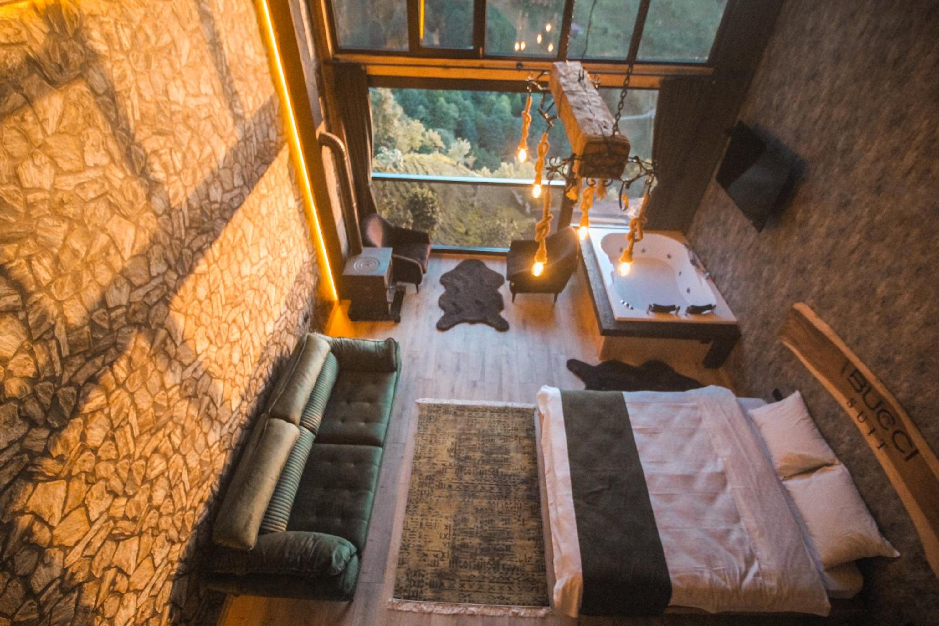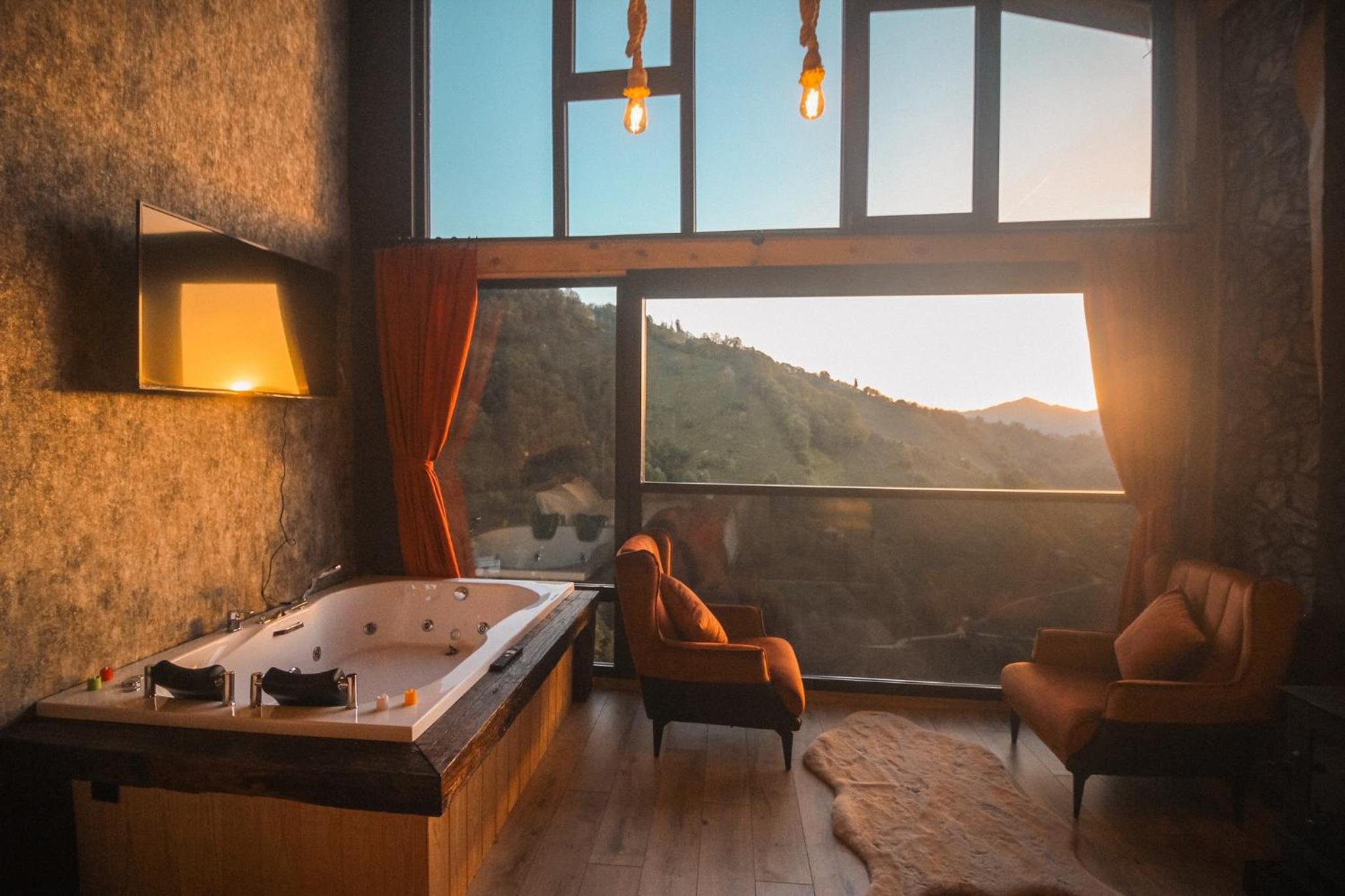 Indulge in relaxation at Bucci Suit with a spa bath, fireplace, and stunning mountain views. Unwind at the on-site bar or enjoy the garden and shared lounge areas. Book now for a tranquil getaway.