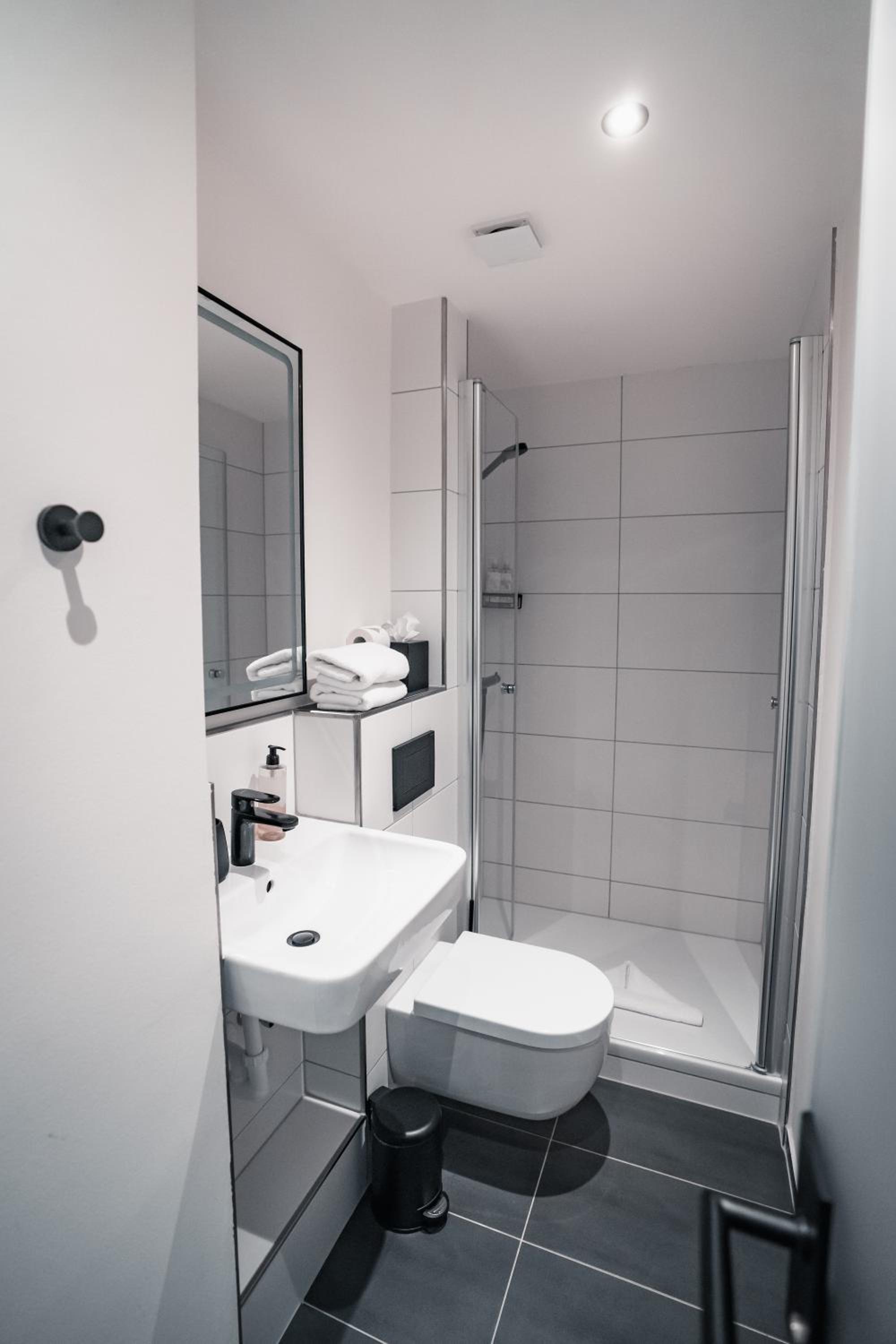 Badeværelse var MEGET lille. Så lille at man næsten ikke kun tørre sig efter man har været i bad. Og ingen plads til sine ting