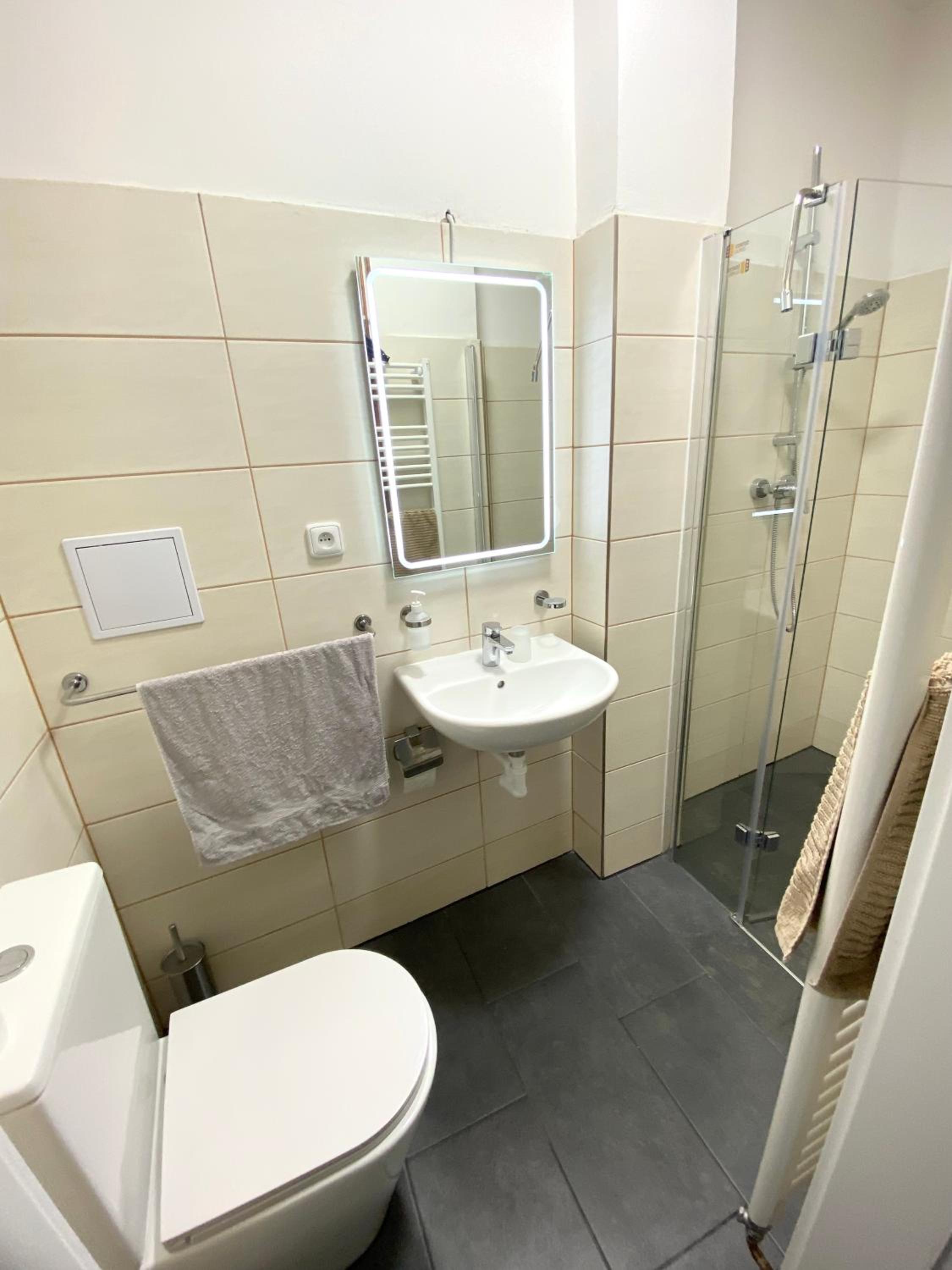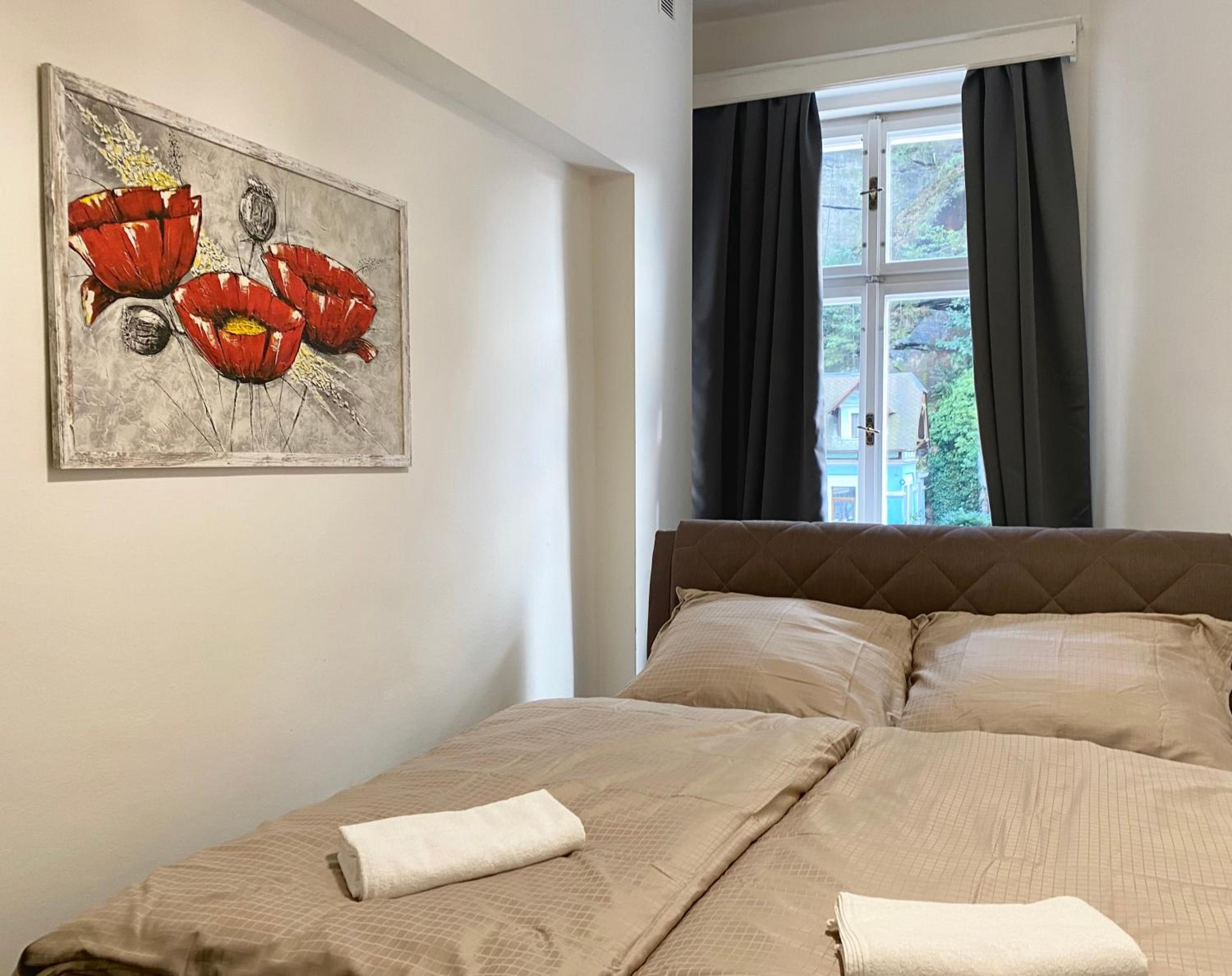 Koupelna velká, postel pohodlná, čisté ručníky.