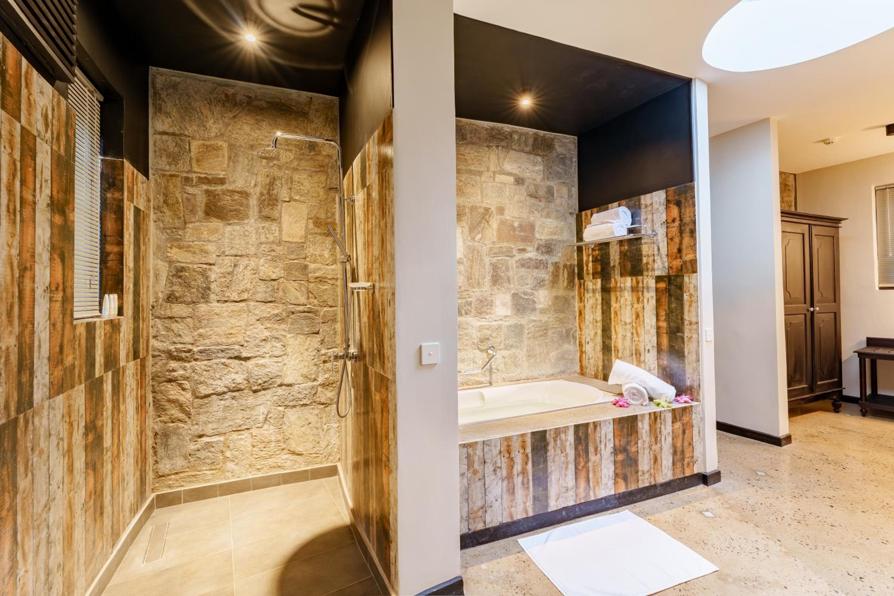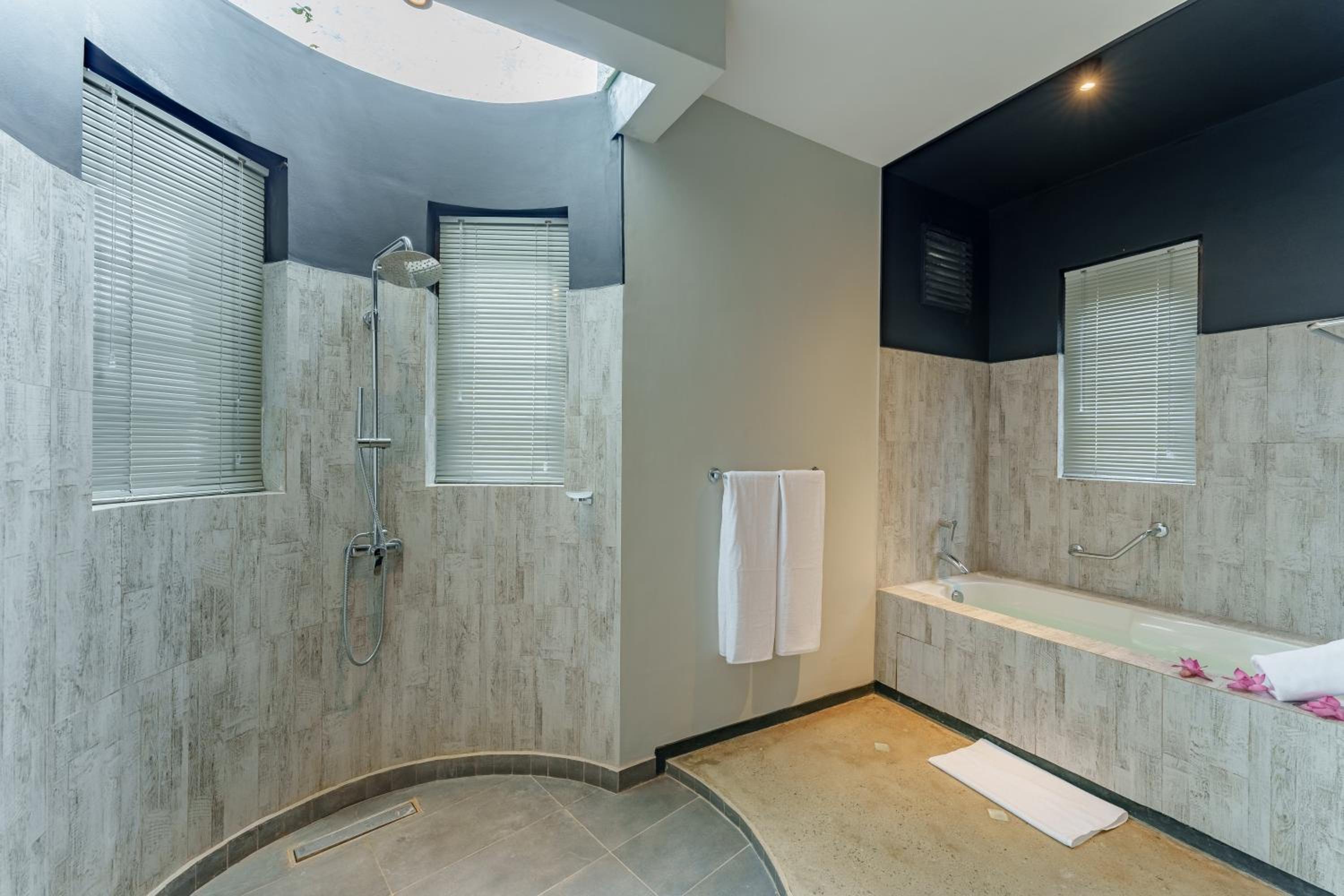 Beautiful spacious bathroom, plenty of storage with traditional furnishings. Lush greenery and the song of the peacocks and other birds, dancing monkeys offer lots of free entertainment. Staff were so professional and kind in fulfilling our requests including our three day extension of stay due to cyclone ditwa and road closure. Our package included wonderful elaborate breakfast and quality Ayurveda treatments by attentive therapists.
