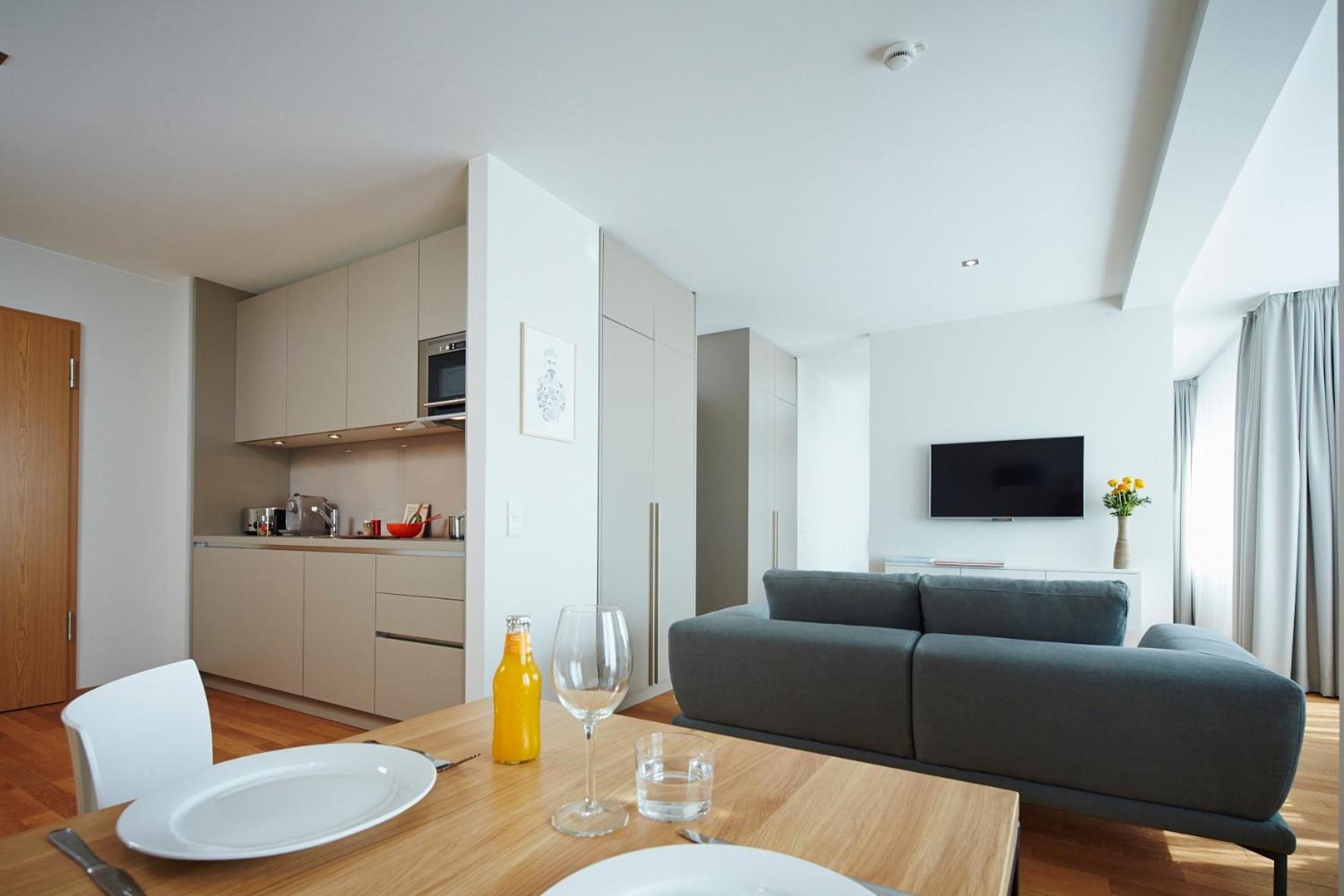 Good location , not too far from the center and right next to a shopping mall with a supermarket. Good facilities there’s a dishwasher and also a laundry room ( 3 euros ). Very clean apartment. We had everything that we needed: pans/plates , coffee, Smart TV, dish soap , sponge, shampoo etc . The receptionist was also very kind when we checked in. An early check in was possible for free.