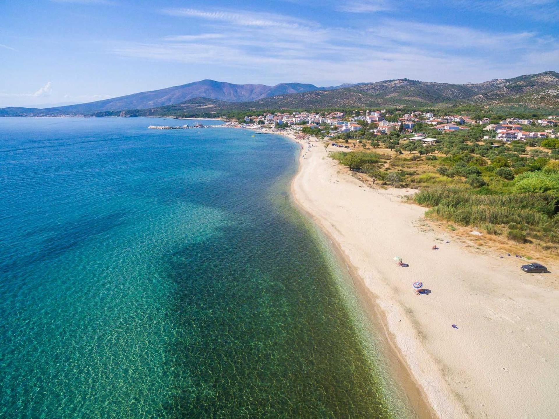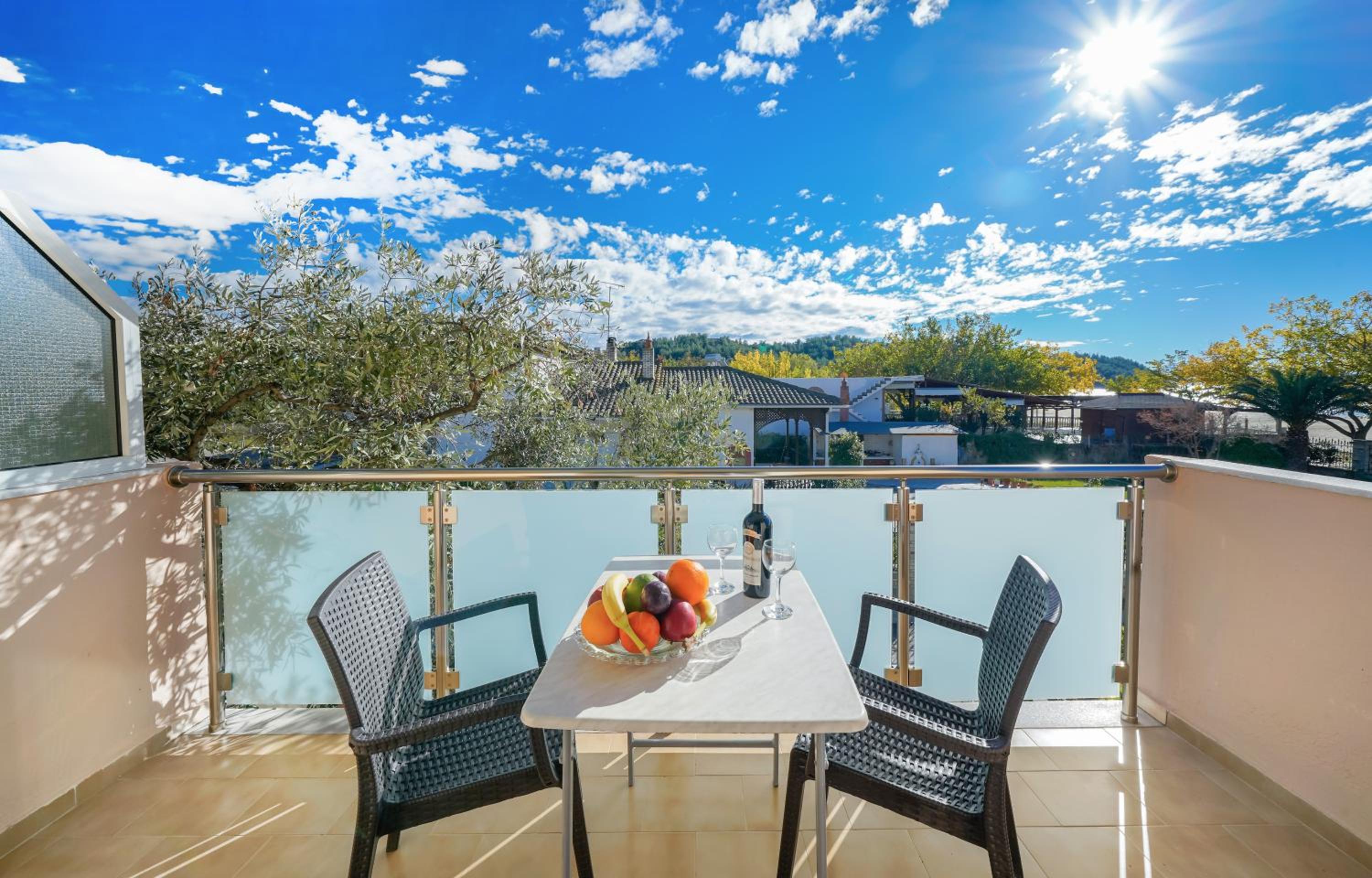 Practically on the beach, in a very quiet area, outside Potos. There was a kitchinette equipped with a lot of stuff (which we didn't use). TV, air con, balcony.