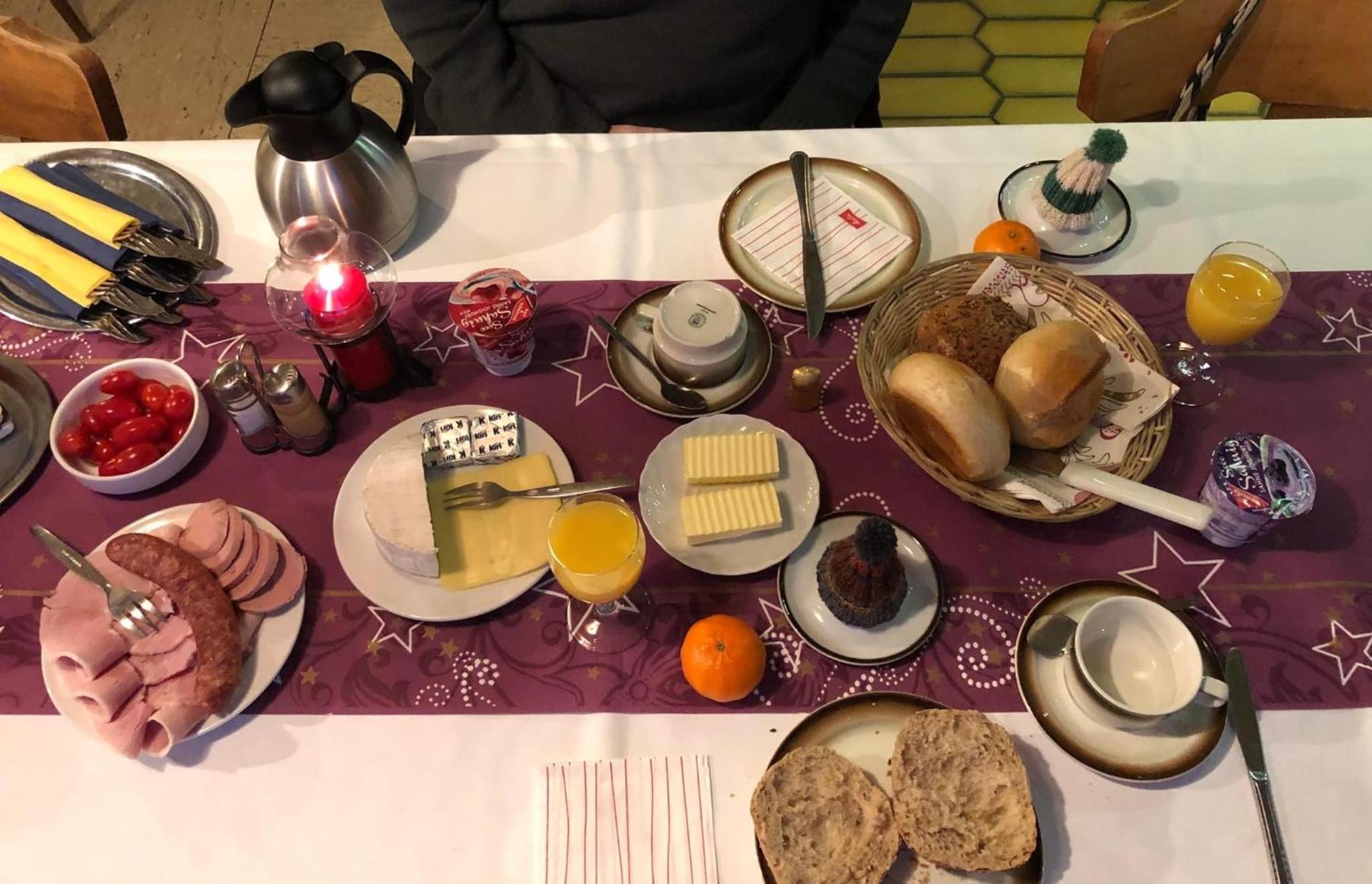 Das Frühstück war sehr gut: frische Brötchen, selbstgemachte Marmeladen, Saft.
