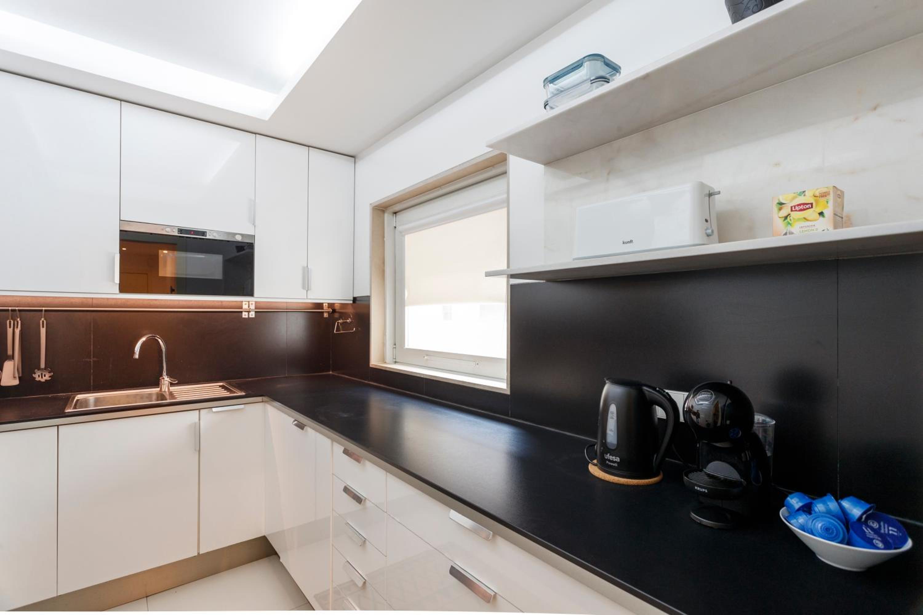 Enjoy the convenience of a kitchen equipped with an oven, microwave, toaster, fridge, stovetop, coffee machine, kitchenware, and kettle for a comfortable stay.