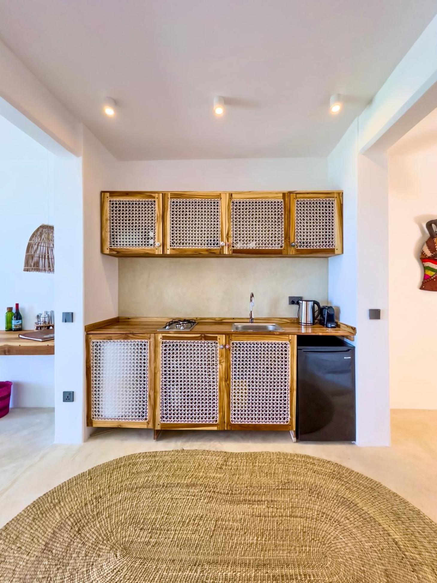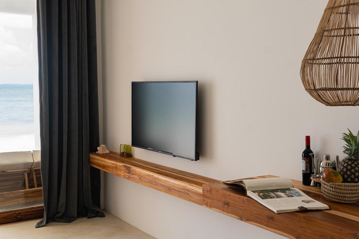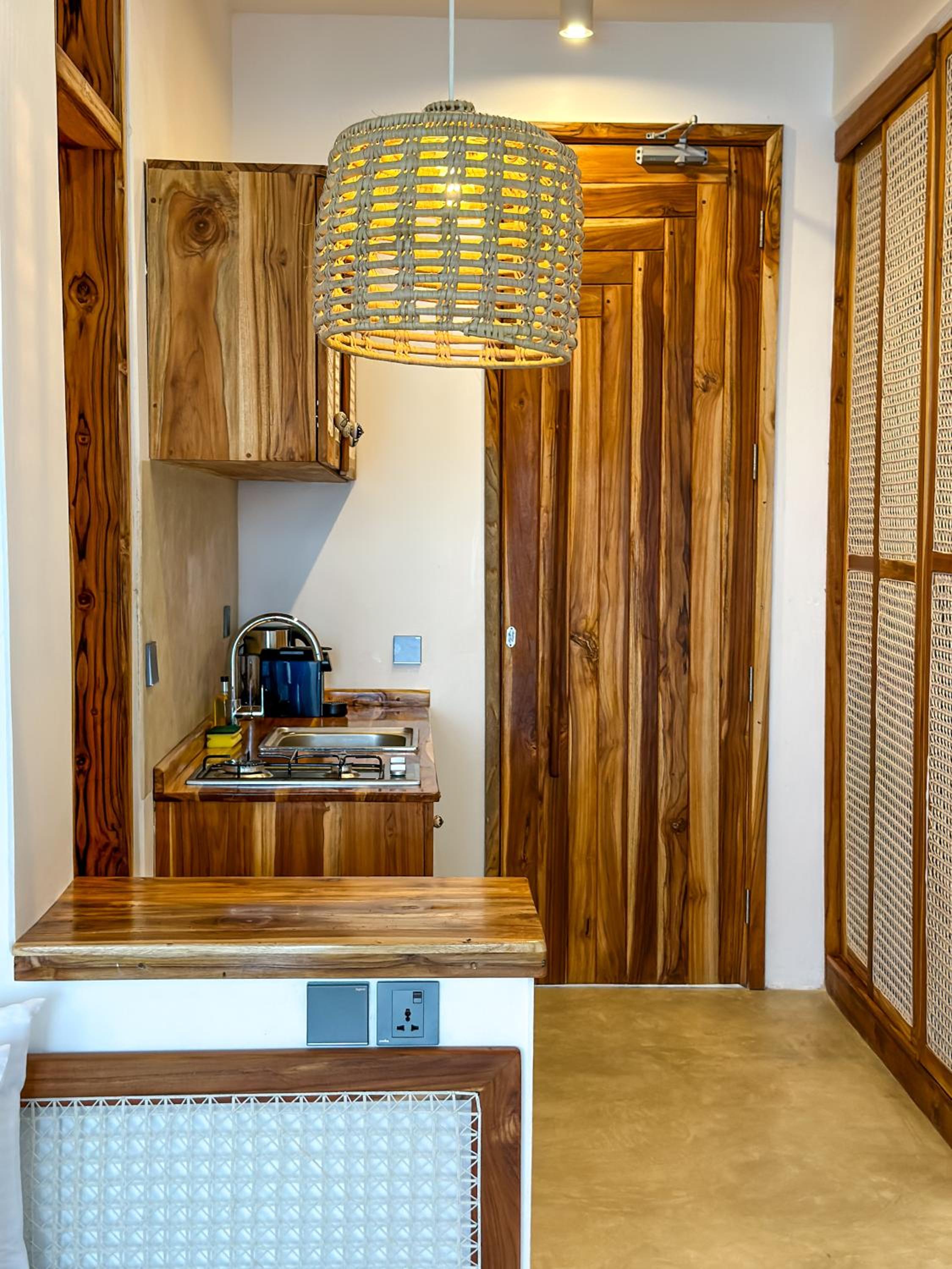 Relax in air-conditioned units with modern amenities like a coffee machine, flat-screen TV, and a fully equipped kitchenette for a comfortable stay.
