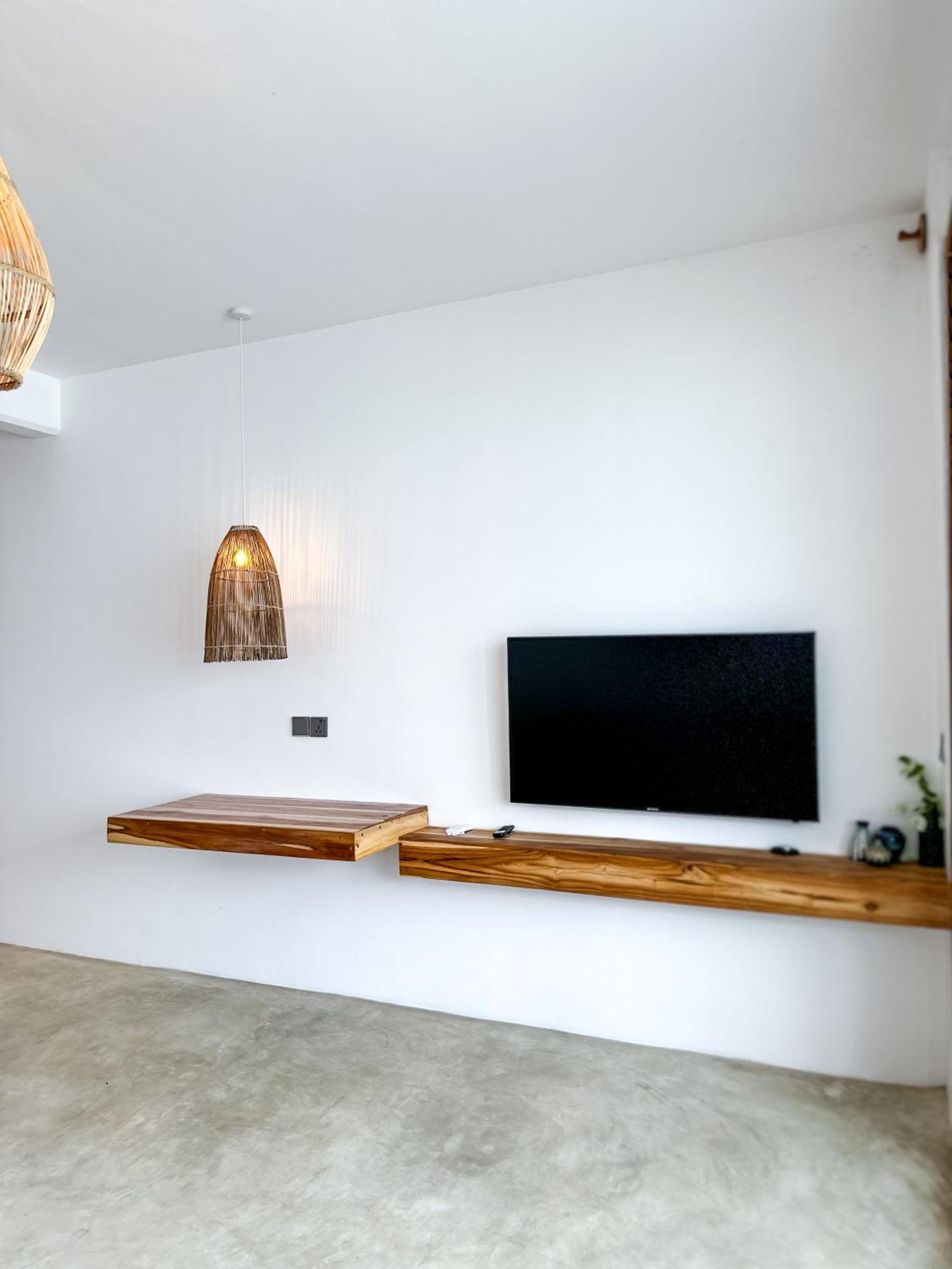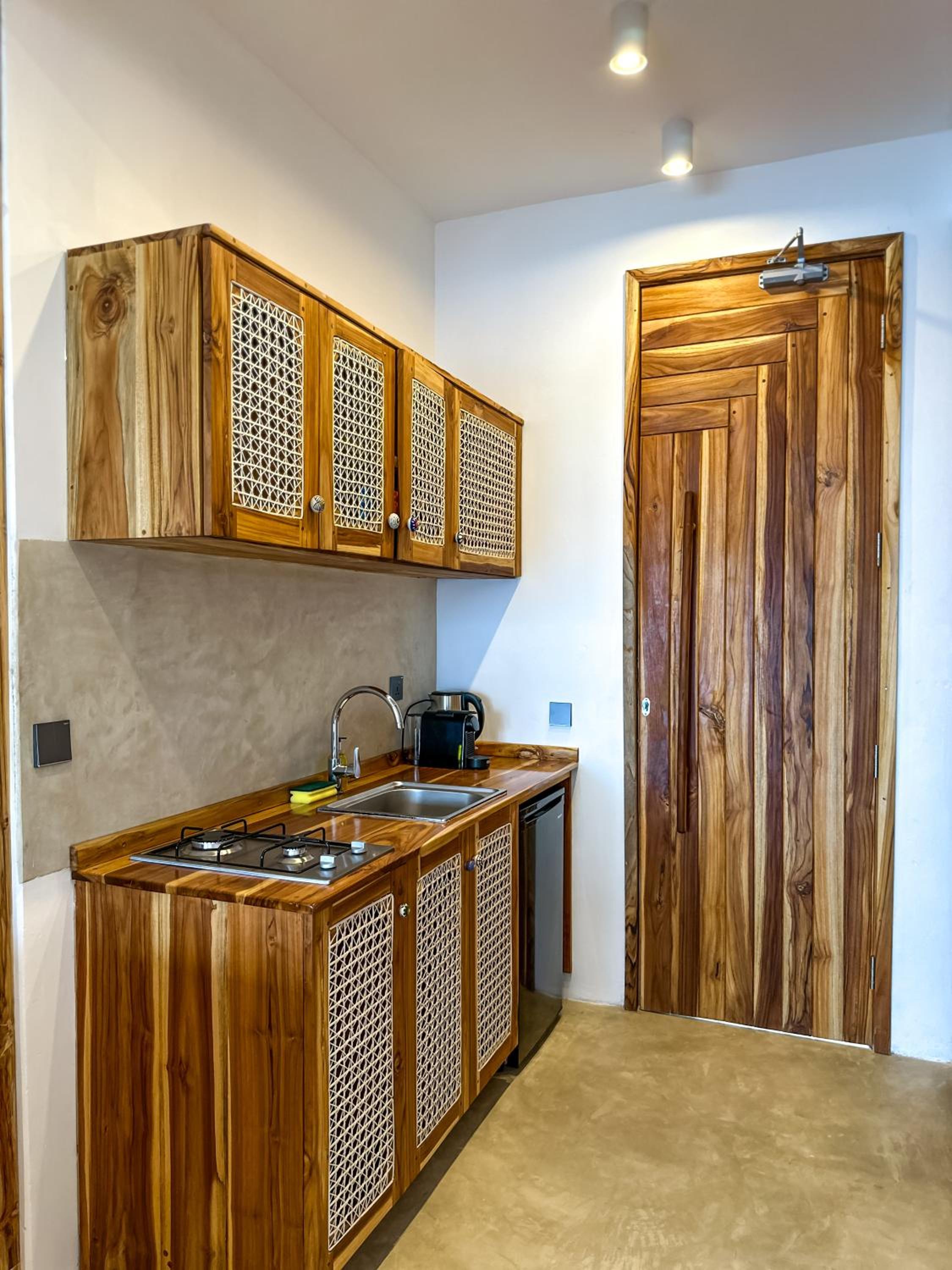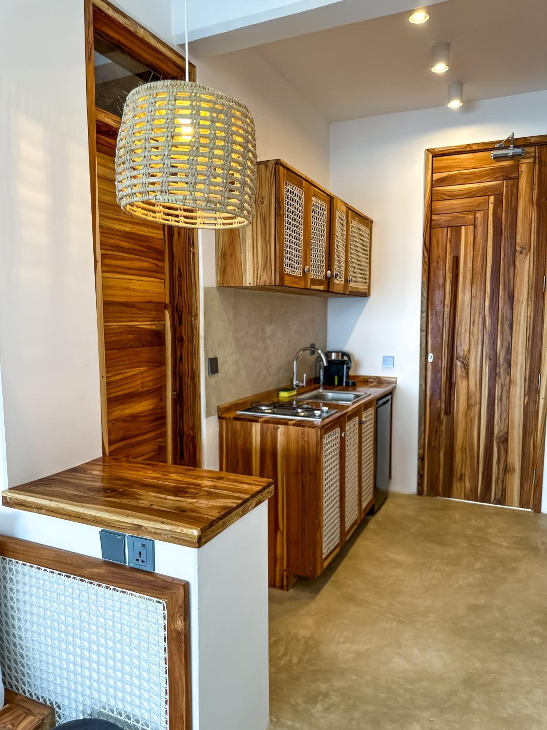 Relax in air-conditioned units with modern amenities like a coffee machine, flat-screen TV, and a fully equipped kitchenette for a comfortable stay.