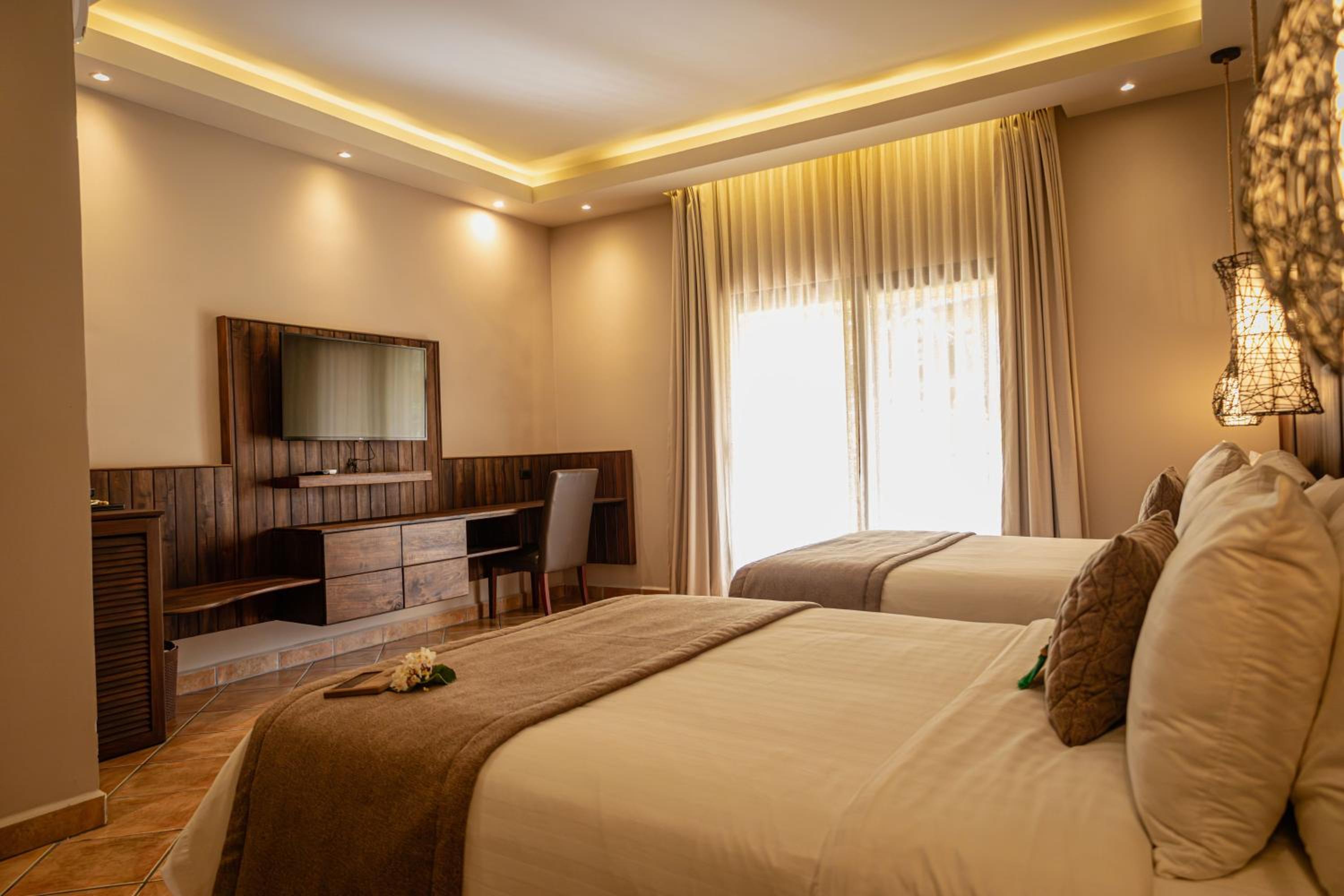 Elegant Rooms: Experience spacious rooms with unique rock walls, vaulted ceilings, and modern amenities like a flat-screen TV and DVD player.