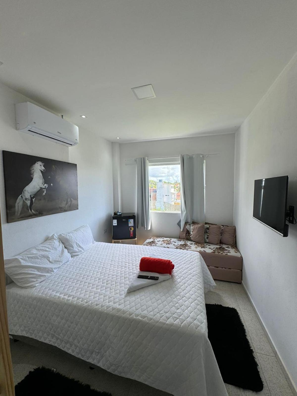 O quarto é confortável, a pousada tem estacionamento, café da manhã e uma área com piscina bem agradável.