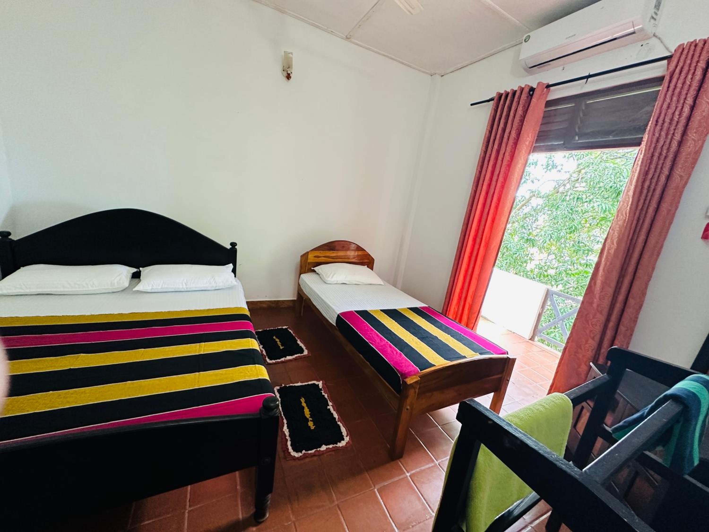 Relax in air-conditioned rooms featuring cozy beds, private bathrooms, and essential amenities for a pleasant stay.